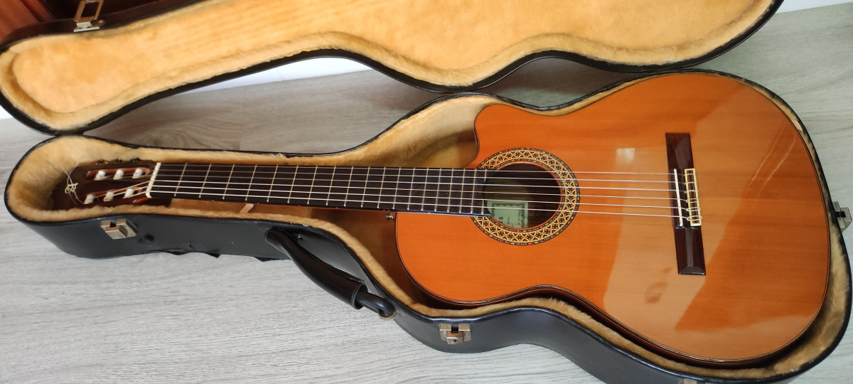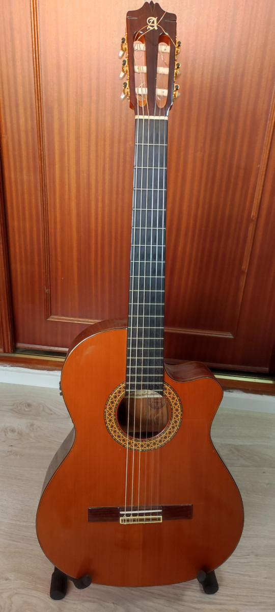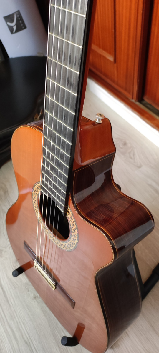 Guitarra clásica electrificada ALHAMBRA 5P CW (caja ancha de 95mm) E2, con cutaway. Previo con eq Fishman Prefix Pro Blend. Tapa: Cedro macizo. Aros y fondo: Palosanto de India. Mango: Samanguila, reforzado con ébano. Diapasón: Ébano. Clavijeros: Golden A. Con goleador en tapa y estuche rígido.