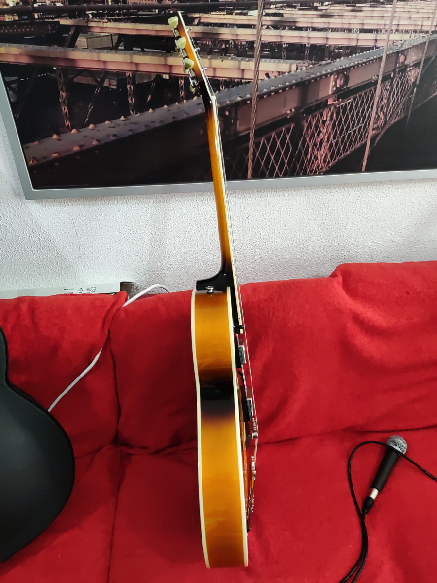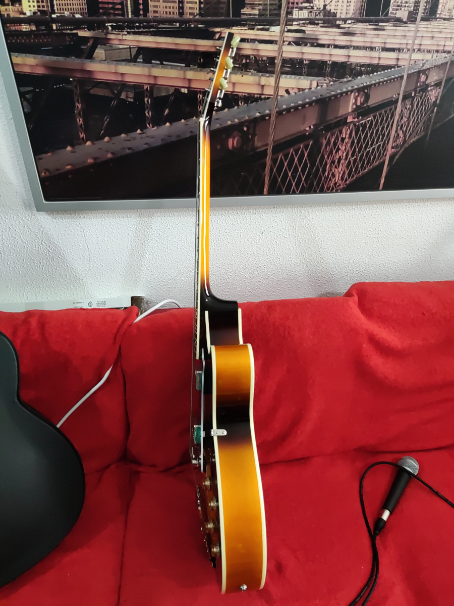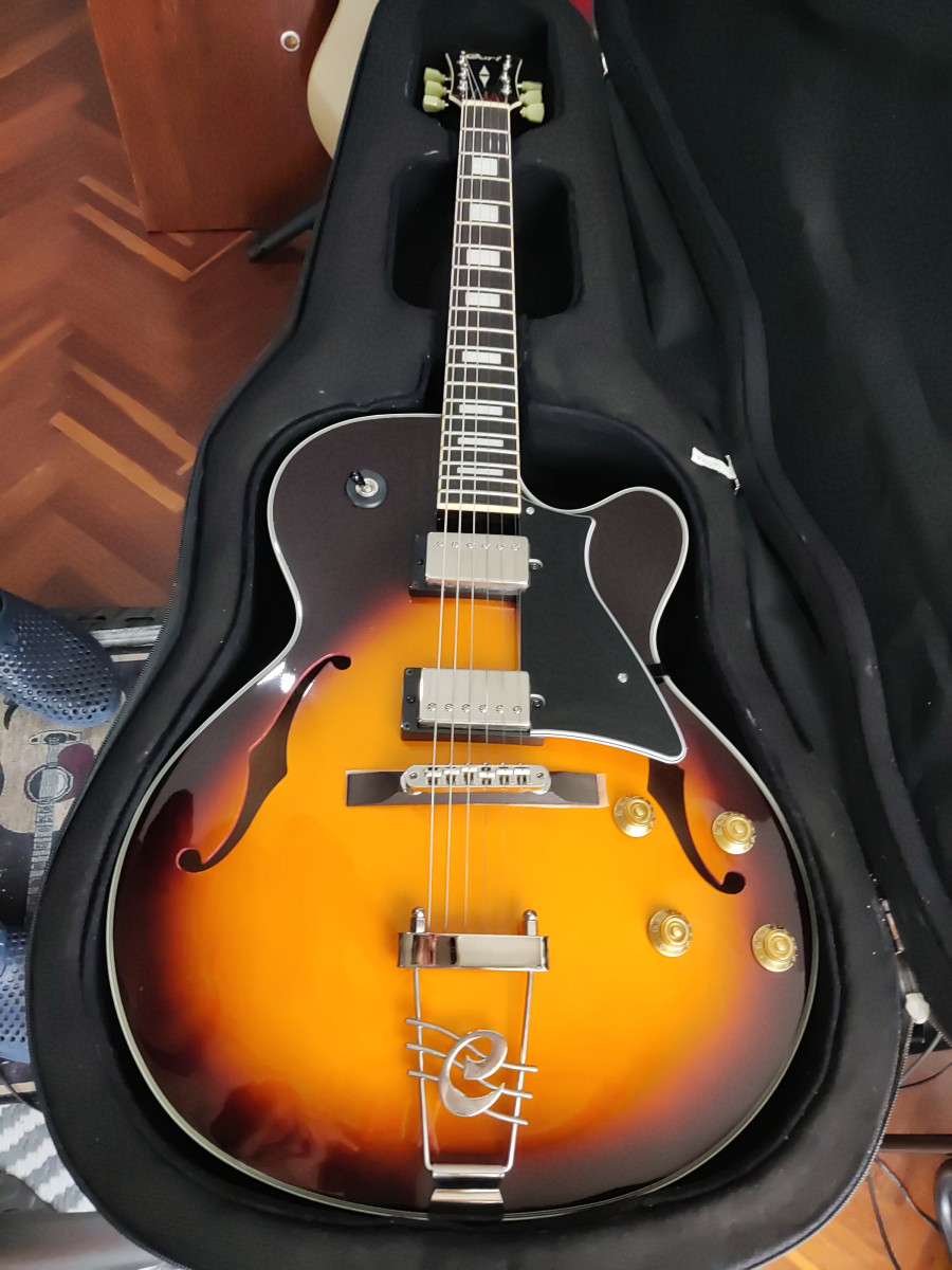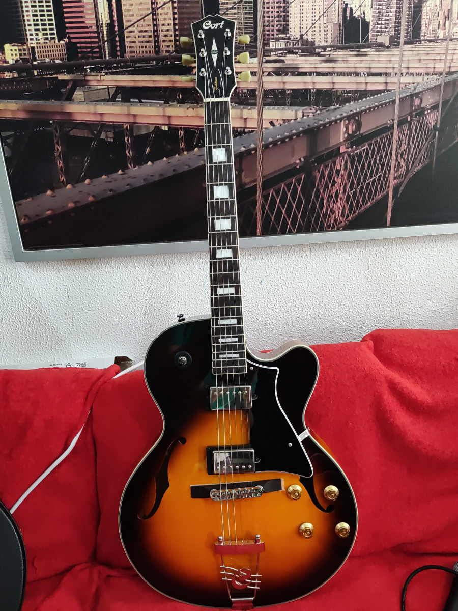 Buenos días compañeros. Vendo Guitarra eléctrica Cort Yorktown TAB, en estado nuevo, sólo utilizada 2 veces en Estudio. Guitarra muy cómoda a la que le sacas un buen sonido de jazz, cálido , gordo y vintage con la pastilla de mástil y que responde bastante bien con saturación en la pastilla de puente. Buenos acabados y relación calidad/precio inmejorable. Características: guitarra Hollow Body con cutaway. Tapa de Abeto. Aros y fondo de arce. Mástil set neck de arce canadiense. Diapasón de palo rosa. 20 trastes. Escala 24.75". Clavijero Vintage. Puente y cordal T.O.M.. Pastillas CLassicRocker II. Configuración H-H. Cromados Niquelados. Acabado Tabacco Burst.