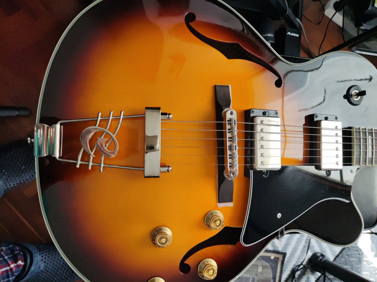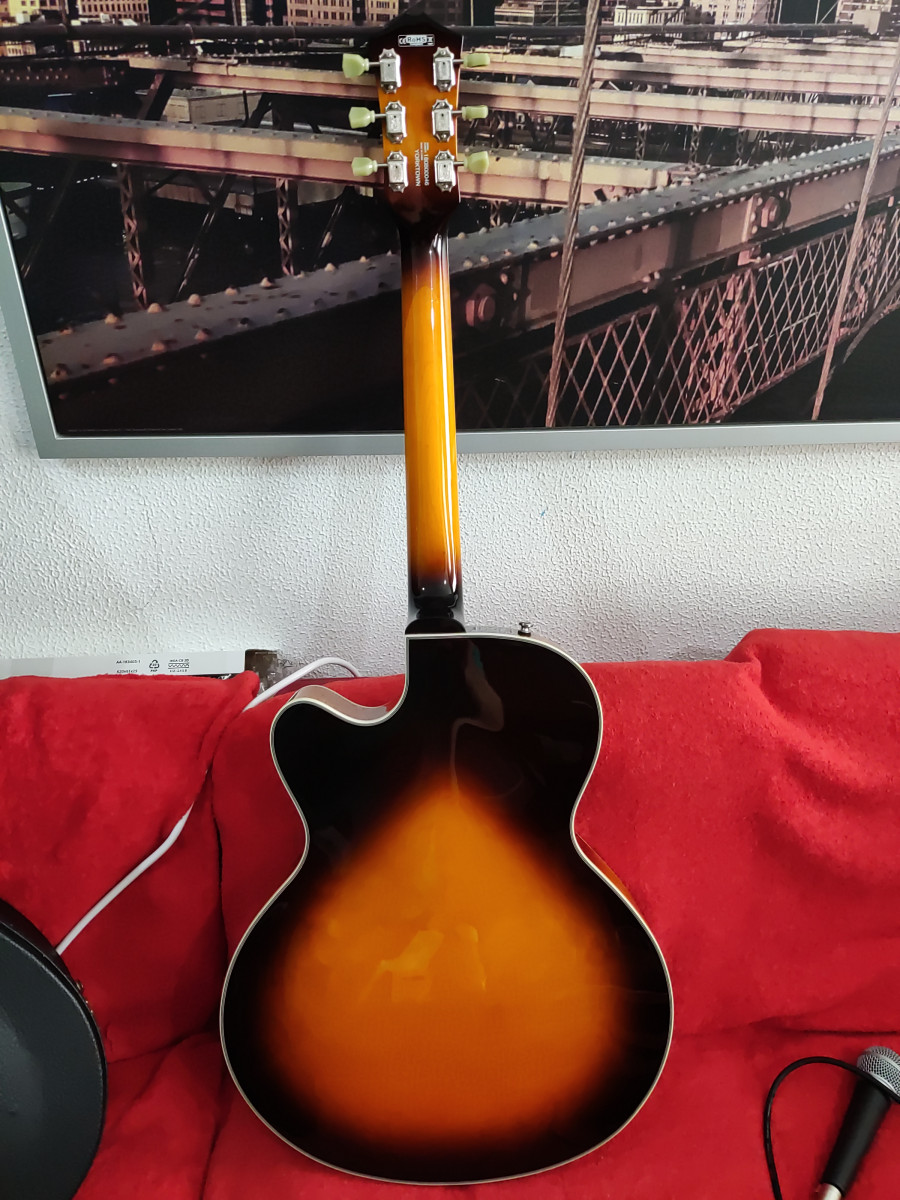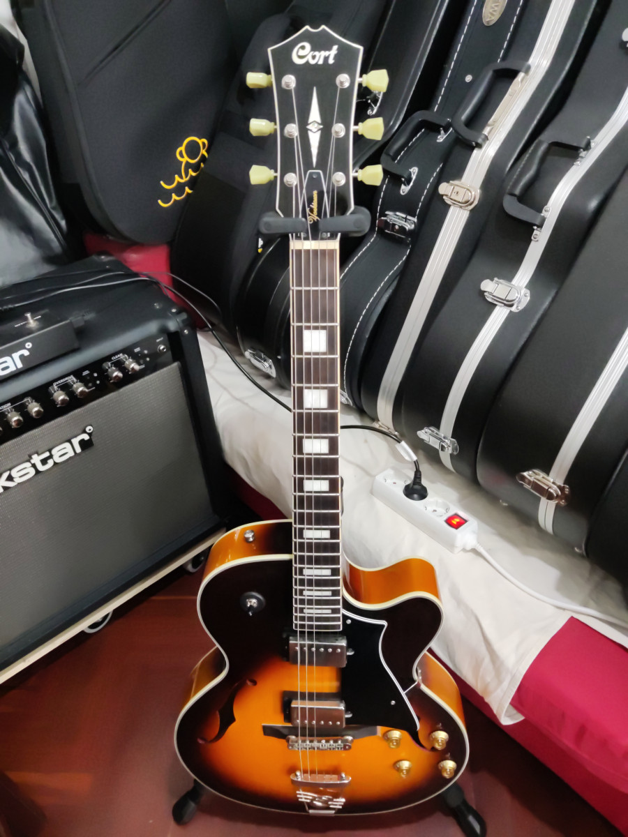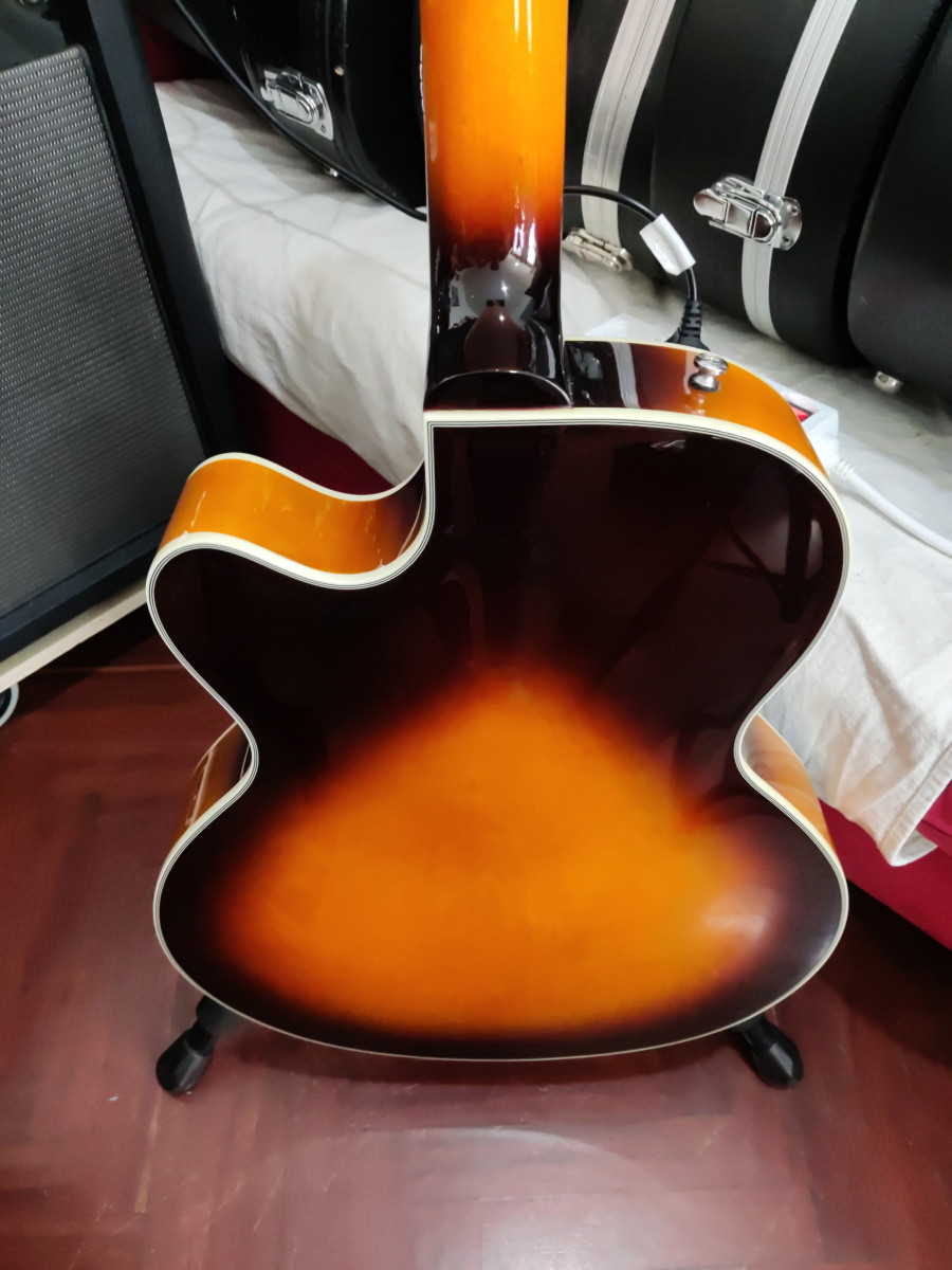 Buenos días compañeros. Vendo Guitarra eléctrica Cort Yorktown TAB, en estado nuevo, sólo utilizada 2 veces en Estudio. Guitarra muy cómoda a la que le sacas un buen sonido de jazz, cálido , gordo y vintage con la pastilla de mástil y que responde bastante bien con saturación en la pastilla de puente. Buenos acabados y relación calidad/precio inmejorable. Características: guitarra Hollow Body con cutaway. Tapa de Abeto. Aros y fondo de arce. Mástil set neck de arce canadiense. Diapasón de palo rosa. 20 trastes. Escala 24.75". Clavijero Vintage. Puente y cordal T.O.M.. Pastillas CLassicRocker II. Configuración H-H. Cromados Niquelados. Acabado Tabacco Burst.