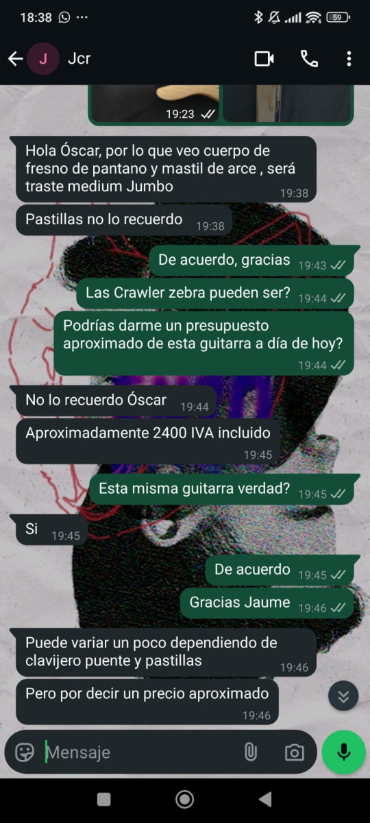 Cuerpo de fresno de pantano, golpeador de eucalipto asado y mastil de arce. Trastes medium jumbo. Pastillas crawler zebra.