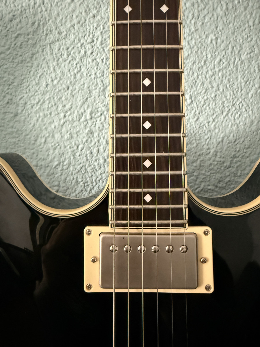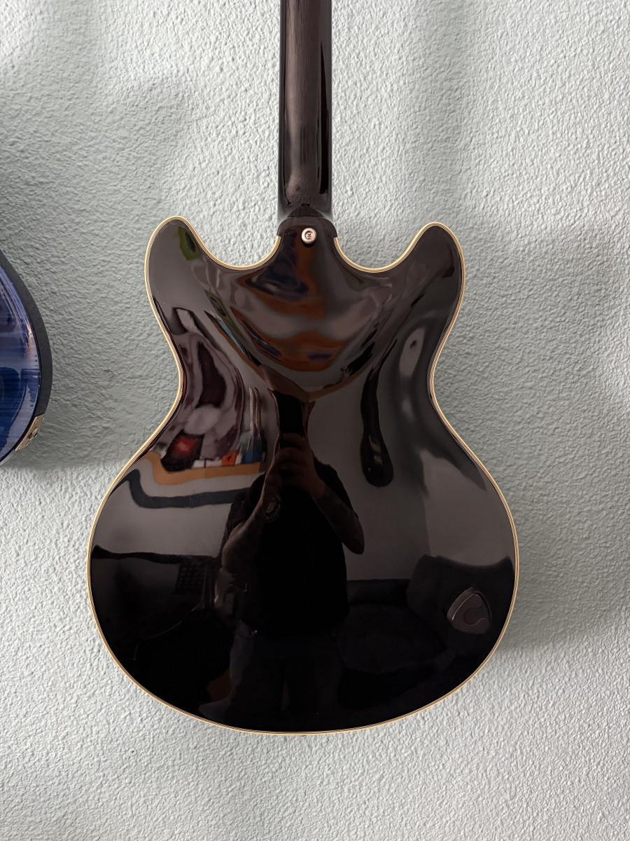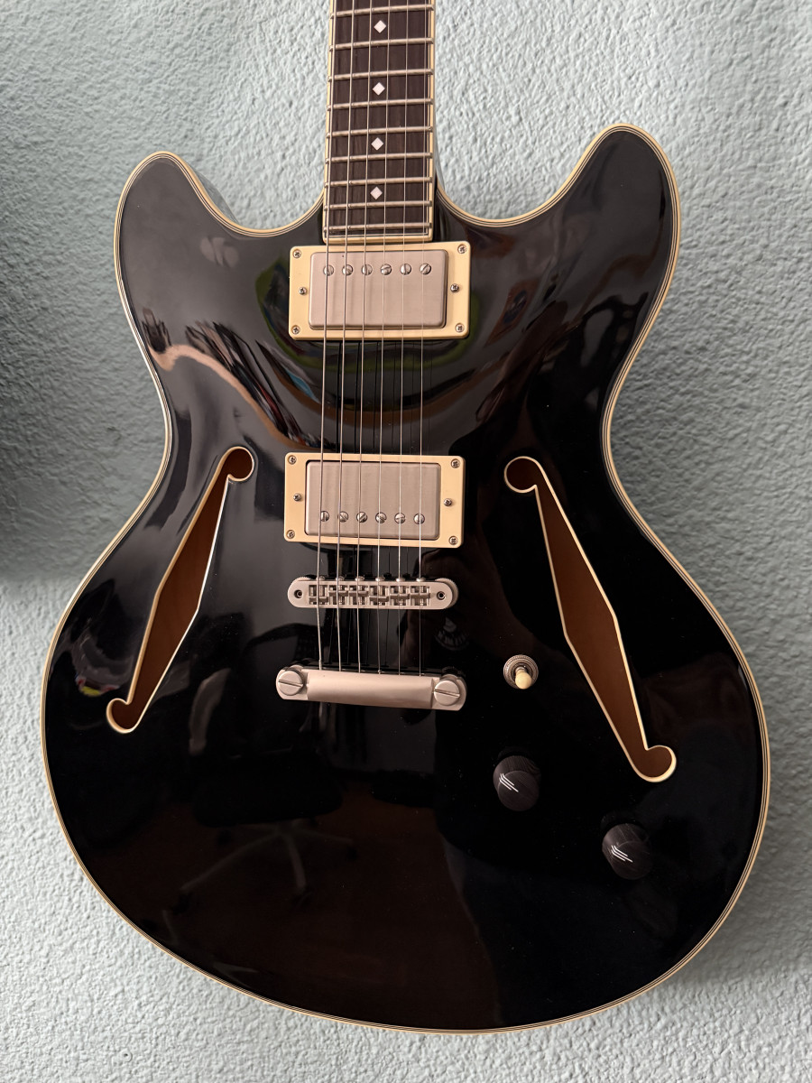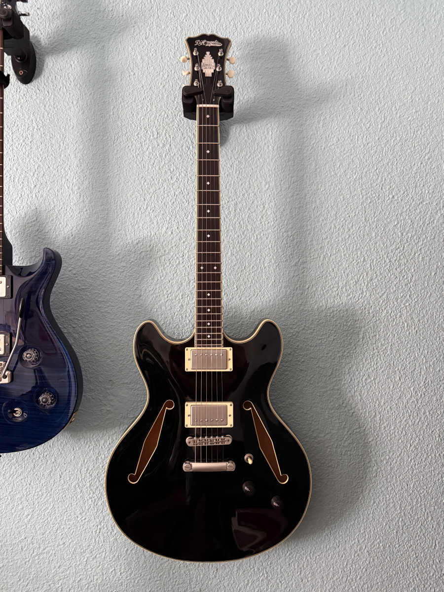 Preciosa guitarra eléctrica D’Angelico de semicaja, en acabado negro. Se encuentra en excelentes condiciones.