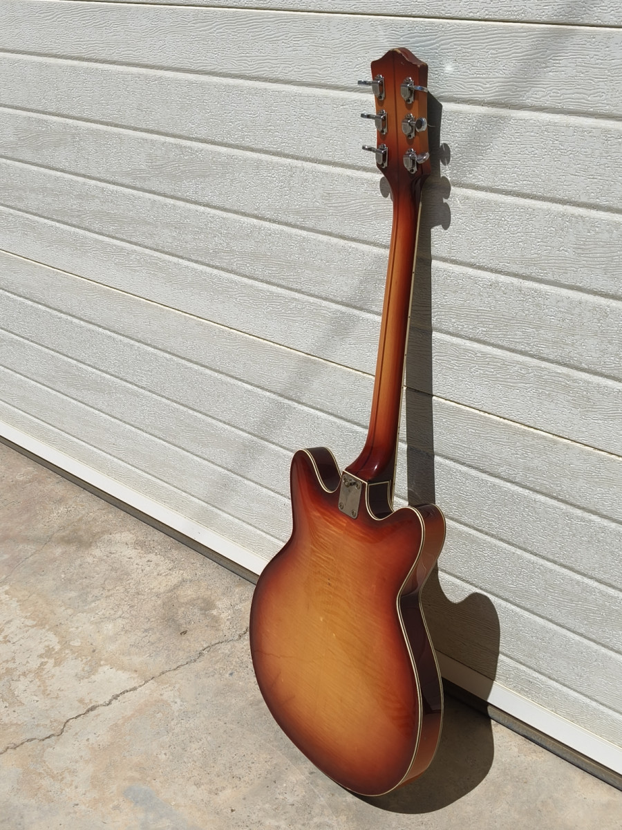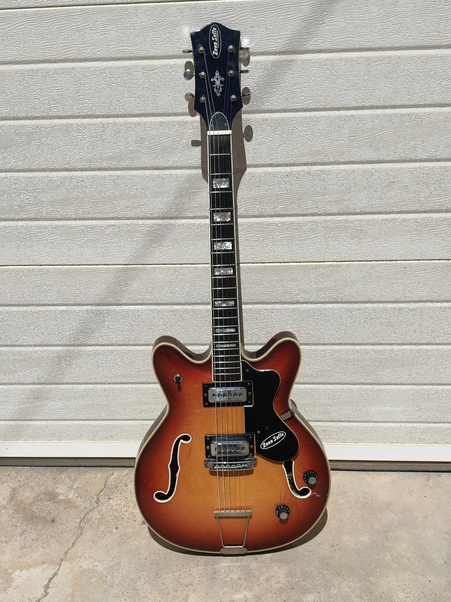 Hola vendo una guitarra de caja Zerosette de 1966 modelo Sad 2v en sunburst. La guitarra es como una gibson 330 y se encuentra en un estado 8.5 de 10.perfecta para tocar y suena genial