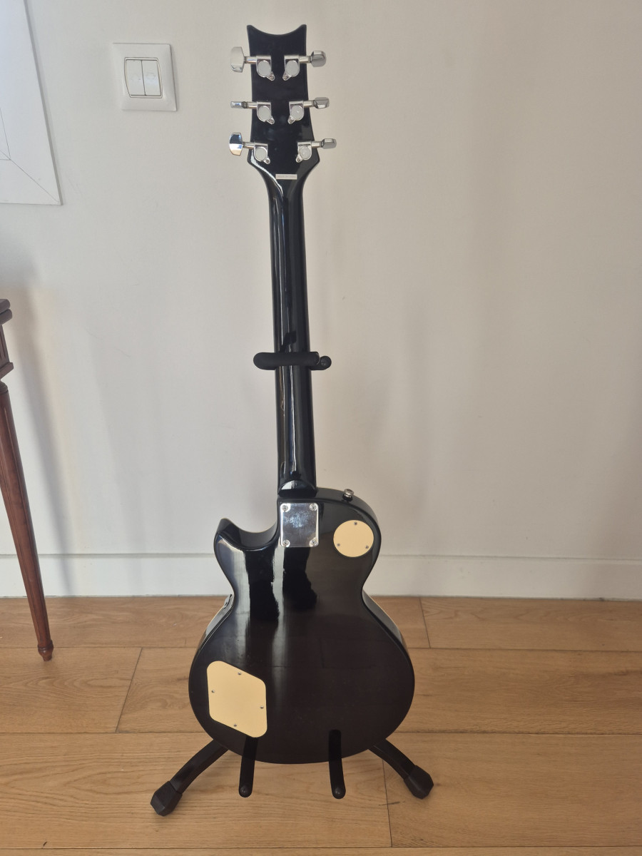 Cuerpo macizo, diapasón Palosanto, color negro brillo, made in China, incluye funda de tela marca EK.