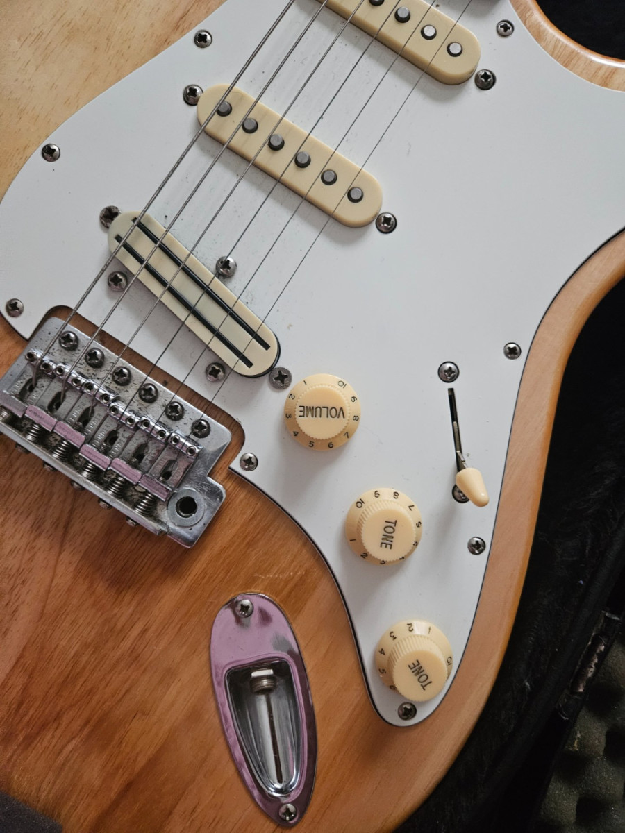 Guitarra eléctrica Fender Stratocaster con acabado natural, mexicana.