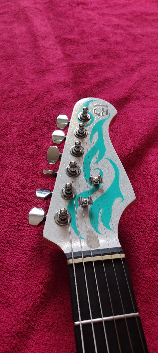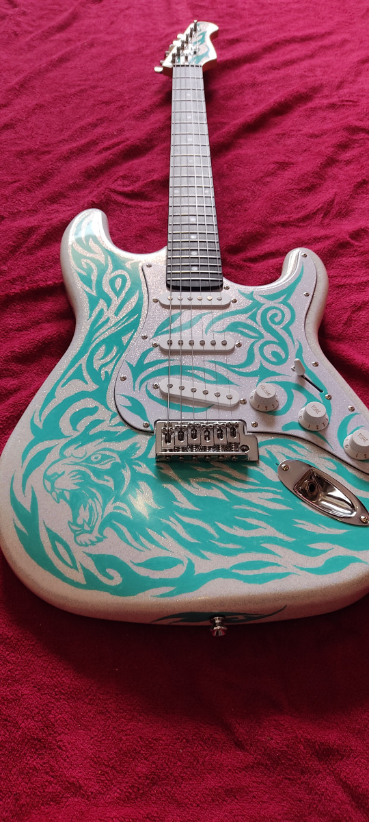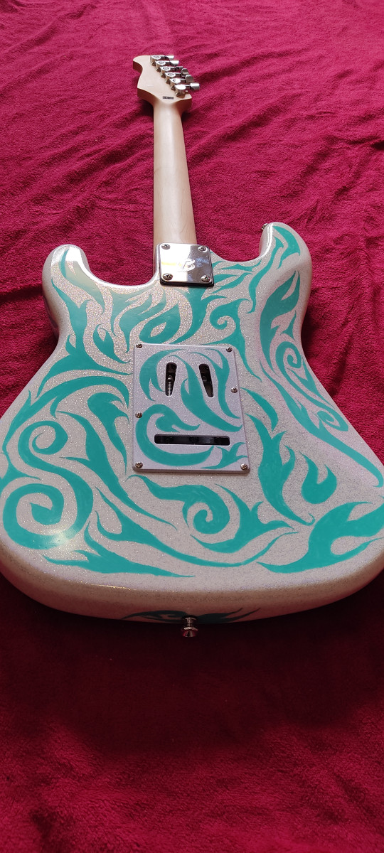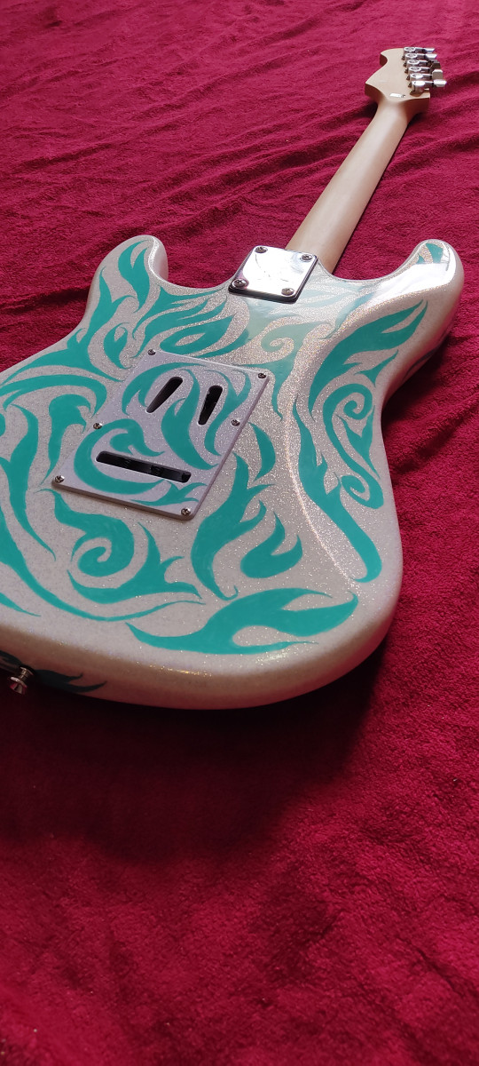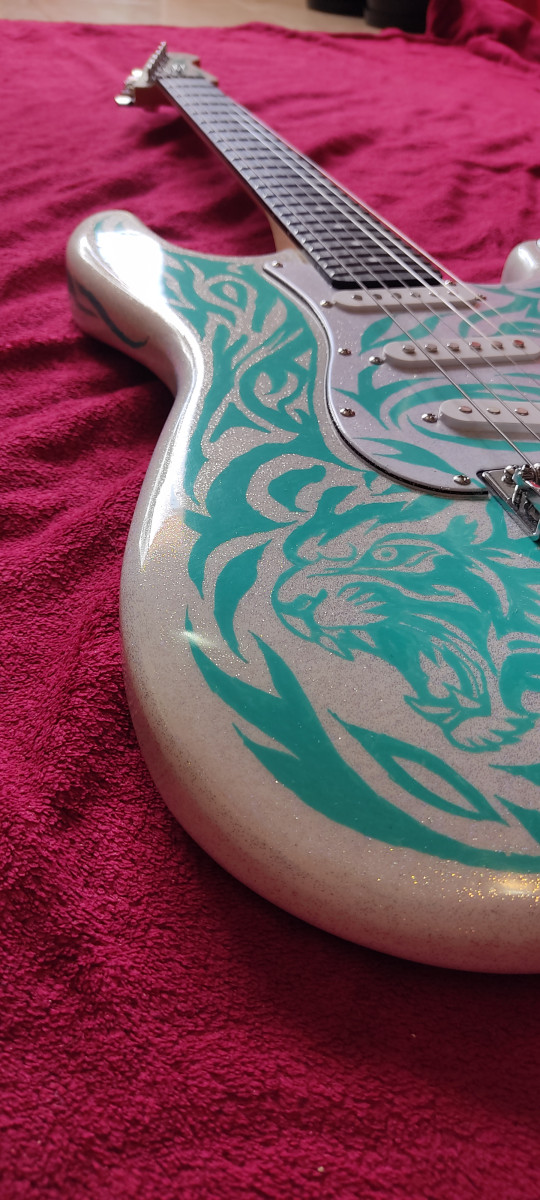 La base sobre la que hemos trabajado es una Harley Benton ST20, aplicándole base sparkle holográfico, diseño tribal en turquesa por todo el cuerpo, como siempre hecho a mano y barnizado en brillo para un acabado resistente y duradero.