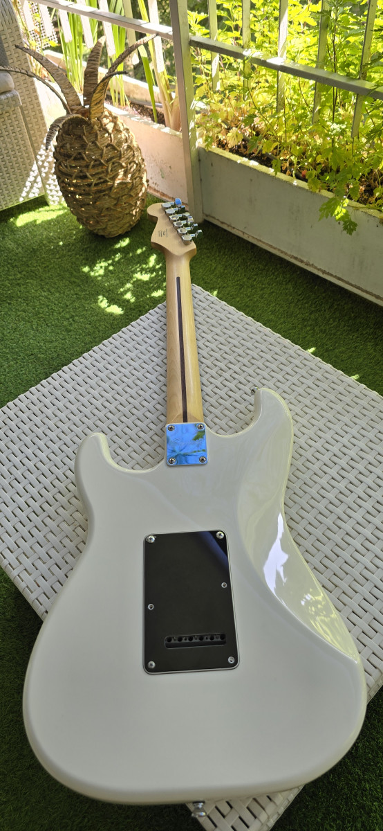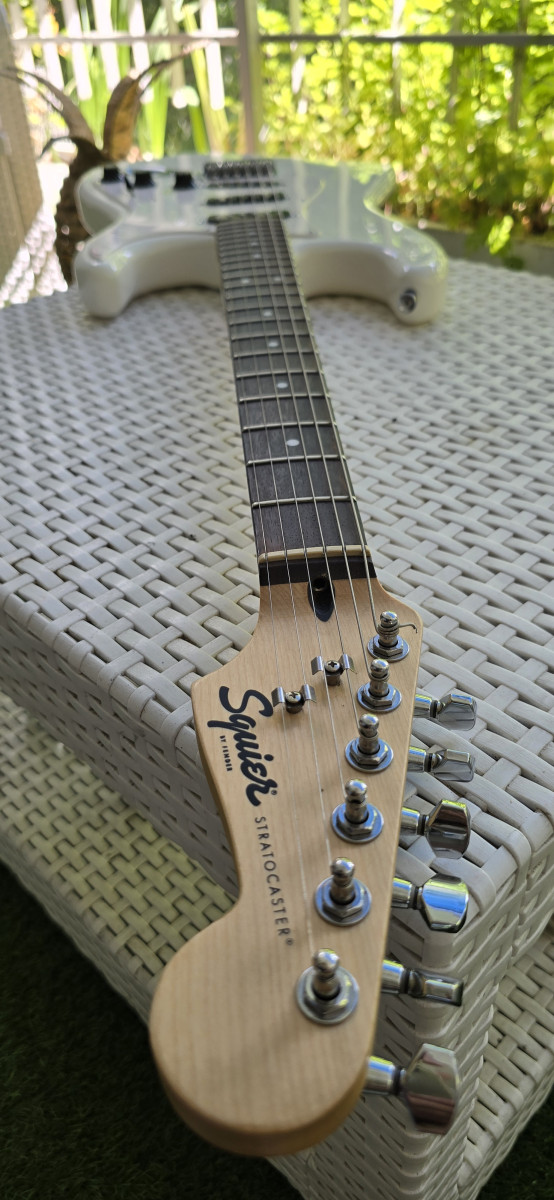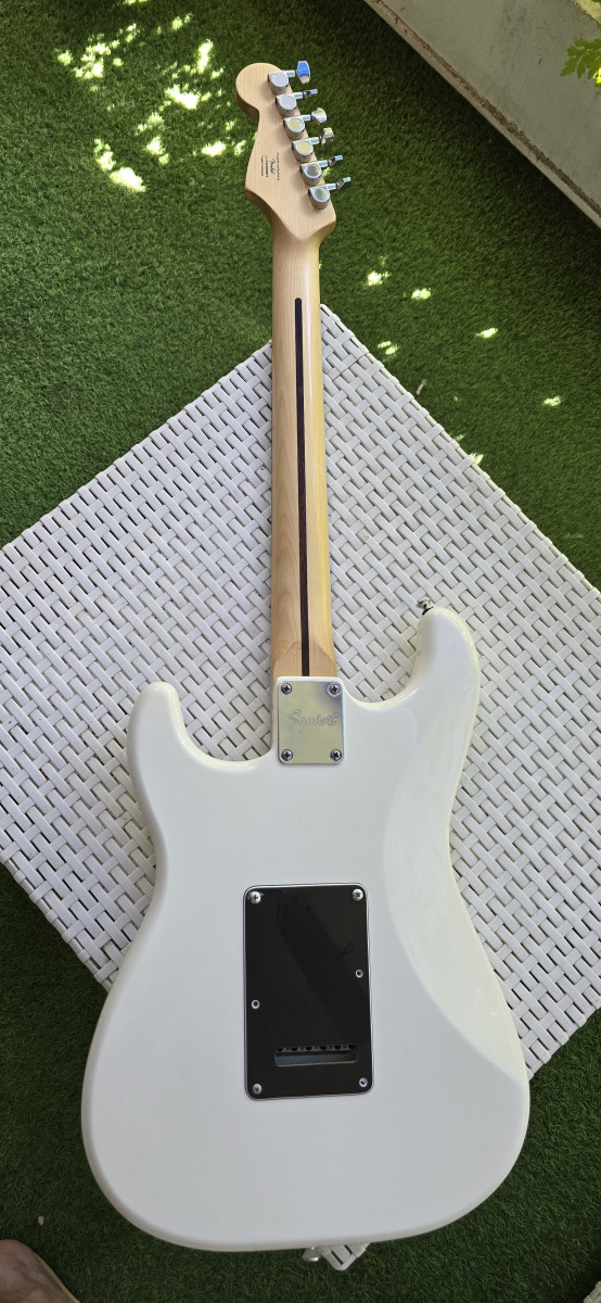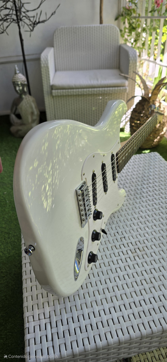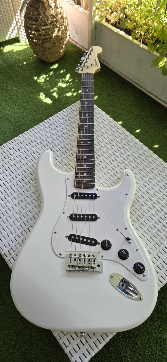 Guitarra eléctrica Squier by Fender, en color blanco. Está en muy buen estado y lista para tocar. Es el modelo Bullet; está impoluta. Solo entrego la guitarra; tiene palanca de trémolo. Más guitarras en mi perfil.