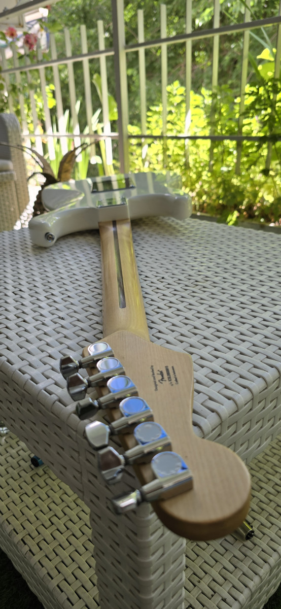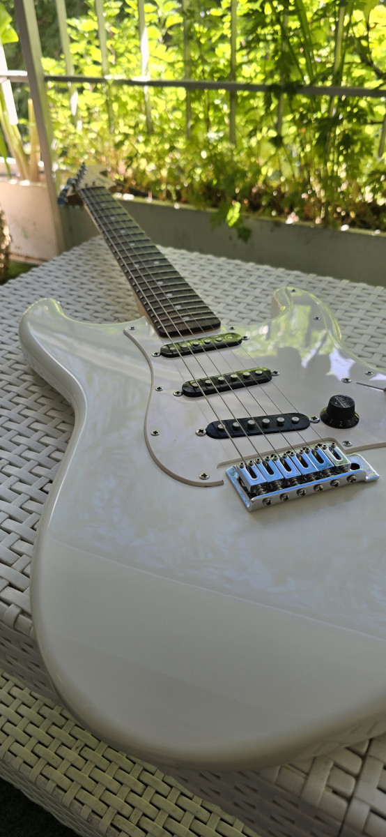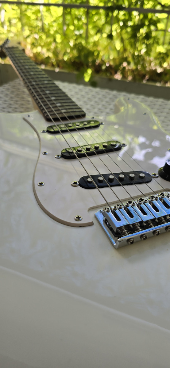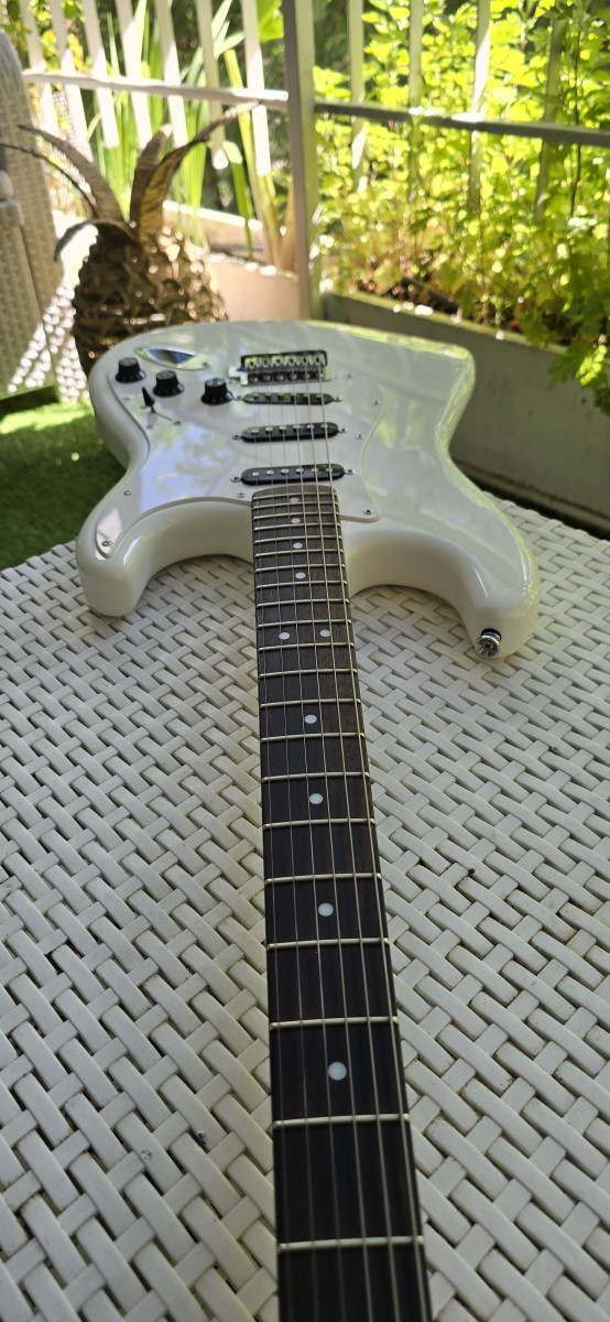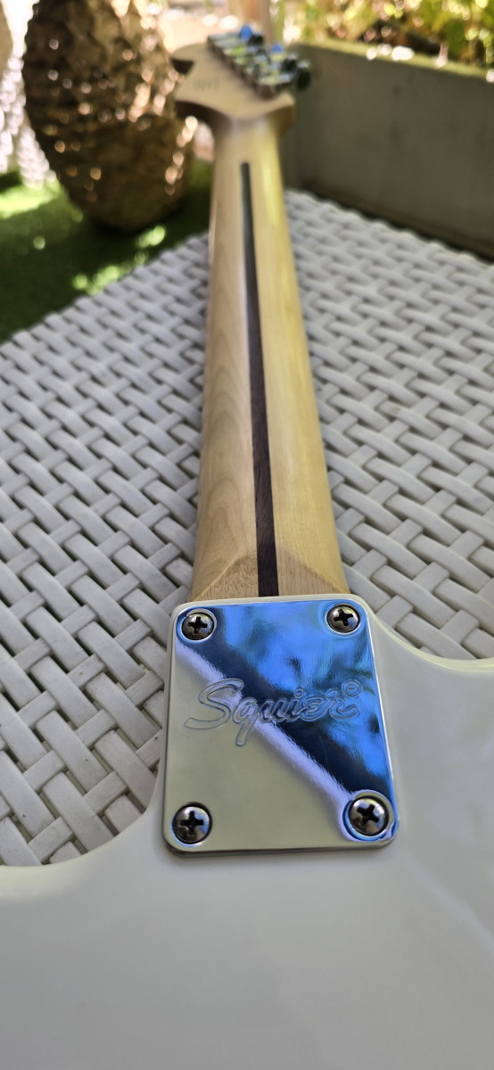 Guitarra eléctrica Squier by Fender, en color blanco. Está en muy buen estado y lista para tocar. Es el modelo Bullet; está impoluta. Solo entrego la guitarra; tiene palanca de trémolo. Más guitarras en mi perfil.