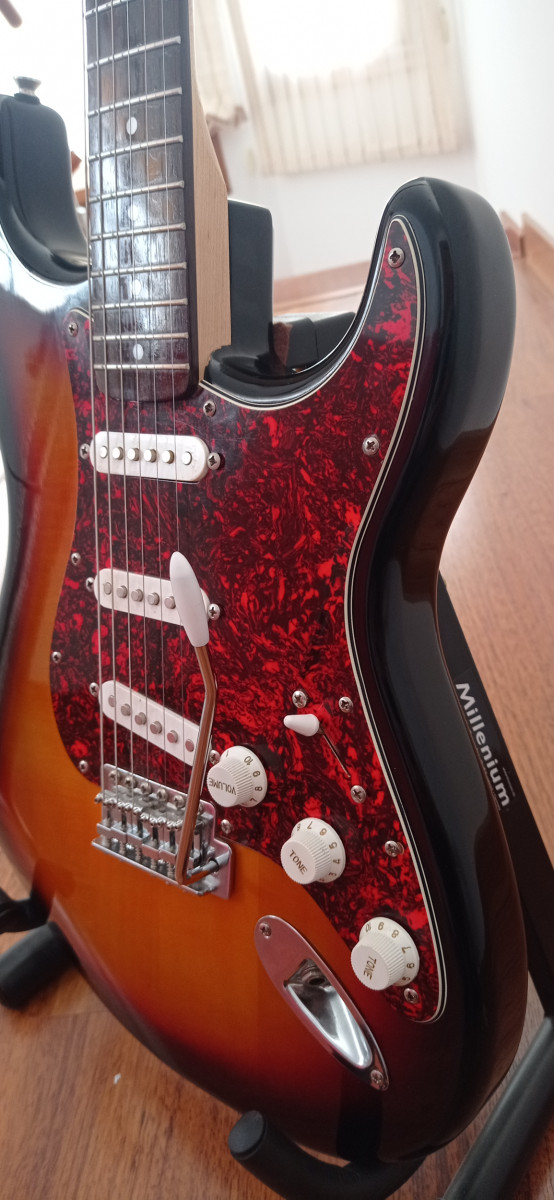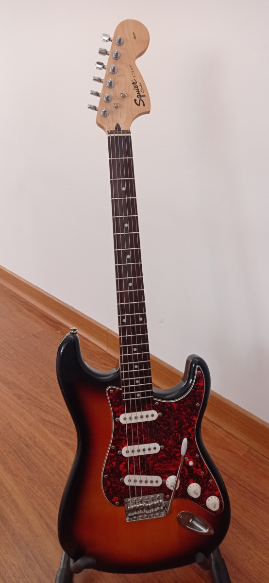 Guitarra eléctrica Squier Stratocaster de la serie Affinity con acabado Sunburst vintage en buen estado y condiciones, sin apenas señales de uso. Perfecta como guitarra de iniciación, comoda y que responde, o como segunda guitarra. Posible incluir amplificador de 10 watios con incremento de 20€. Más fotos e información por WhatsApp. Hago envío o entrega en mano en Iniesta, Albacete, Valencia.