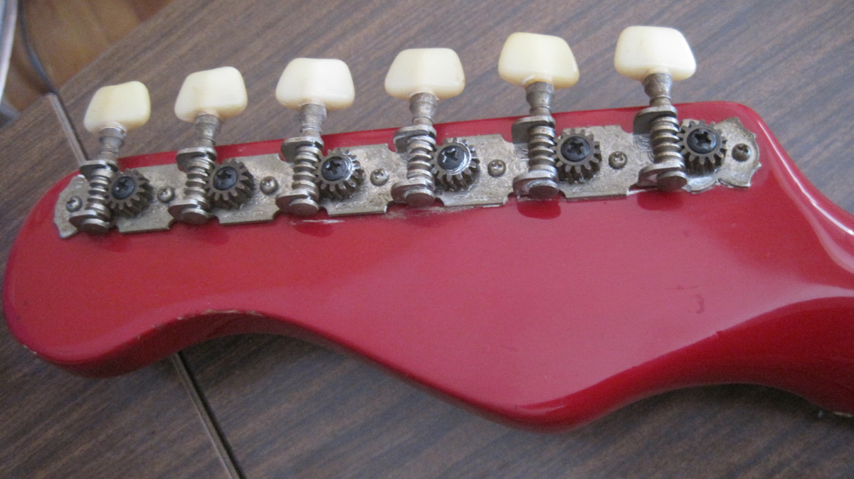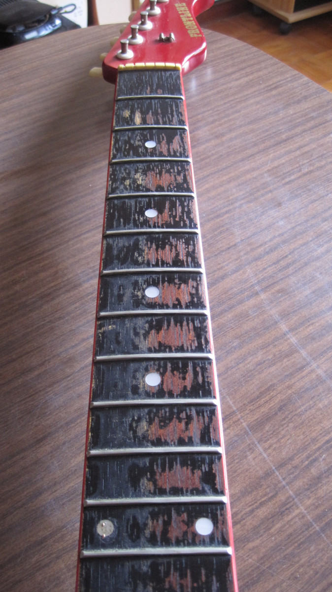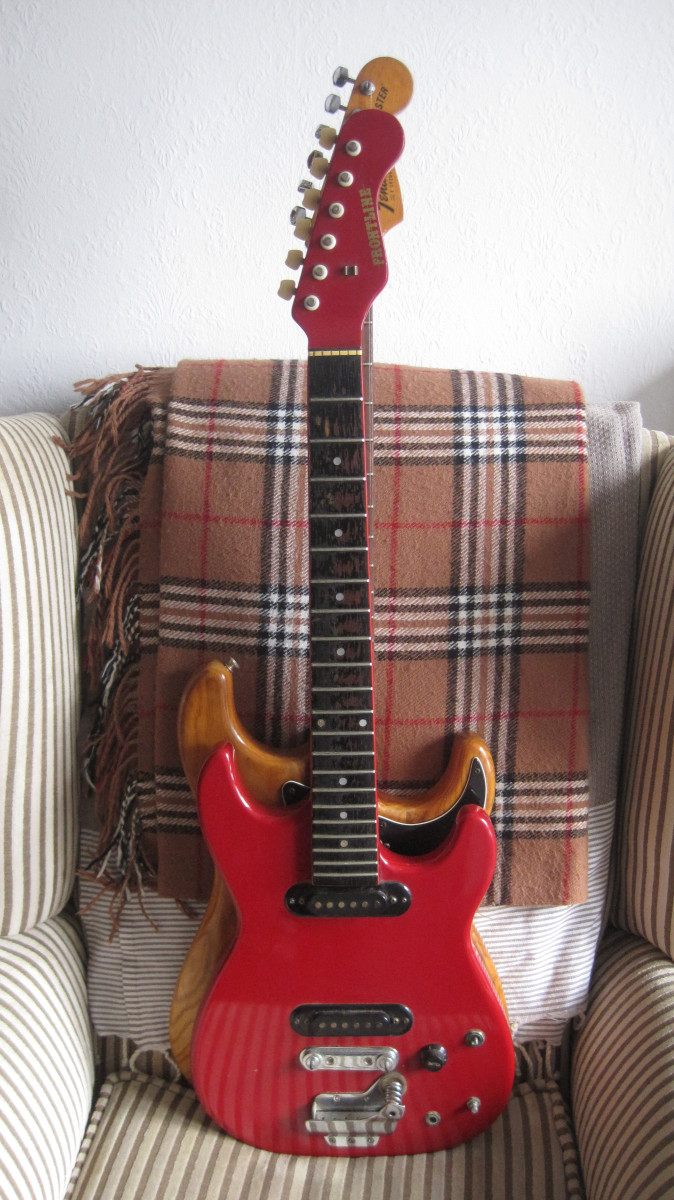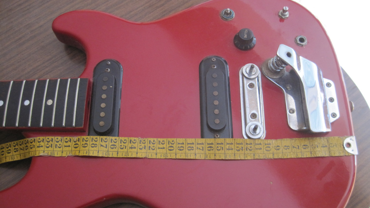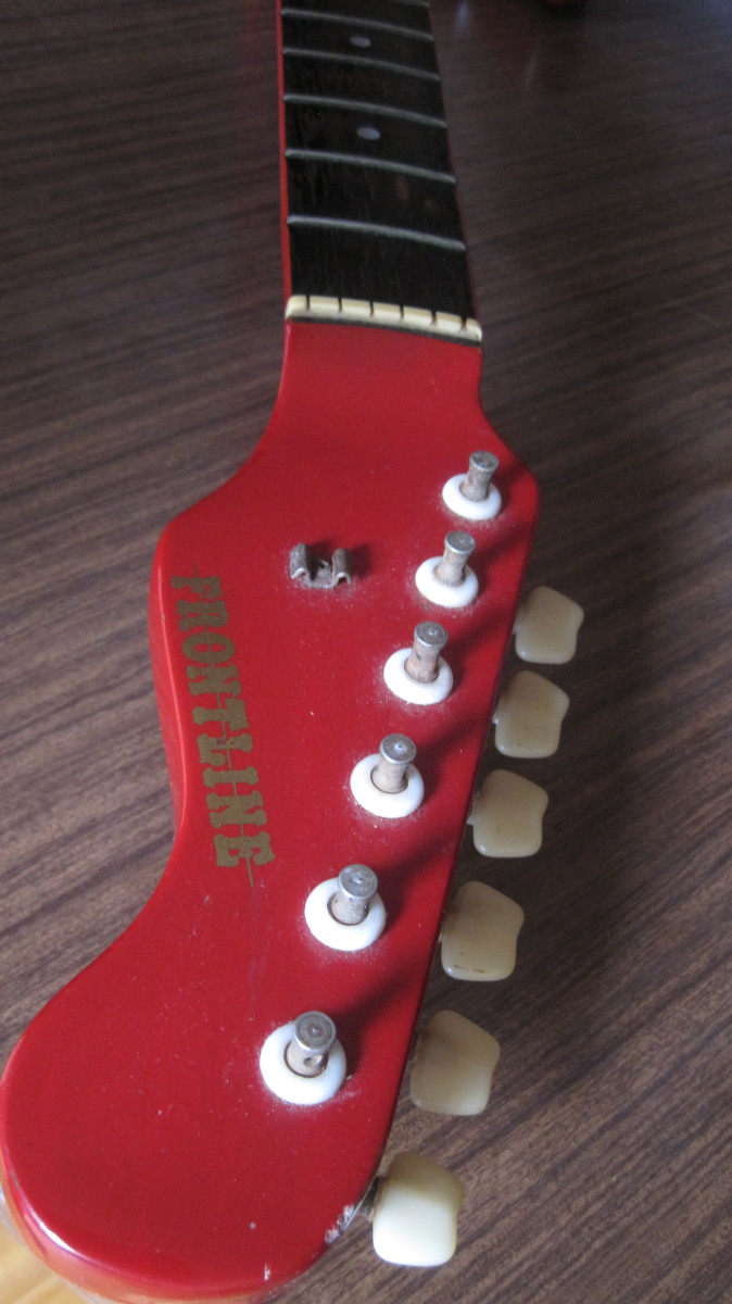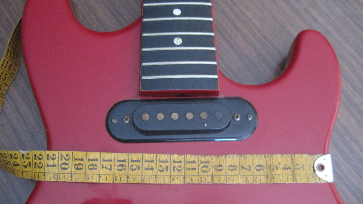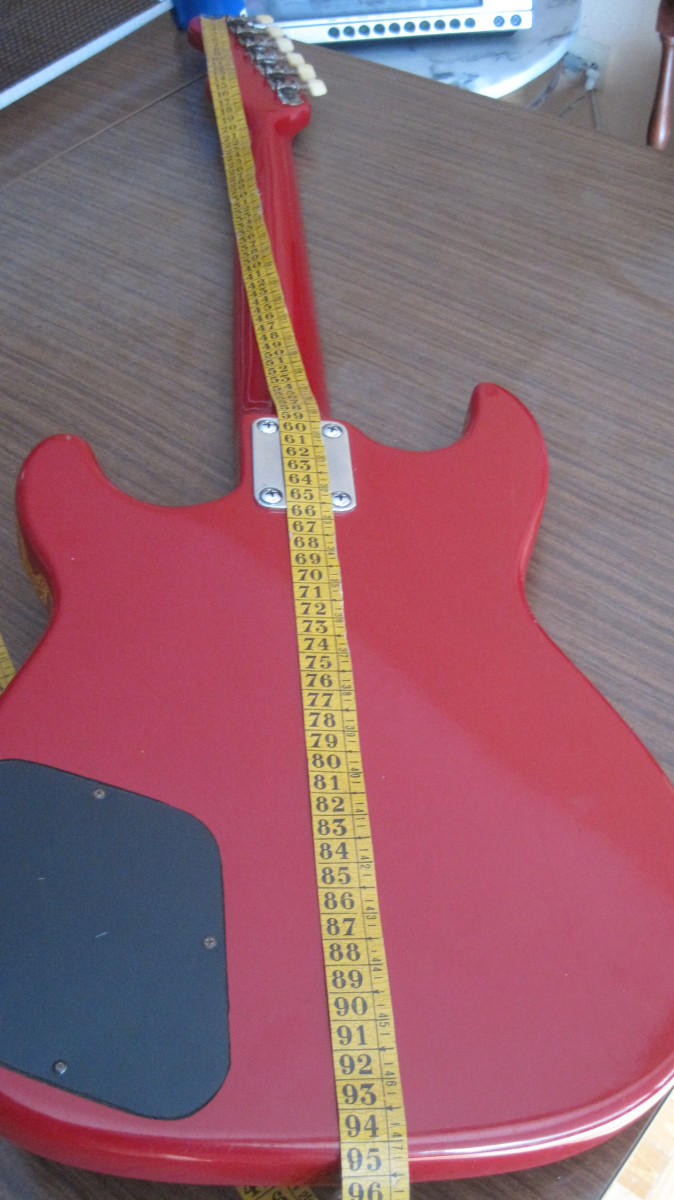 Guitarra hecha en Korea en los años 70 / 80, he visto poca información sobre ella. Le falta el puente y la palanca del tremolo. Las pastillas y la electrónia funcionan. El mástil es de escala normal pero el cuerpo es de tamaño algo reducido, le he hecho fotos con cinta métrica para referencia y también delante de una stratocaster. Acepto cambios por pedales o pastillas de mi interés.