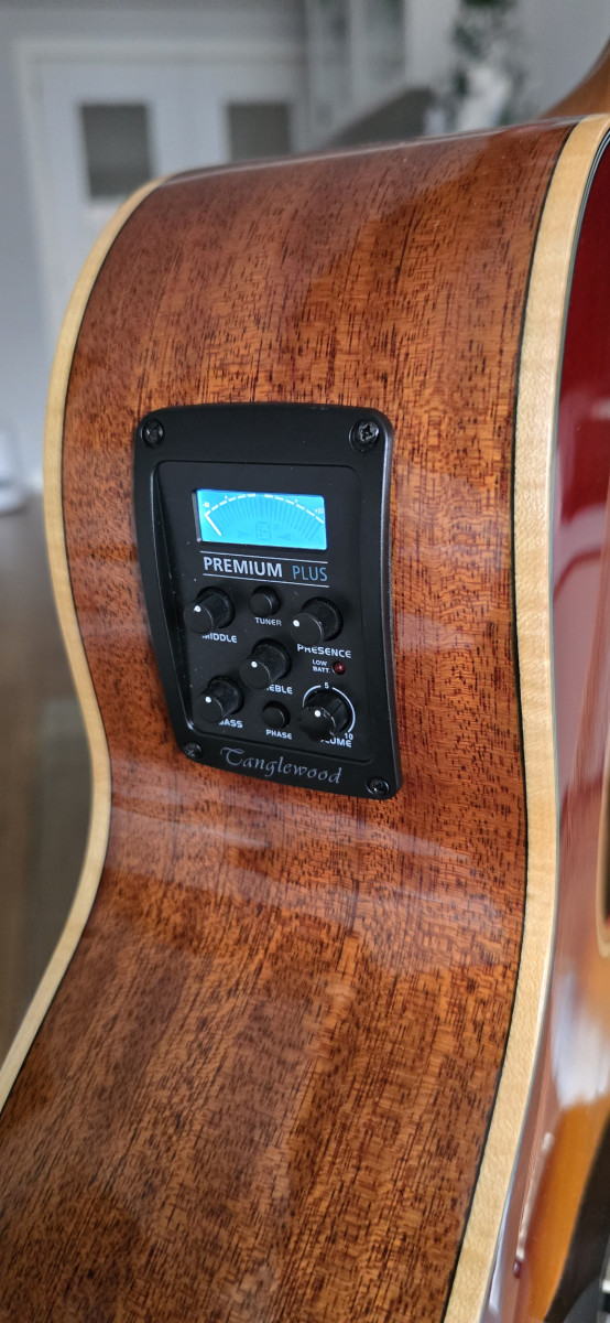 Guitarra Electroacústica Tanglewood La guitarra esta en un estado impoluto es electroacústica monta un previo con afinador incluido y varios modos de sonido guitarra súper cómoda por su cuerpo un poco mas pequeño y además con Cutway que hace más cómodo llegar a los últimos trastes .Guitarra que te sorprenderá por su gran sonido y comodidad más guitarras en mi perfil