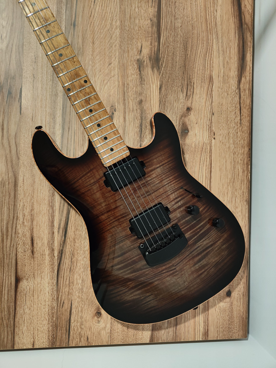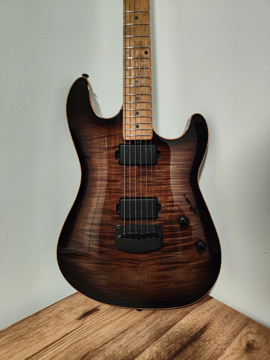 Guitarra de gama alta que ofrece un sonido de calidad y versátil. El cuerpo cuenta con una hermosa tapa de arce flameado ligeramente arqueada y un resonante cuerpo de okume. Las posiciones humbucker (1,3,5) ofrecen cuerpo y agresividad, en cambio, las posiciones single (2,4) ofrecen calidez, sutilidad y brillo. El mástil de arce tostado tiene un grosor medio, quizá ligeramente delgado; es extremadamente cómodo y se ajusta perfectamente a la mano. Viene con un estuche duro de protección máxima especial para este modelo, con la serigrafía de la marca y del modelo.