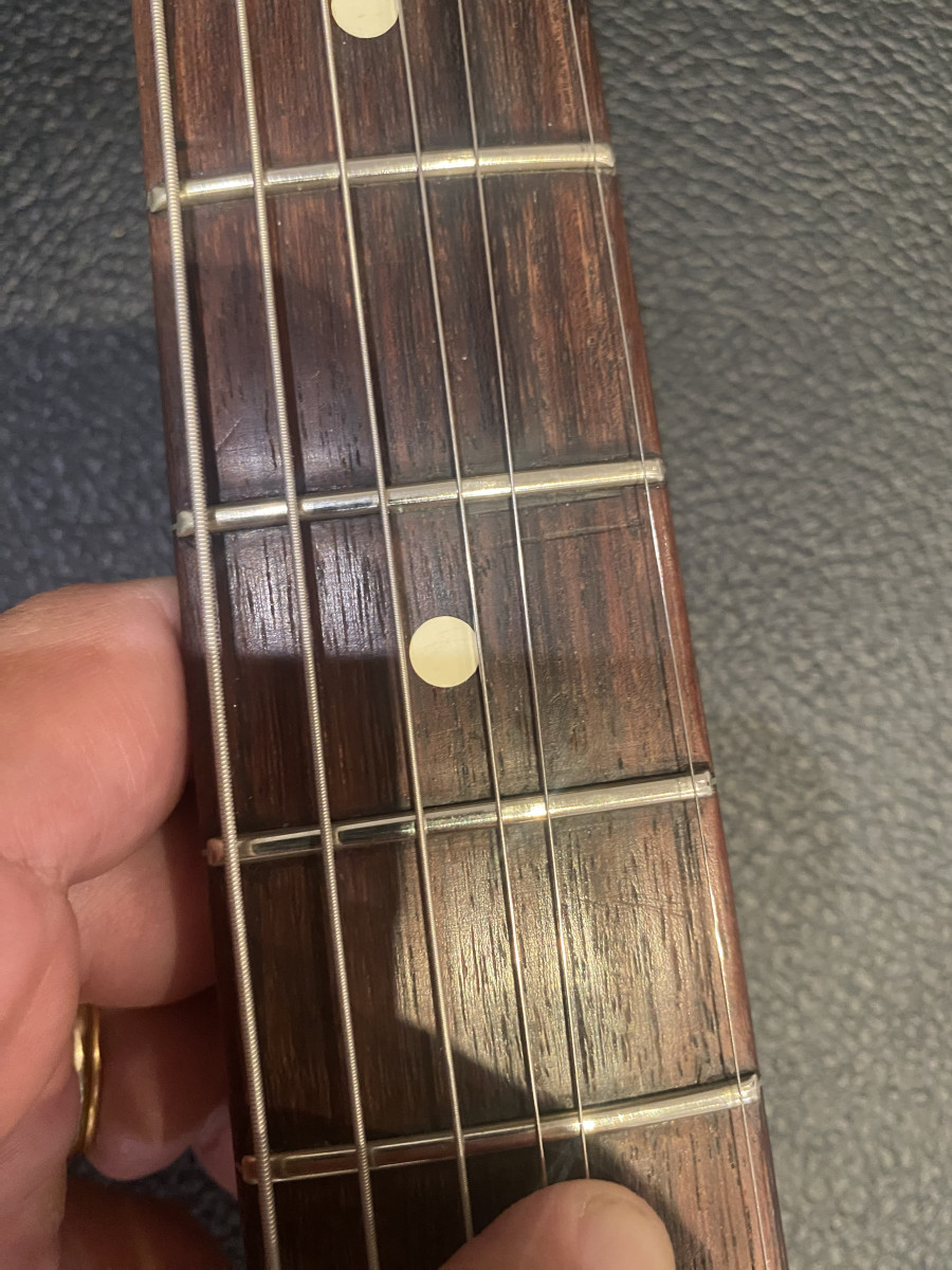 Mastil y trastes estan en perfecto estado, el tema del desgaste estaria en los potes, creo que el del tono , no es original, parece de otro color desgastado, pero no lo puedo asegurar.