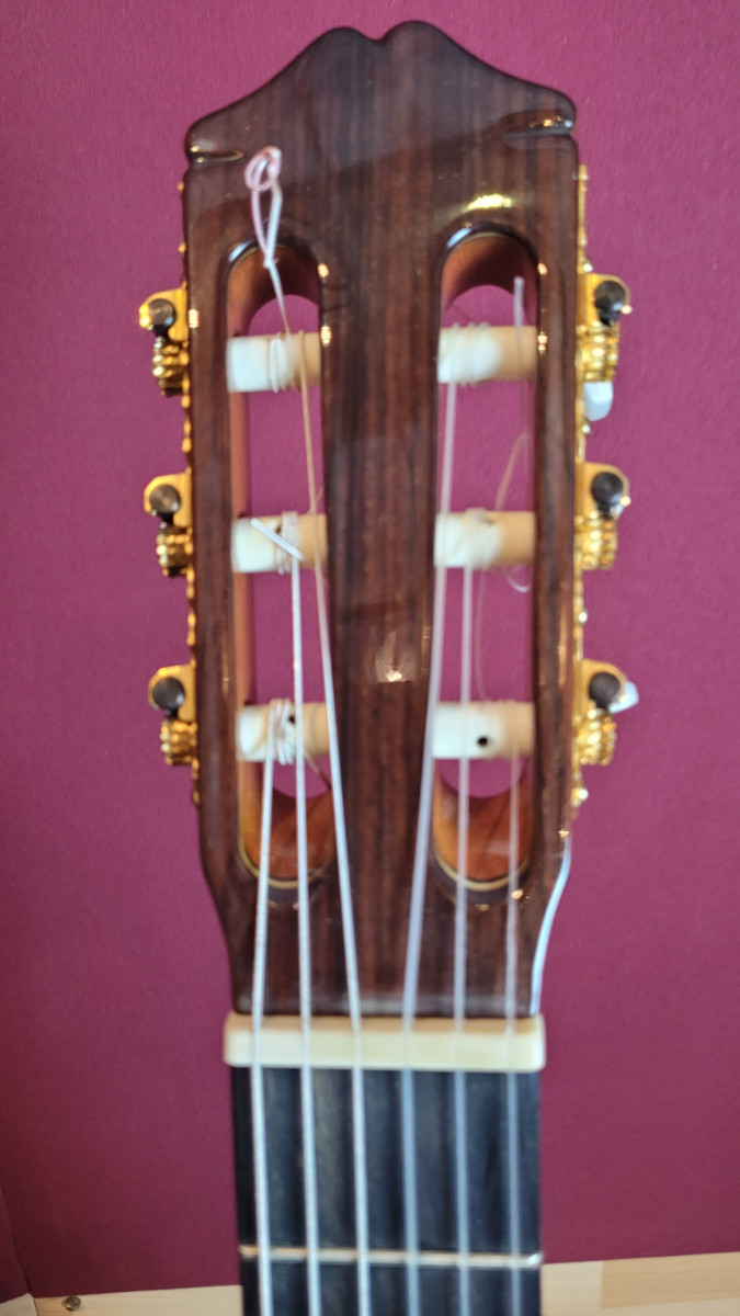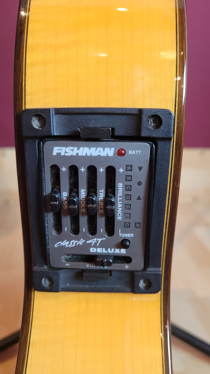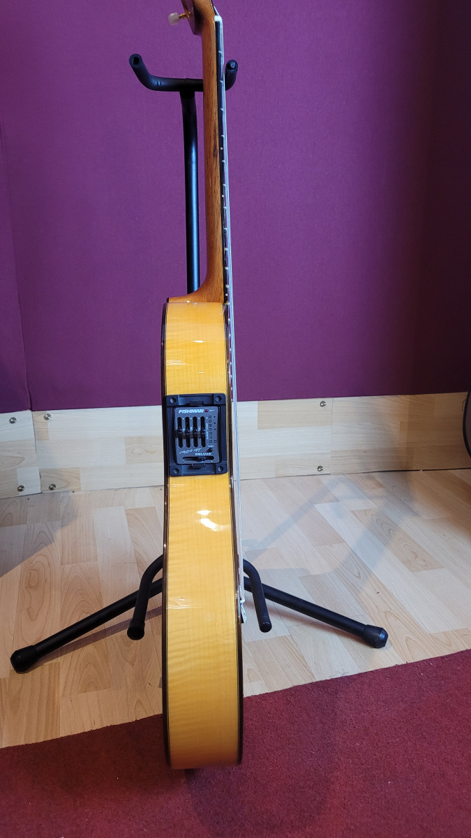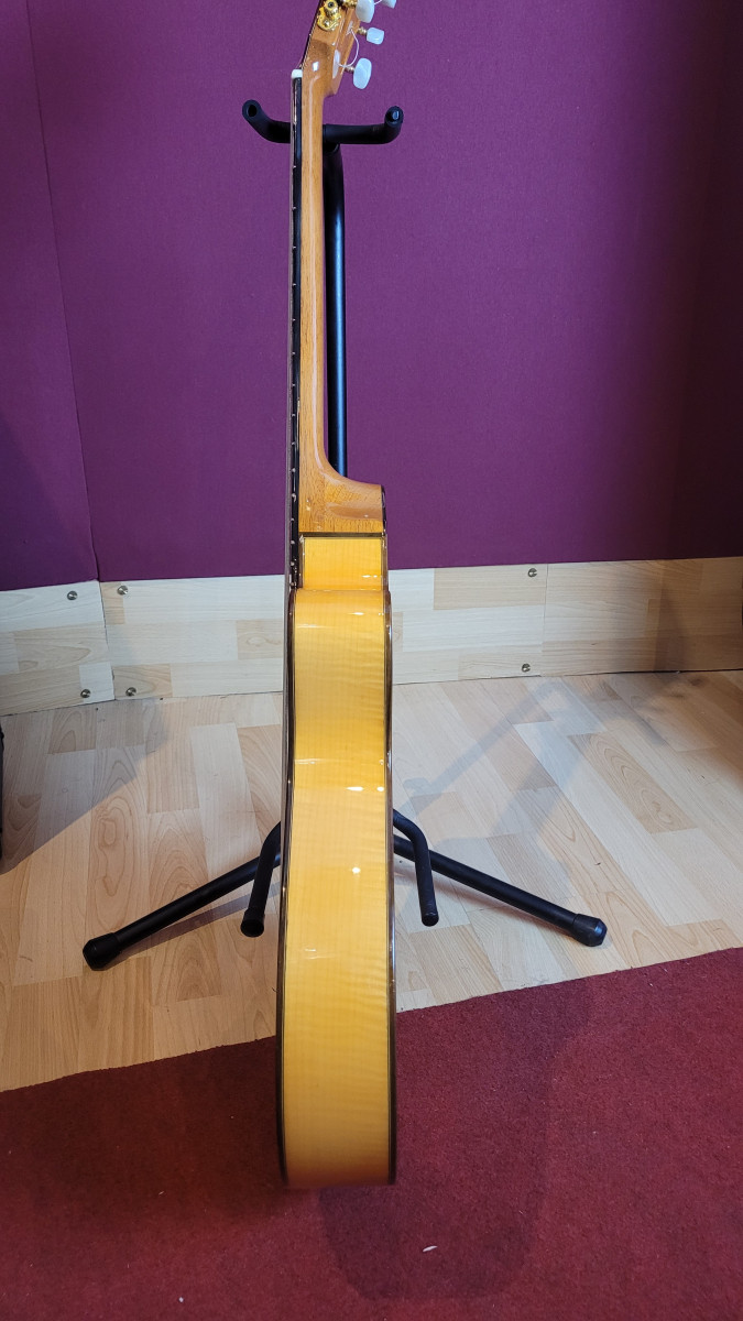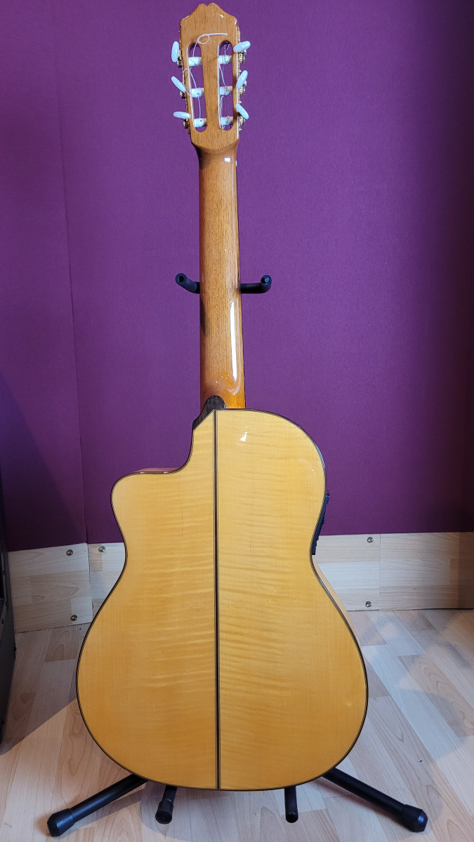 Guitarra flamenca electrificada de gama alta. Como las que usan los Gipsy Kings. Muy buen sonido en acústico a pesar de ser de caja estrecha, pero sobre todo suena de maravilla enchufada. Lo cierto es que estas guitarras están pensadas para eso.
