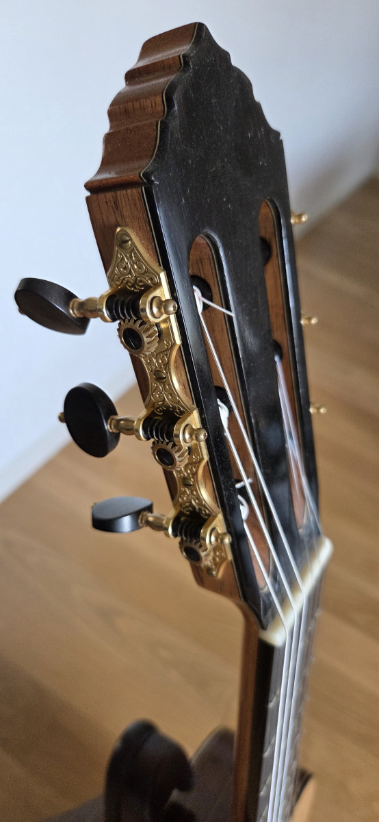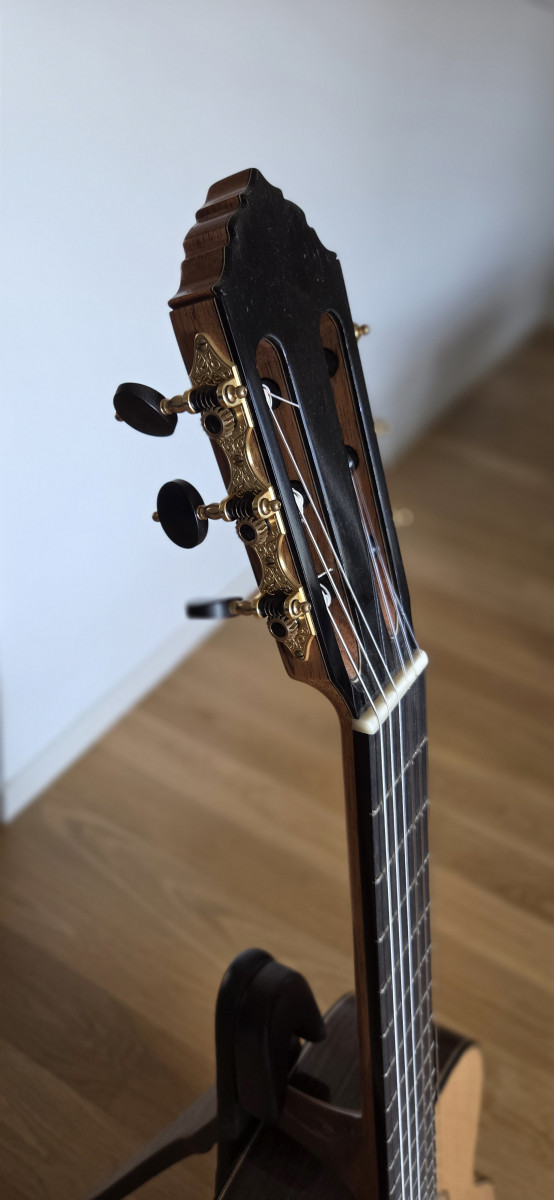Tapa de abeto. Aros y fondo de palisandro de la India. Escala de 650 mm. Clavijeros de Chris Barnett.