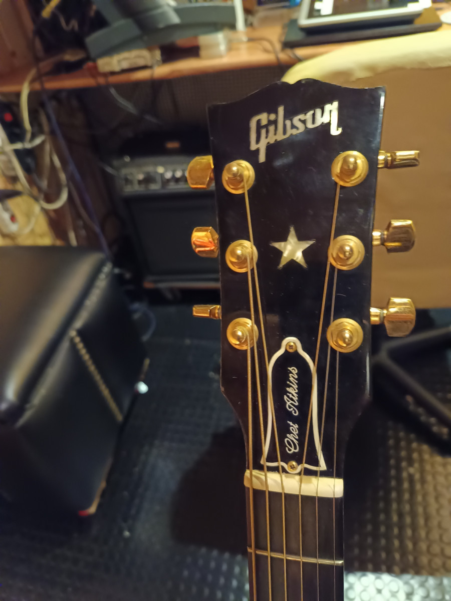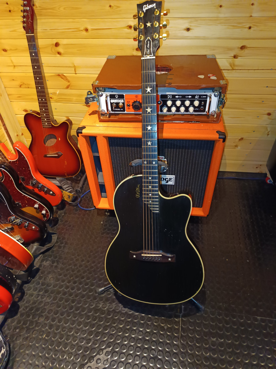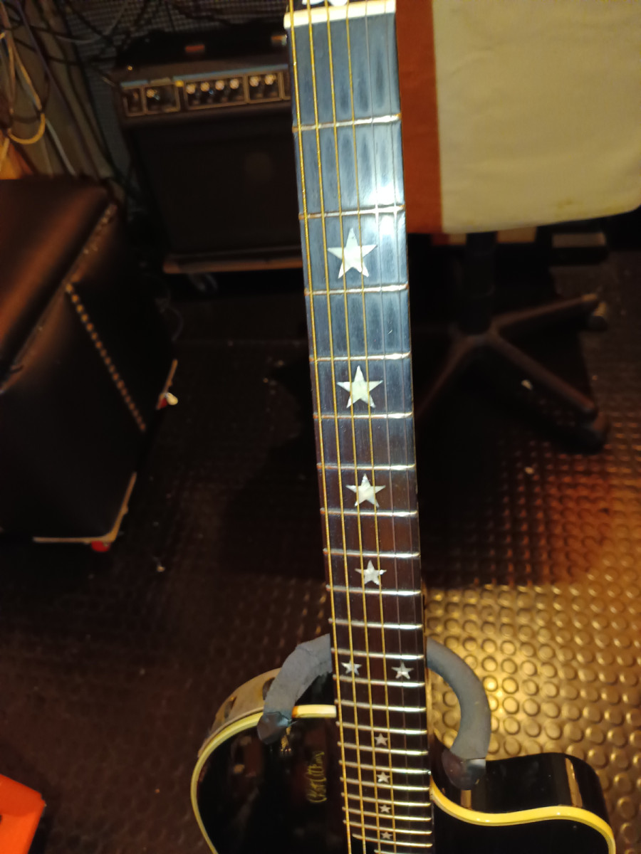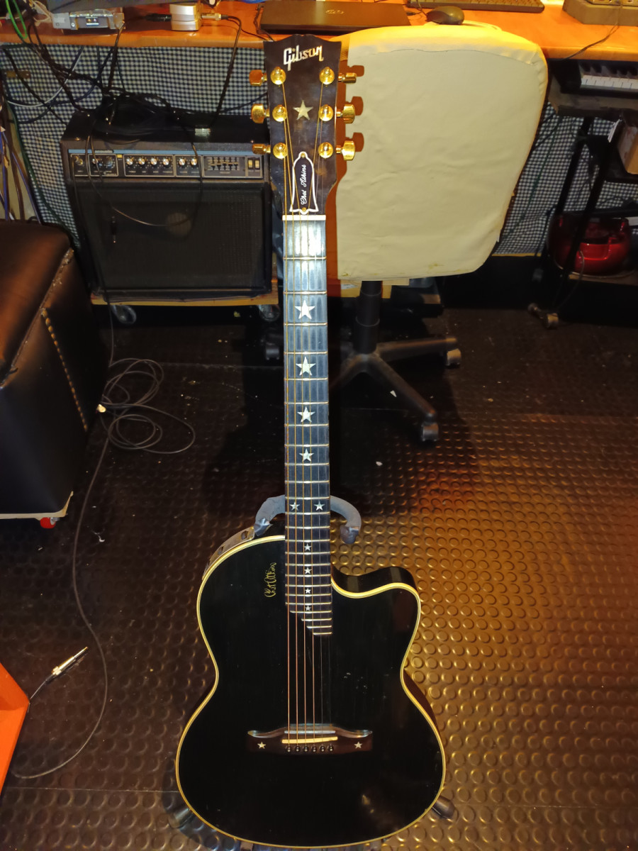 Vendo guitarra electroacústica Gibson Chet Atkins en color negro. Un modelo icónico con un sonido precioso. Año 90. Cuerpo negro brillante. Incrustaciones de estrellas en el diapasón. Incluye estuche rígido. Interesados probar en Madrid. No hago cambios