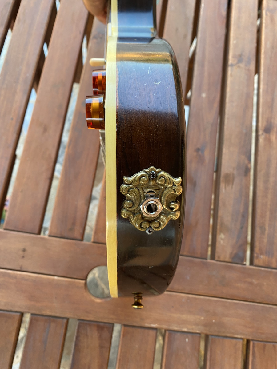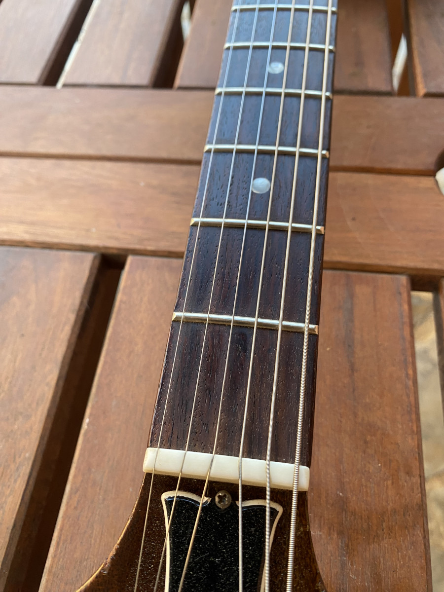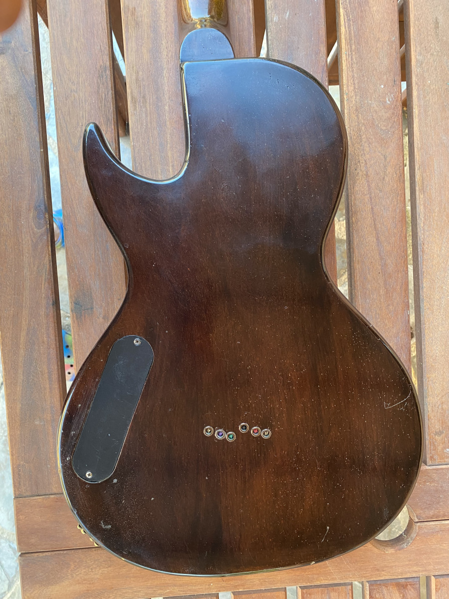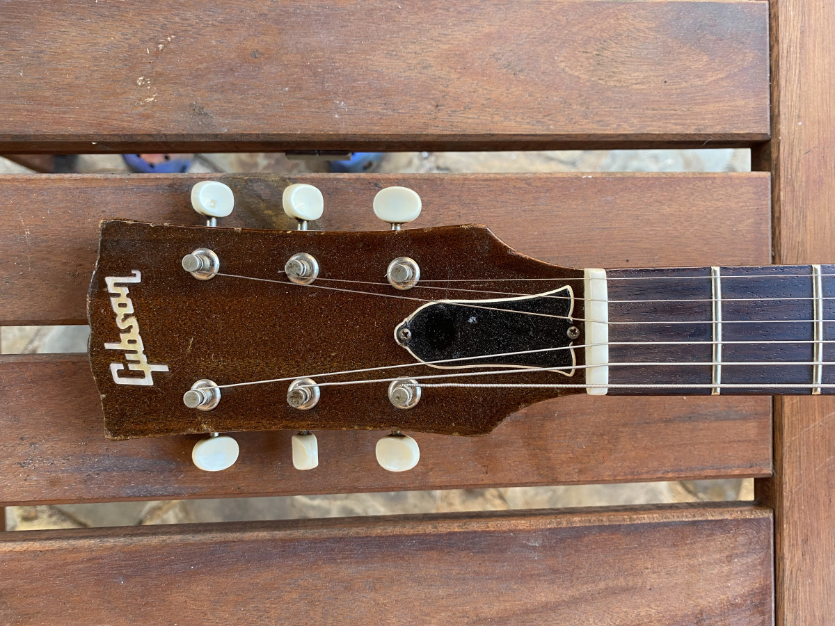 Guitarra hecha por luthier con el mastil se una Gibson (quizás acústica) de 1970. Mastil con voluta sin Made in USA, escala corta y cejuela estrecha.