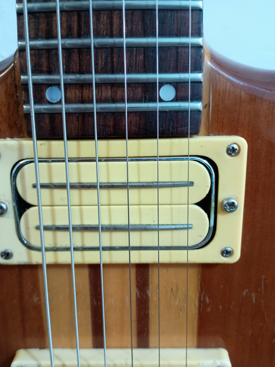 Es Necktrough, cómoda, ligera, y conserva las pastillas originales. Los trastes están nuevos (retrasteada) y ajustada muy muy cómoda. Las pastillas son originales.