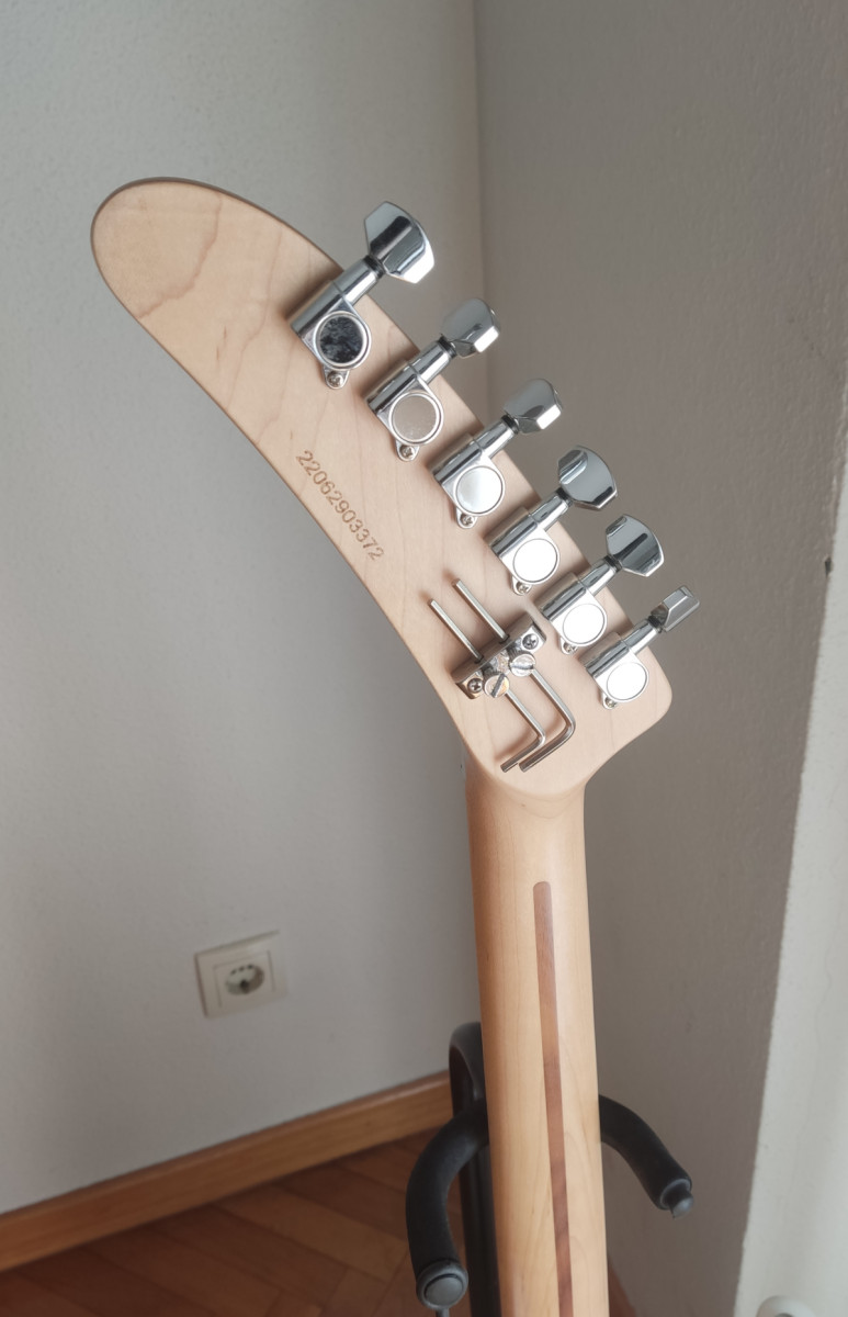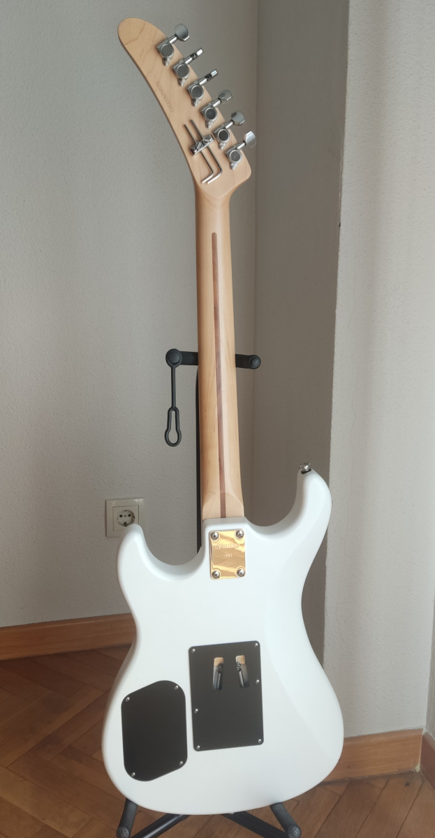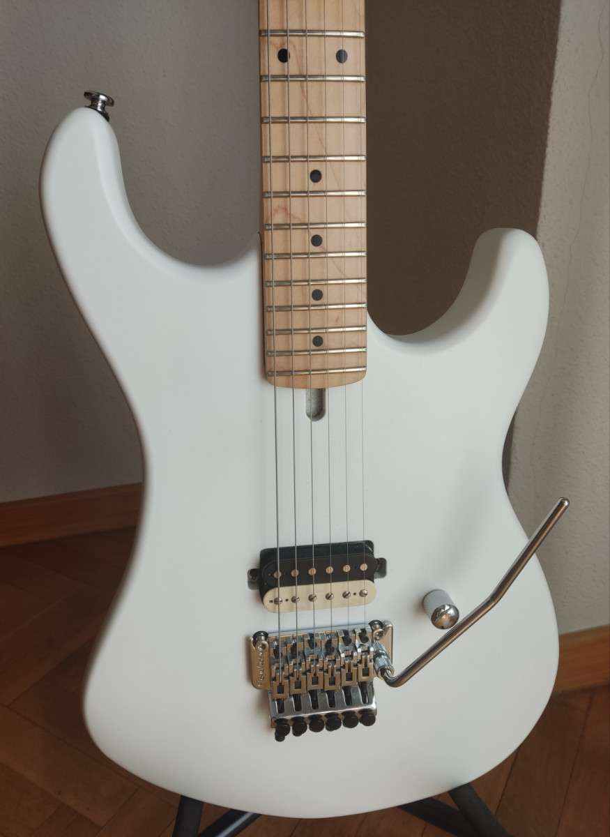 Está mejor que nueva, se le nivelaron y pulieron los trastes, se ajustó bien el Floyd y la acción, y ahora tiene las cuerdas bajitas sin cerdeos y es súper estable, no se desafina nada por mucho que le des. También se le cambió el potenciómetro, que era un push pull regulero por un buen pote CTS. La pastilla es la JB original con el logo borrado (por estética, las Duncan viejas no lo llevaban).