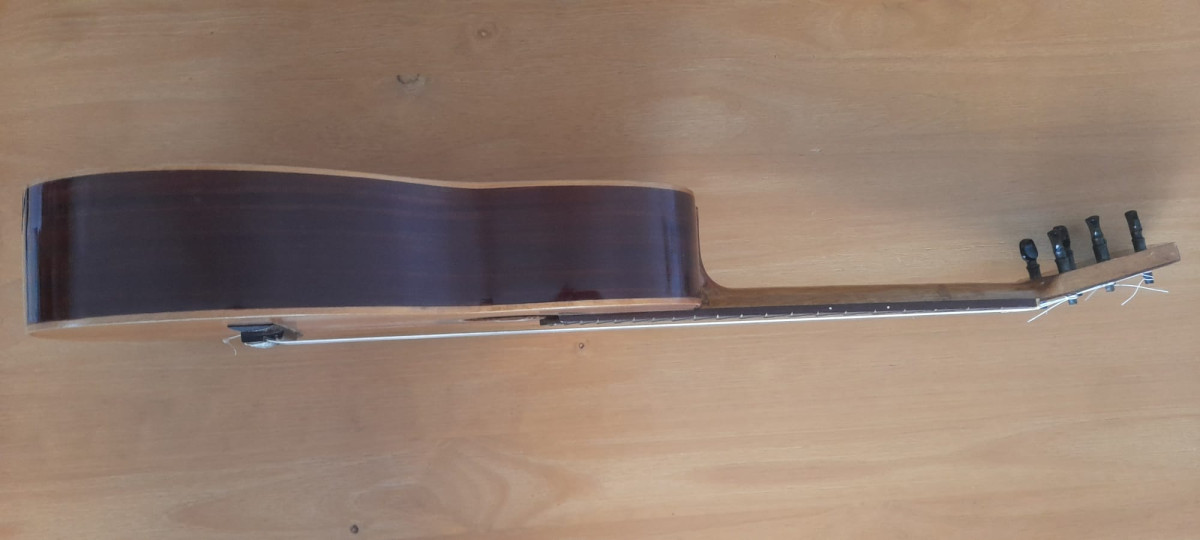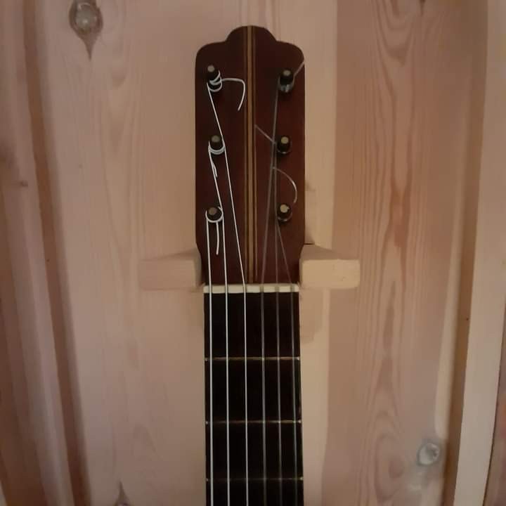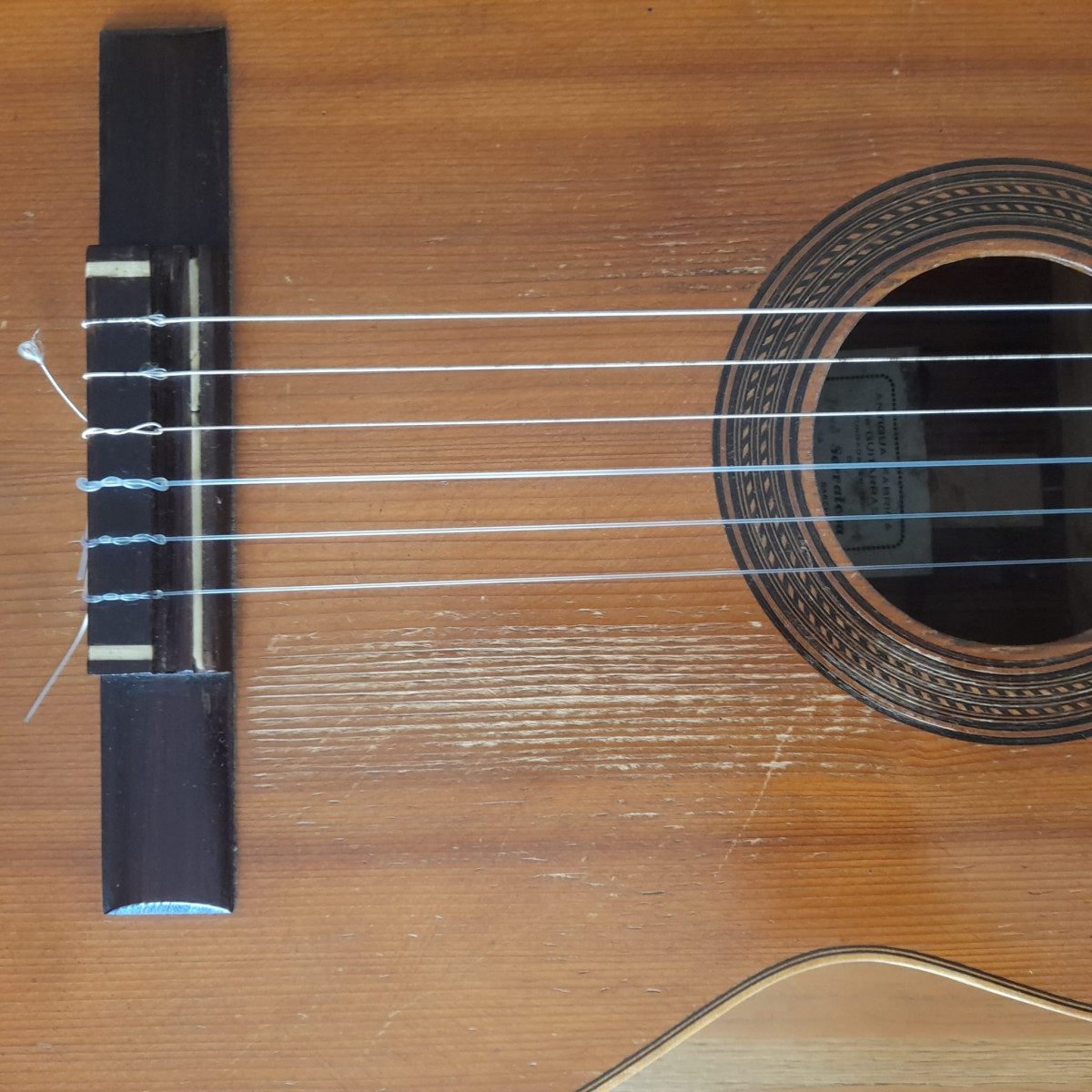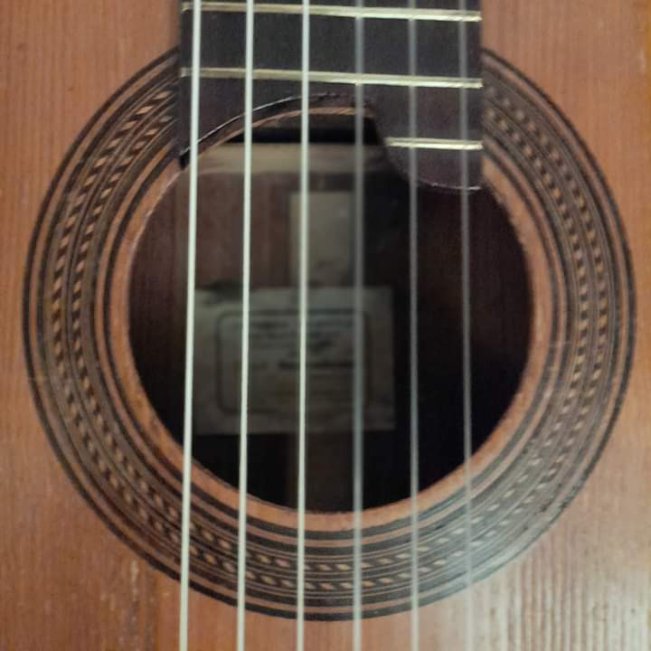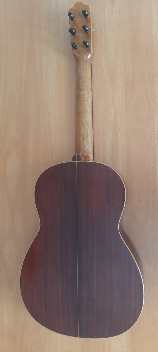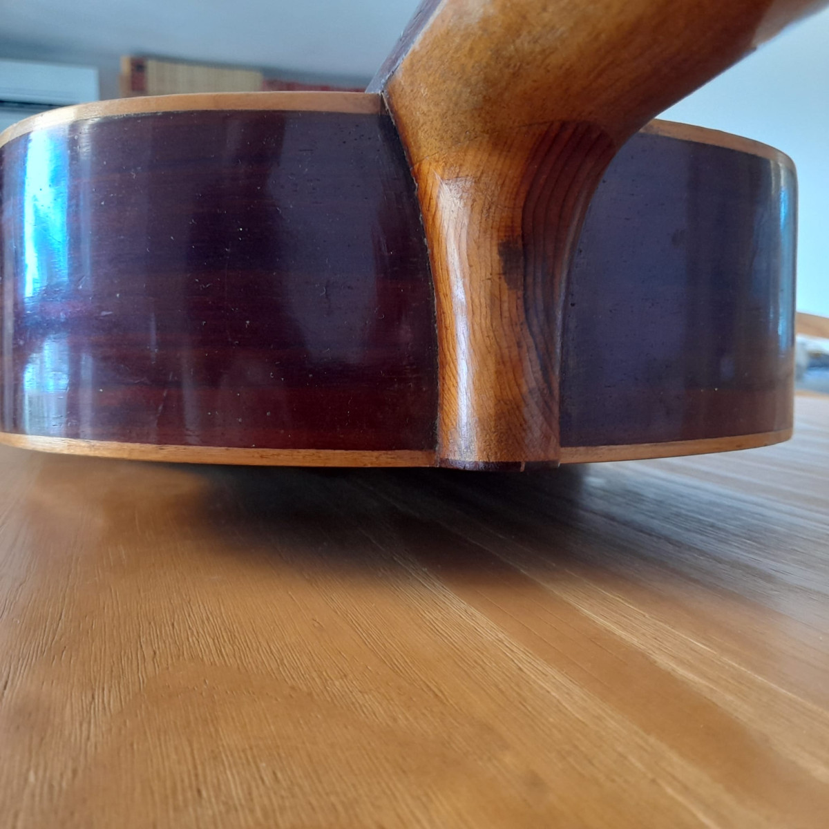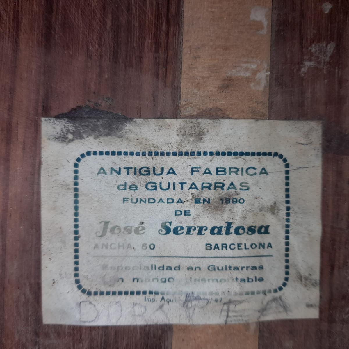 Guitarra construida en Barcelona por el luthier José Serratosa entre 1921 y 1927 (ver blog del luthier Miguel Mateo sobre guitarras históricas para más información). La plantilla es un centímetro menor que las guitarras actuales, lo que la hace muy cómoda al sujetarla. Recuerda el modelo histórico Torres mediano. El tiro es de 650 mm. La acción es correcta y el mástil está en buen estado. Las clavijas (palillos) son de madera, originales. Conserva el barniz original. Tapa de pícea, aros y fondo creo que de palisandro y el mástil probablemente de cedro (lo deduzco por el color y el aspecto, pero no soy experto en maderas). En muy buen estado de conservación, con rayaduras de uso normales en una guitarra con cien años a sus espaldas. Puedo mandarla en un viejo estuche rígido que no uso sin coste adicional.