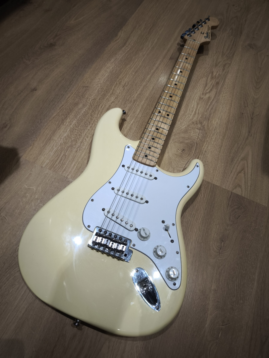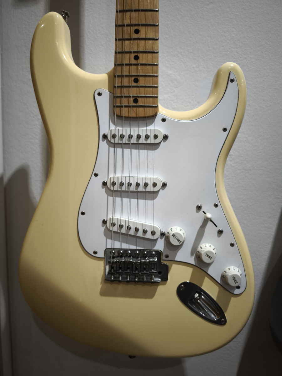 Preciosa guitarra Stratocaster en color crema. Se encuentra en muy buen estado.