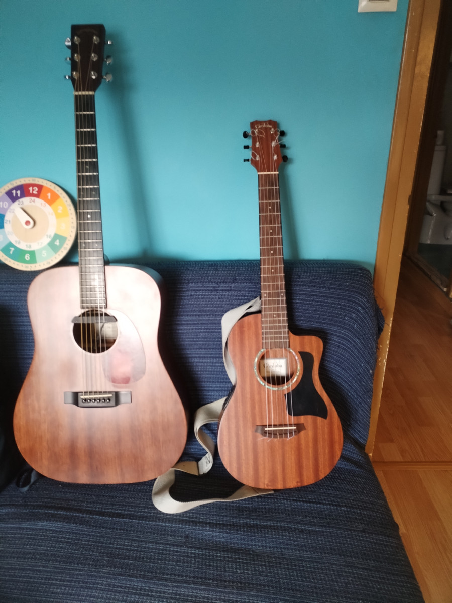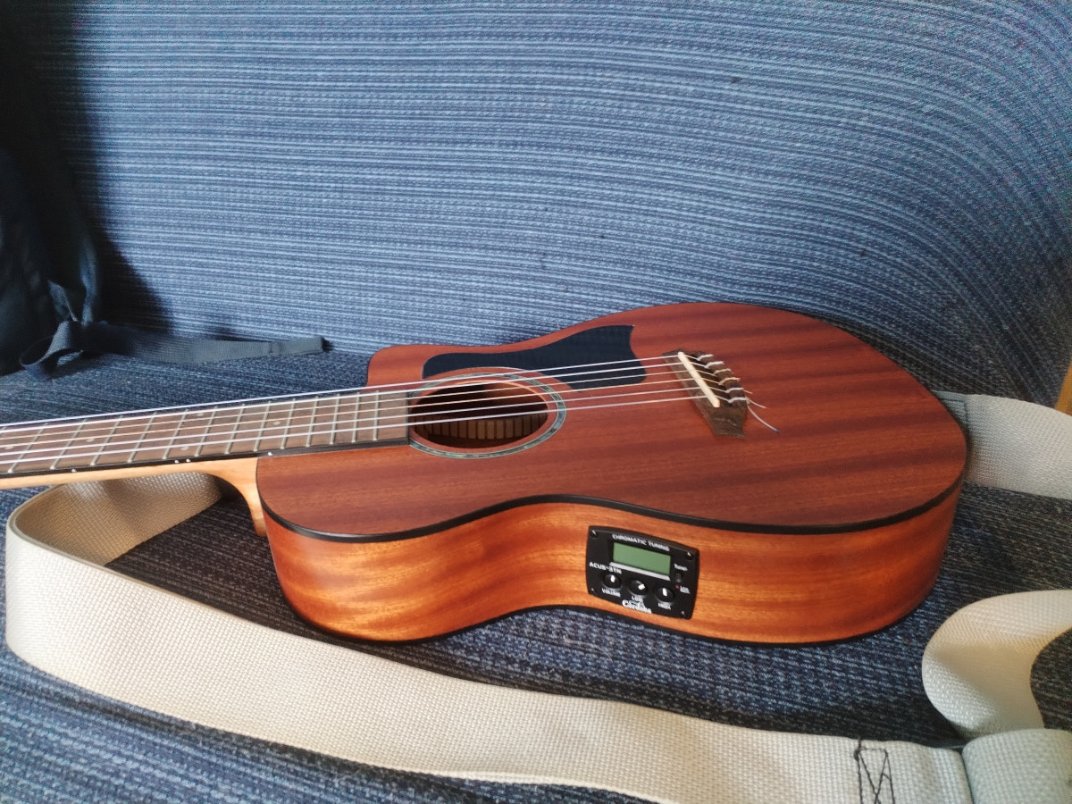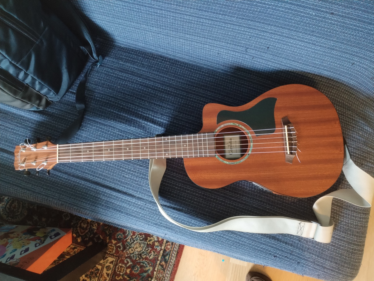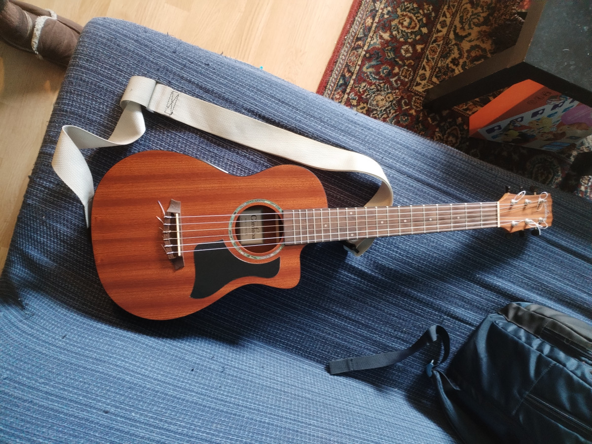 Cuidada a más no poder. Previo con afinador. Enchufada a un ampli con una gota de reverb suena angelical. En acústico es muy agradable de tocar y escuchar, no es un juguete. Le puse un golpeador negro estilo Taylor mini que a mi modo de ver le queda genial.