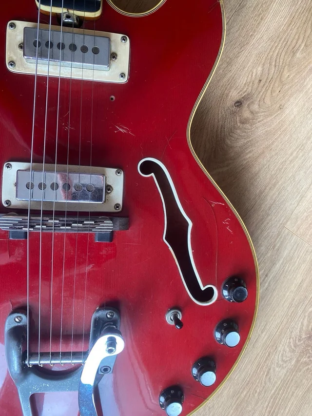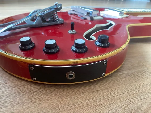 Guitarra vintage EKO barracuda aproximadamente del 1965. Funciona perfectamente, el mastil está en muy buenas condiciones, ajustada y con la acción baja. Tiene dos pastillas Soapbar que dan unos tonos muy diferenciados. La del puente suena “pinchante”, perfecta para el rock&roll y la del mástil es muy redonda, bajándole un poco el tono tienes un estupendo sonido Jazz. Ha tenido que ser restaurada debido a su mal estado, ver fotos, pero ahora se puede tocar perfectamente y está sonando como el primer día. Guitarra de gama alta con bindings en cuerpo y mástil que, sin enchufar, suena estupenda, casi como una acústica.