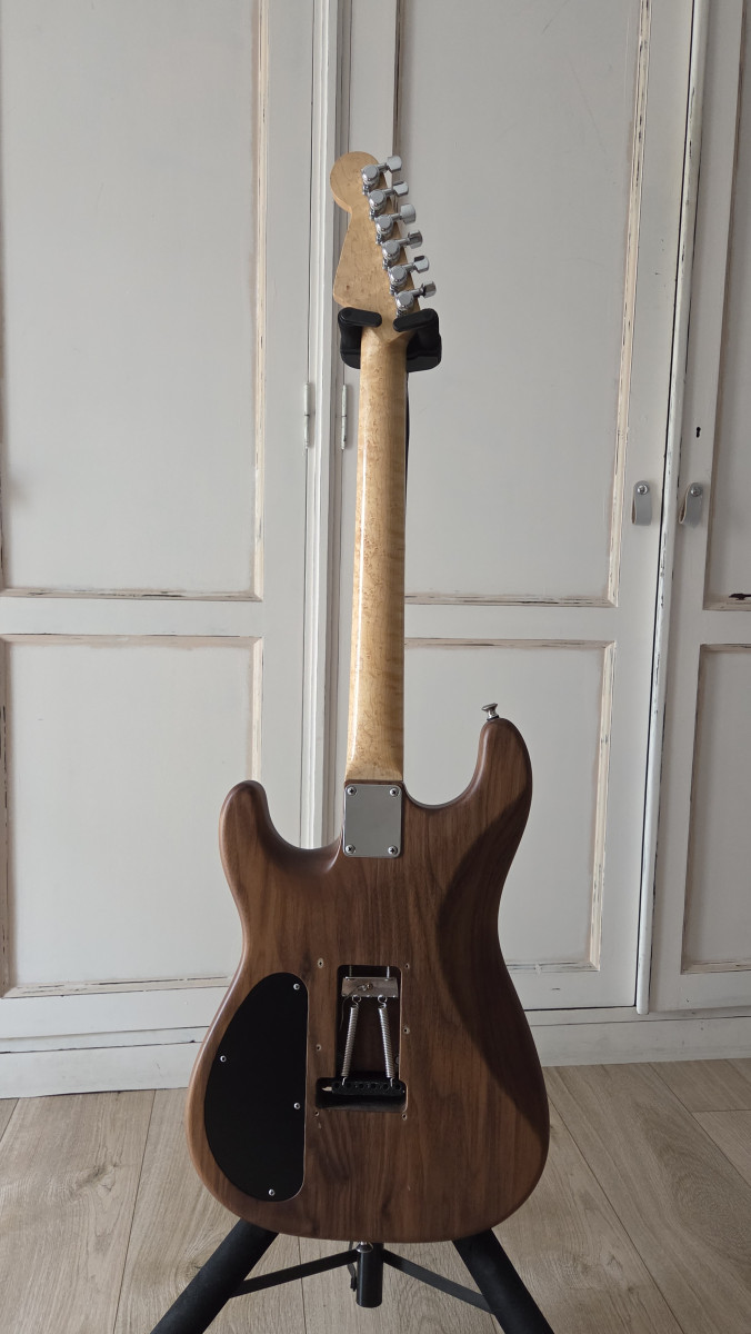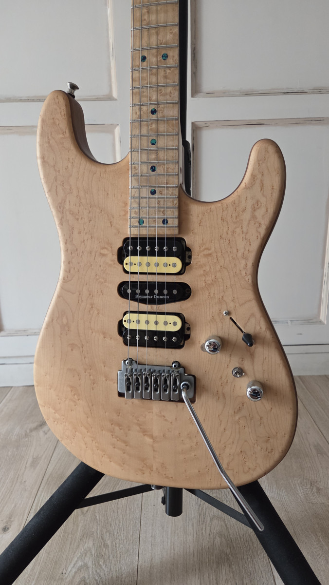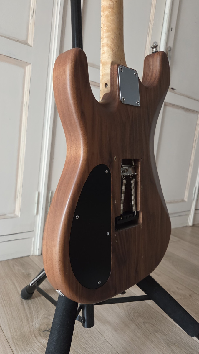 El cuerpo es de madera de nogal con tapa de arce de ojo de pájaro, y el acabado es satinado.