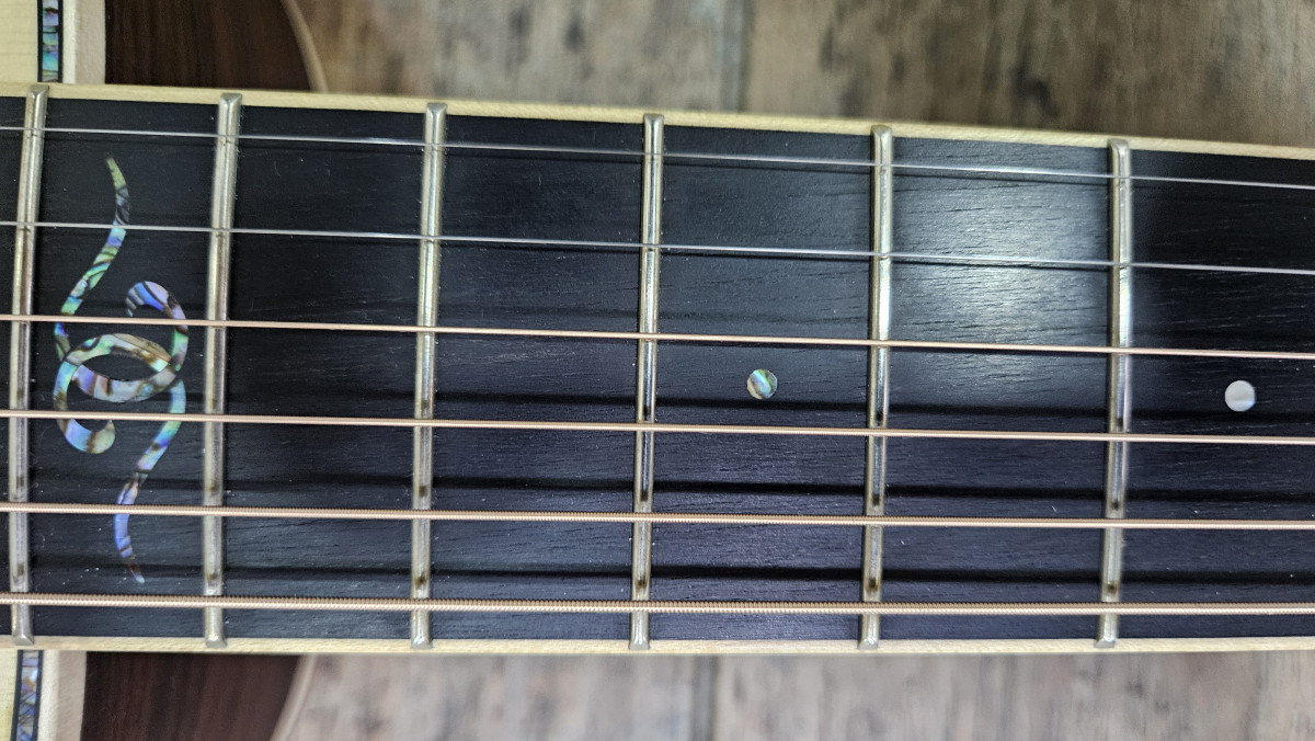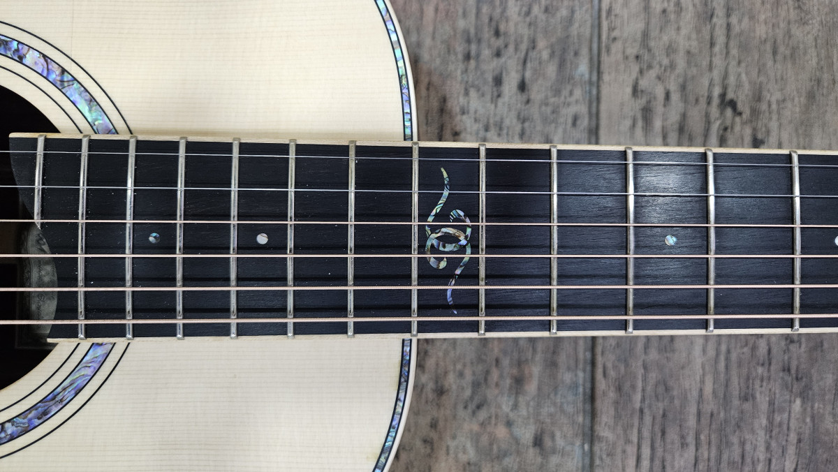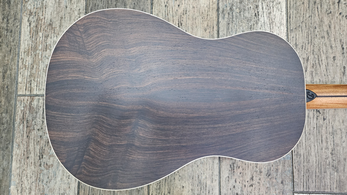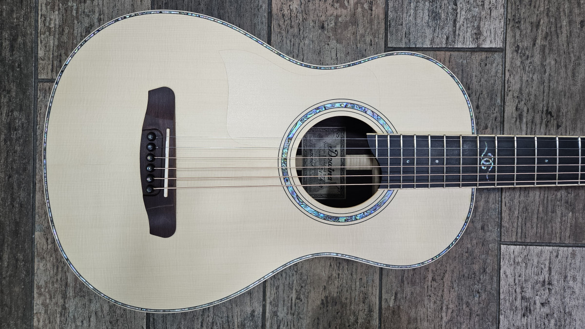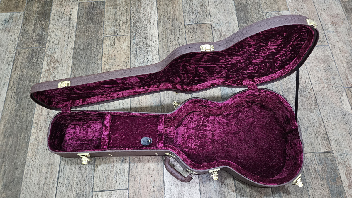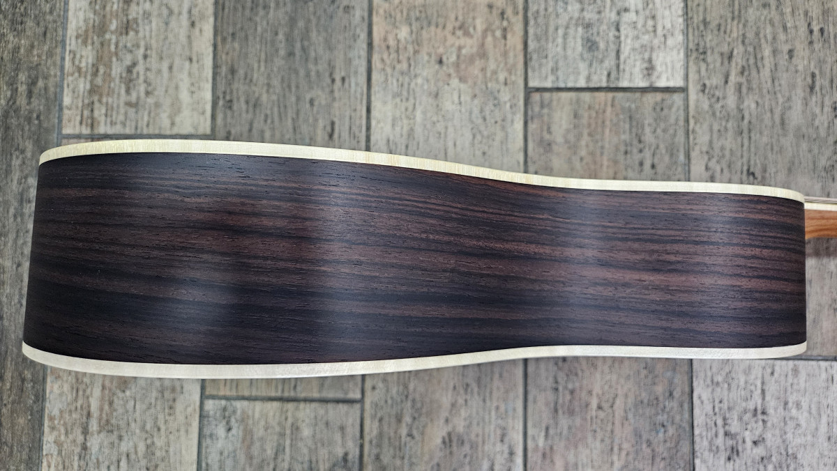 Guitarra acústica para zurdos Dowina. Serie Vintage Cabernet (palosanto dela India). Modelo Bonavida. Construida en Eslovenia en 2023 por encargo. Personalizada: pala abierta, binding extra y roseta hechos con abalone autentico, golpeador transparente. No electrificada. Estuche rígido original. Cuerdas D'Addario Phoosphor Bronze. Nueva, sin señales de uso ni rasguños, como nueva. Compra protegida o en privado.