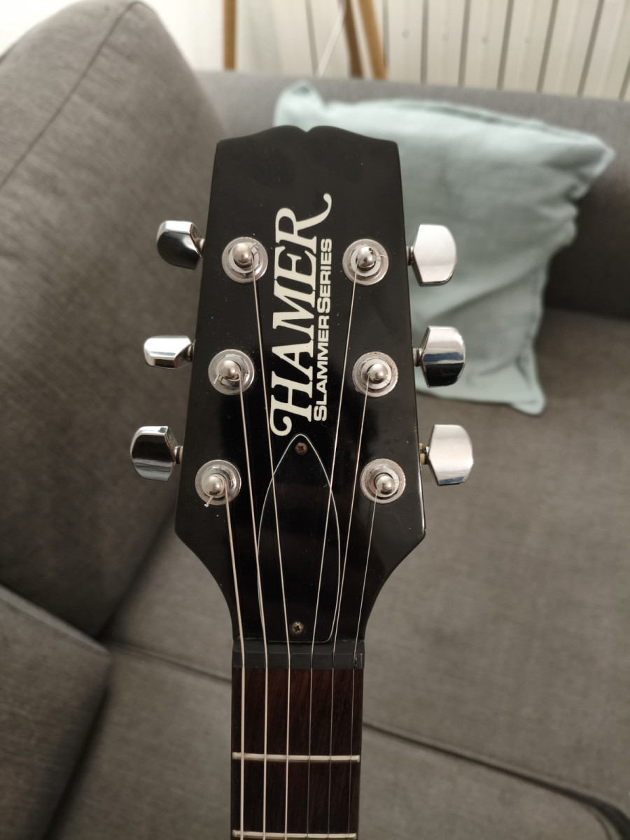 Saco a la venta esta guitarra que me ha venido de un cambio. Me llegó en unas condiciones algo deplorables, pero he hecho que quede una guitarra tremenda con bastante poco esfuerzo. La guitarra en sí es una Hamer, de las Slammer series, bastante codiciadas por su buena calidad de maderas y acabados. La guitarra está hecha de caoba (parece korina), con mástil de caoba y diapasón de palorrosa precioso. Similar en peso y características a una SG. Las maderas resuenan que dan gusto y se toca de maravilla, es súper cómoda. Presenta algunos desgastes típicos del tiempo (ahora en 2026 hace 30 años), pero nada destacable.