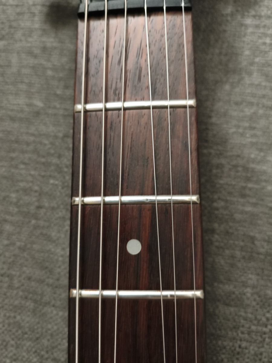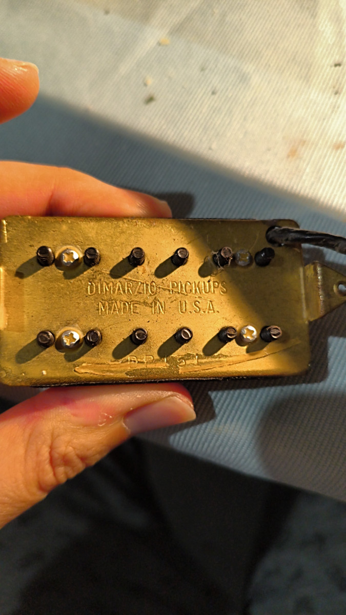 ¿Qué trabajo le he hecho? Limpieza exhaustiva del diapasón, ya que estaba seco y con algo de porquería del tiempo. He pulido algo los trastes para quitarle el óxido, así como a todos los tornillos y polos de la Dimarzio (aún así presentan óxido, pero muchísimo menos). Rehice la circuitería ya que estaba fatal hecha, con cables a medio poner y raspaban los potes. Le he puesto dos volúmenes, uno para cada pastilla.