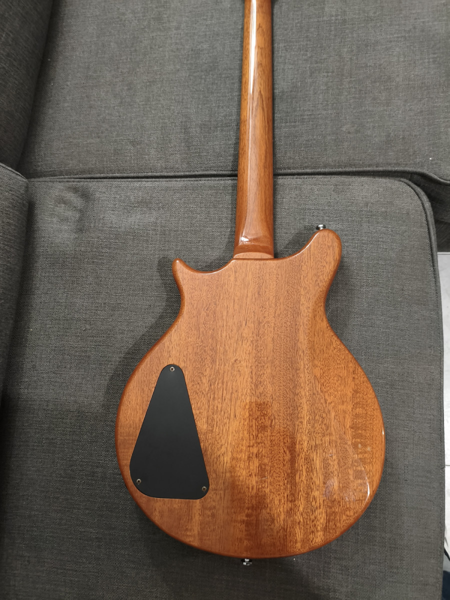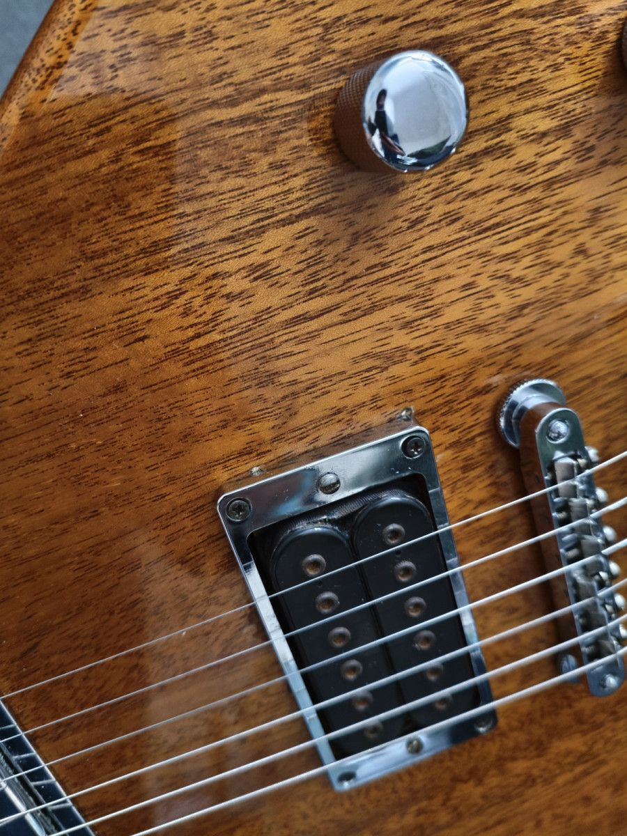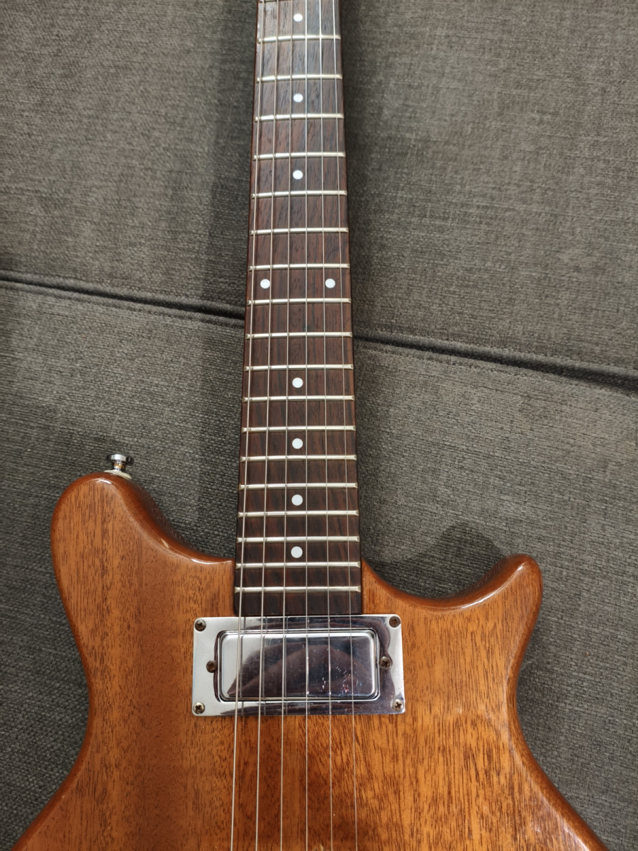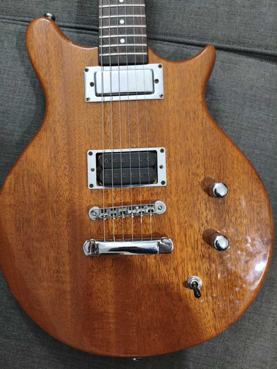 Comparándola con el modelo original, se le agrandó el hueco de la pastilla del puente (originalmente una mini humbucker) para introducirle una humbucker al uso. No diré que el trabajo sea bueno, pero entra y coincide parcialmente con las cuerdas. La pastilla es una Dimarzio Paf Pro, también con sus años. Suena bestial, puro rock. La pastilla del mástil es la original, una mini humbucker coreana bajo el registro de "Kent Armstrong".