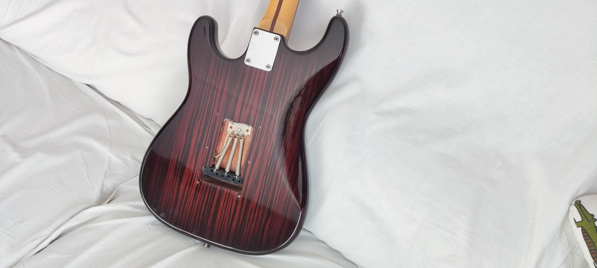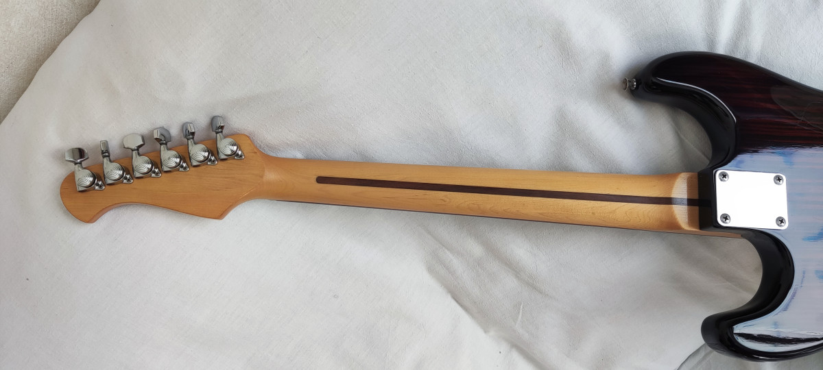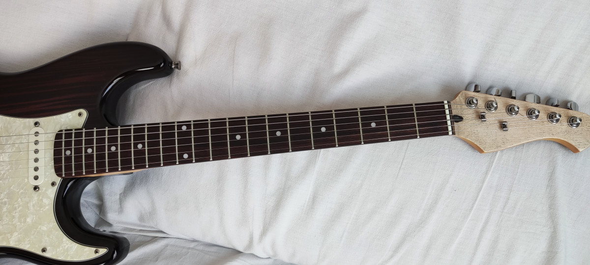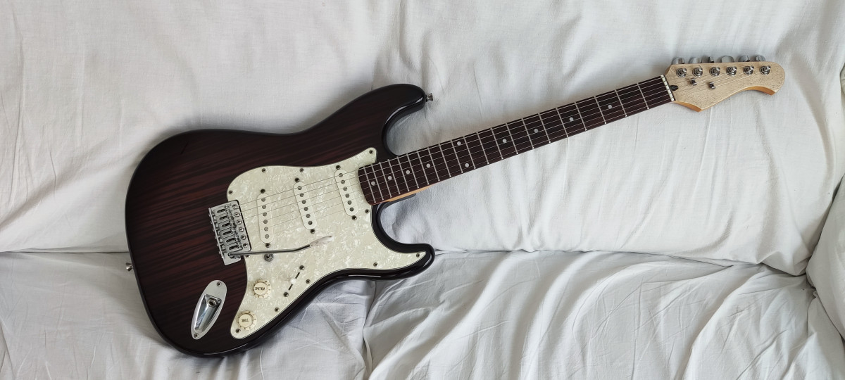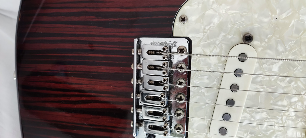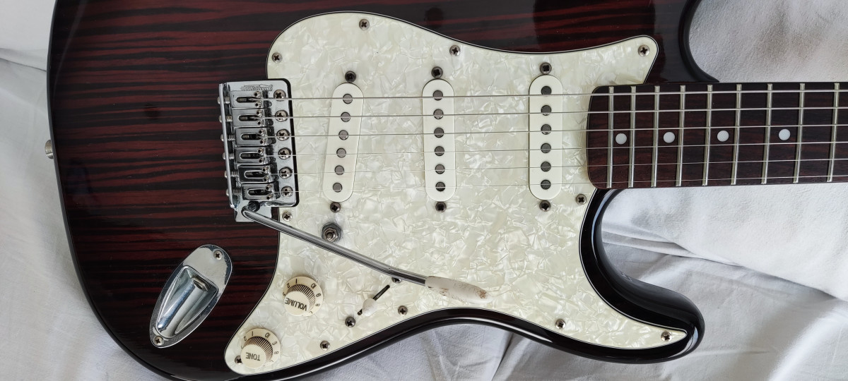 Lleva mejorada toda la electrónica y pastillas con un pickguard de buena calidad, perlado de tres capas y levemente envejecido (de fábrica) con un tono apenas amarillento y apantallado.