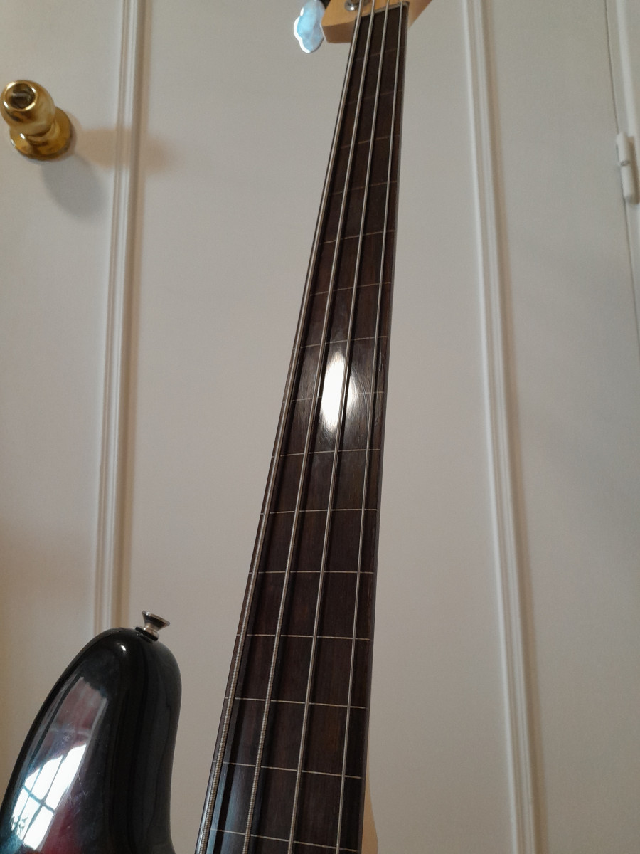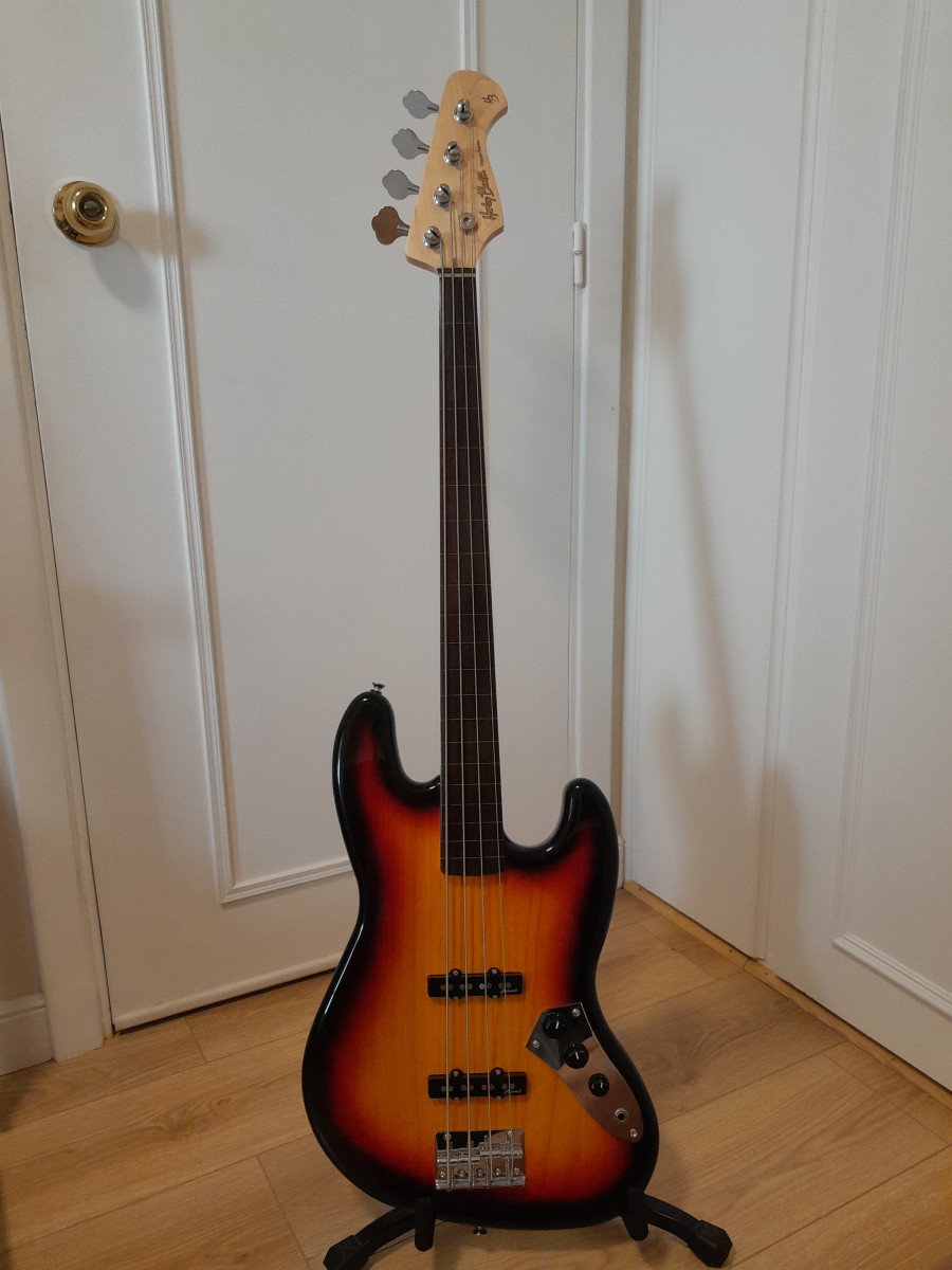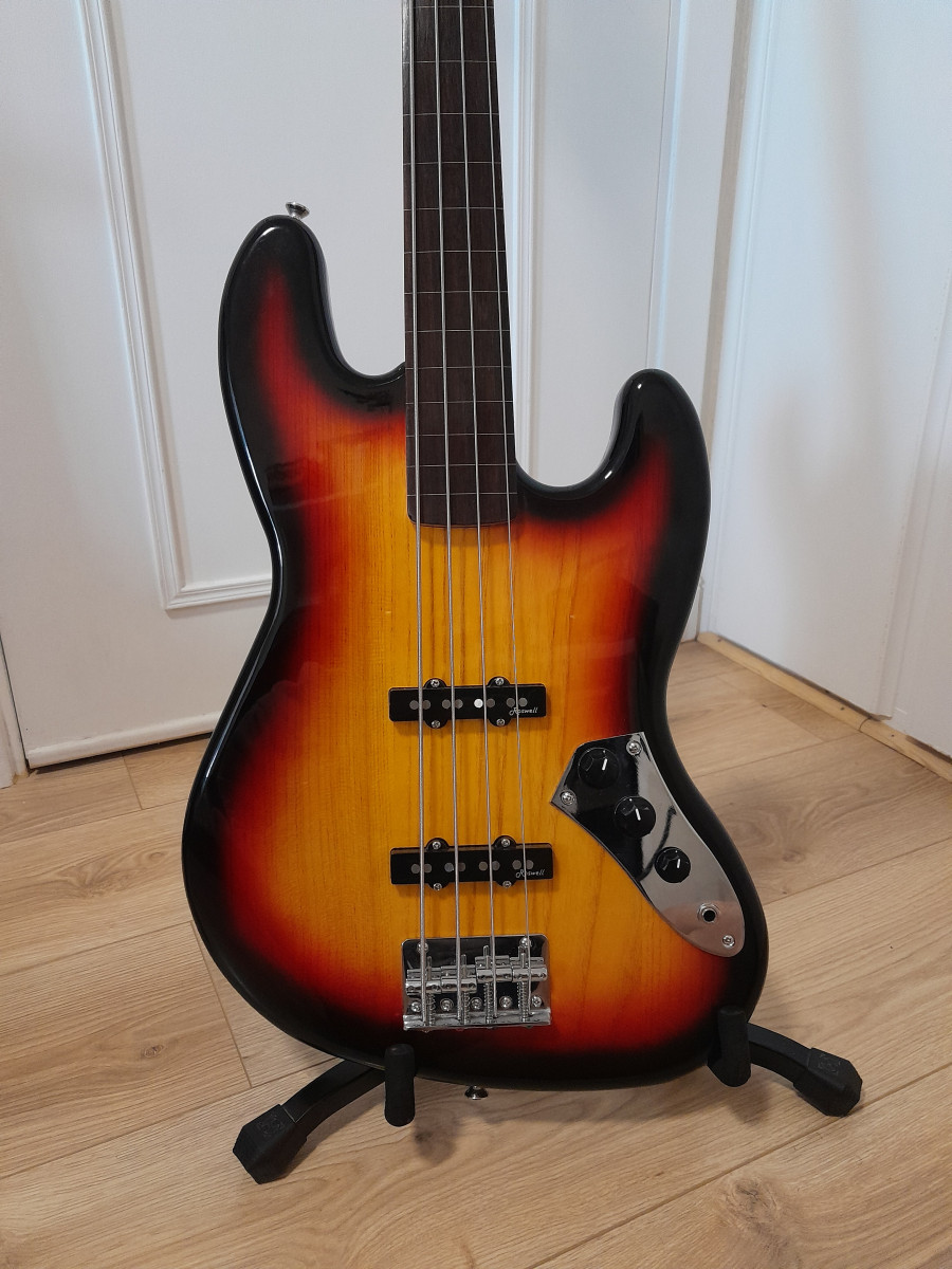 Bajo electrico Harley Benton JB40 FL Fretless muy mejorado, tipo Fender / Squier Jazz bass.