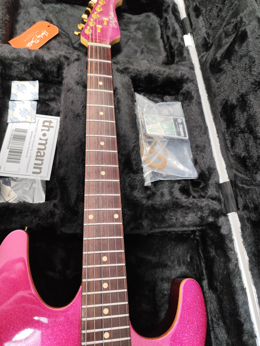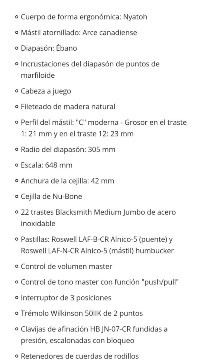 Con características de alta gama teniendo en cuenta el precio de la guitarra (clavijas de bloqueo escalonadas, cuerpo Nyatoh, mástil de arce, diapasón de ébano, trastes de acero inoxidable, push/pull" para bobina simple/humbuckers, trémolo Wilkinson 50IIK de 2 puntos).