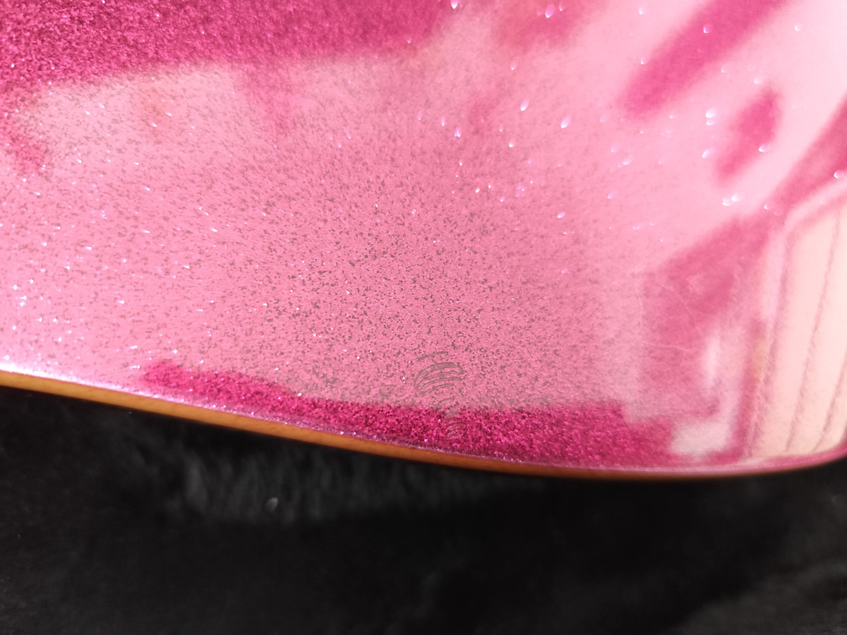 En un color rosa bastante llamativo que ya no se encuentra. Alguna marca de uso.