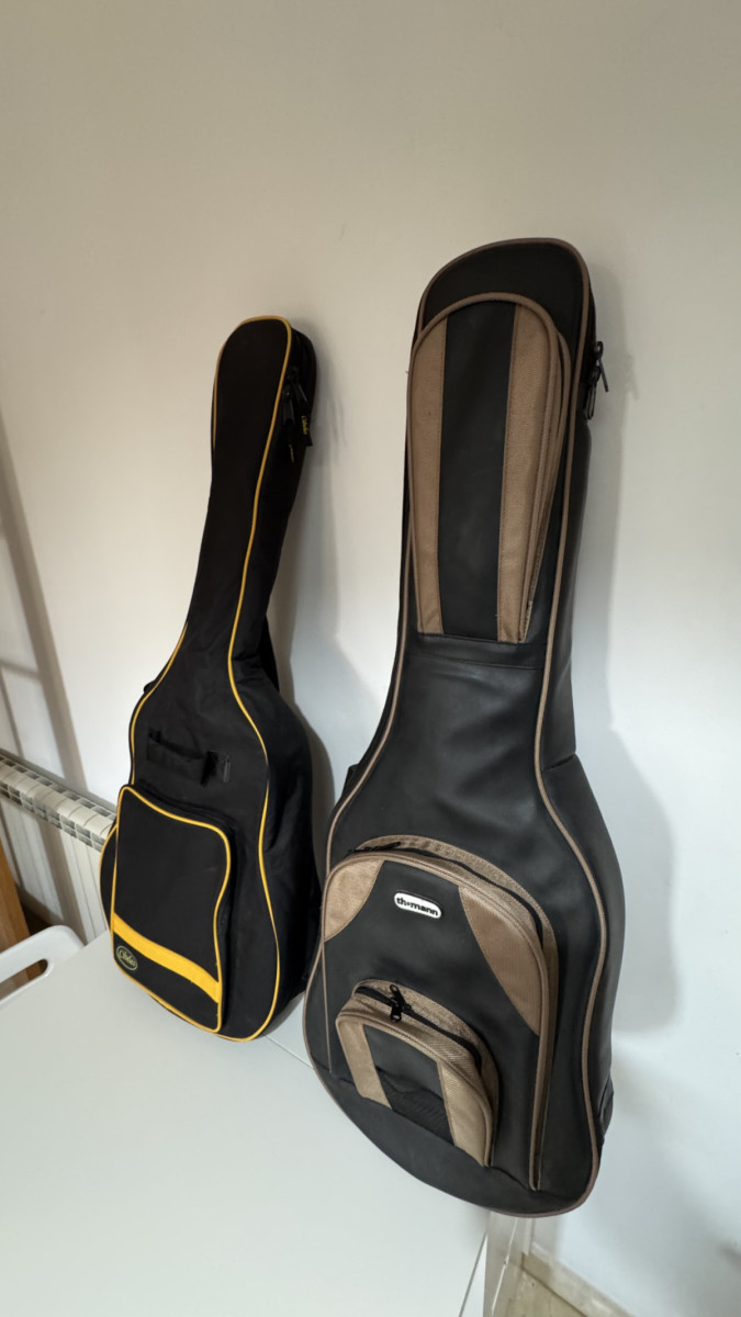 Vendo estas dos guitarras modestas. La eléctrica está sin usar (la compre para ensayos que nunca tuvieron lugar) y la de Nylon en perfecto estado, su pastilla suena muy bien. Se entregan dentro de esas dos fundas. La de Thomann es una pedazo de funda fantástica.
