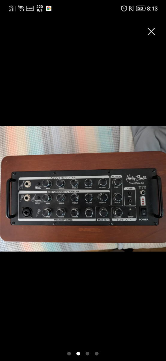 Canal de micrófono / guitarra acústica con selector de modo de micrófono / guitarra, controles de graves, medios, agudos, volumen y efectos digitales (eco y reverberación)