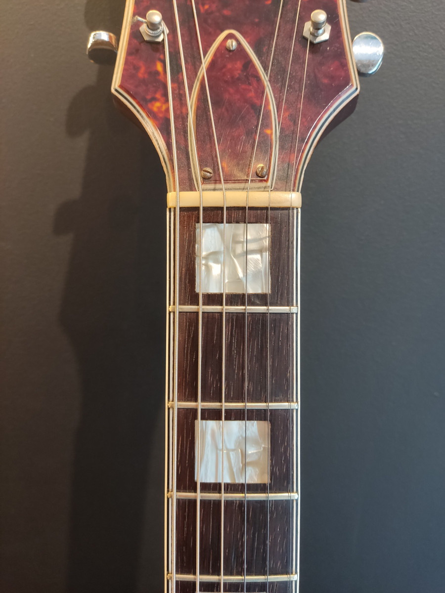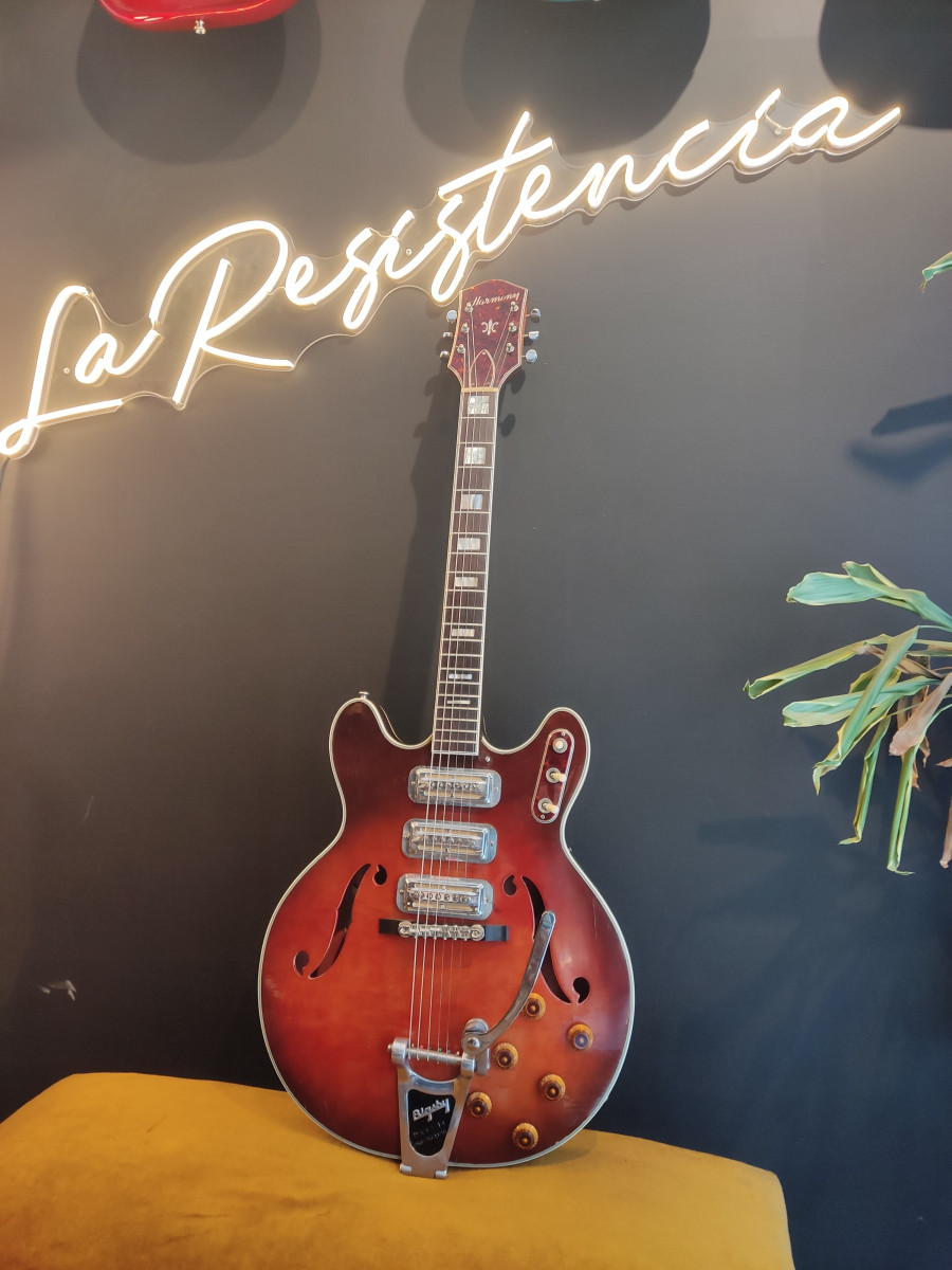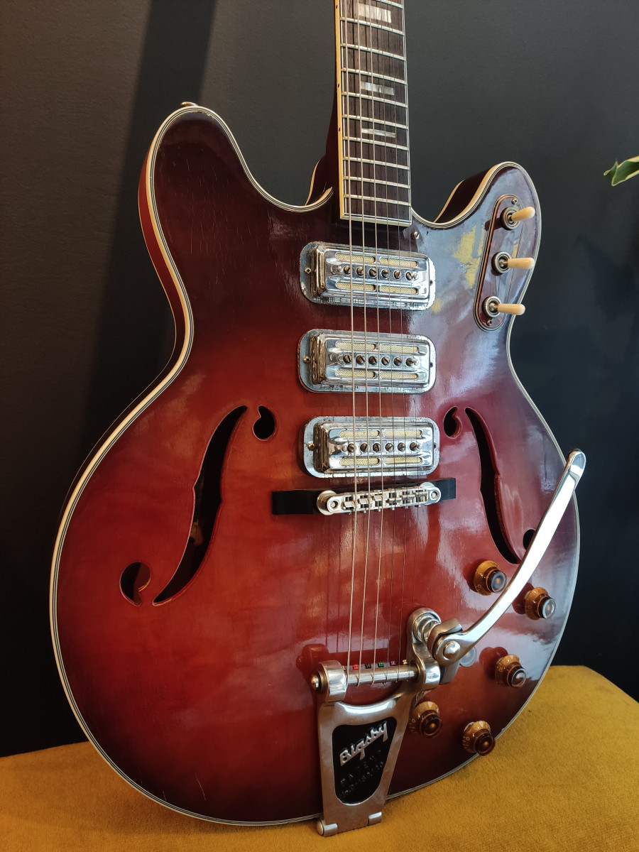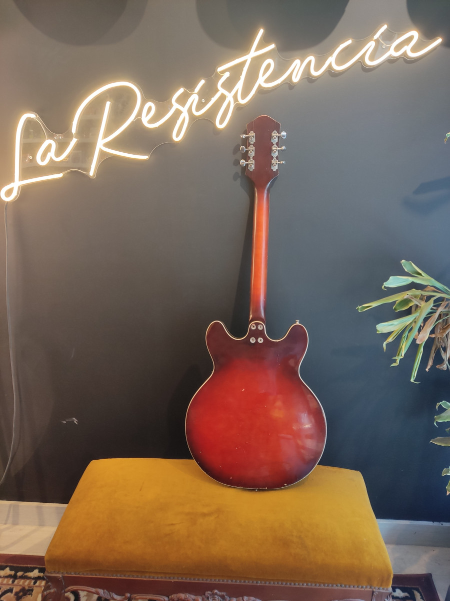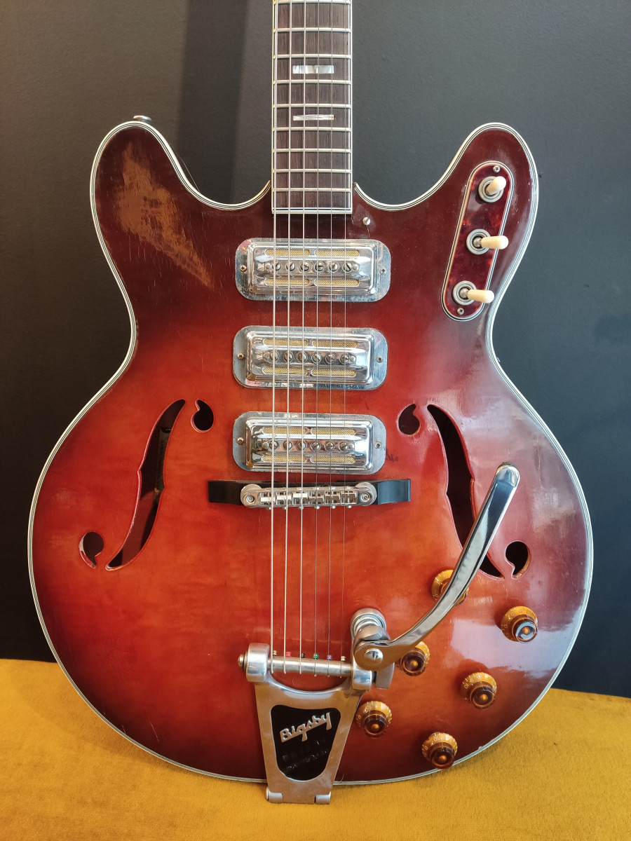 Guitarra vintage de principios de los 60. Mismo modelo que la guitarra de Dan Auerbach de los Black Keys. Estado excelente para su edad, todo original excepto potenciometros, puente, botones y bigsby. Todo lo demás es original y 100% funcional. Viene con funda blanda y está perfectamente ajustada con cuerdas 11-49. Se puede probar sin compromiso en Bcn. NO contemplo cambios de ningún tipo.