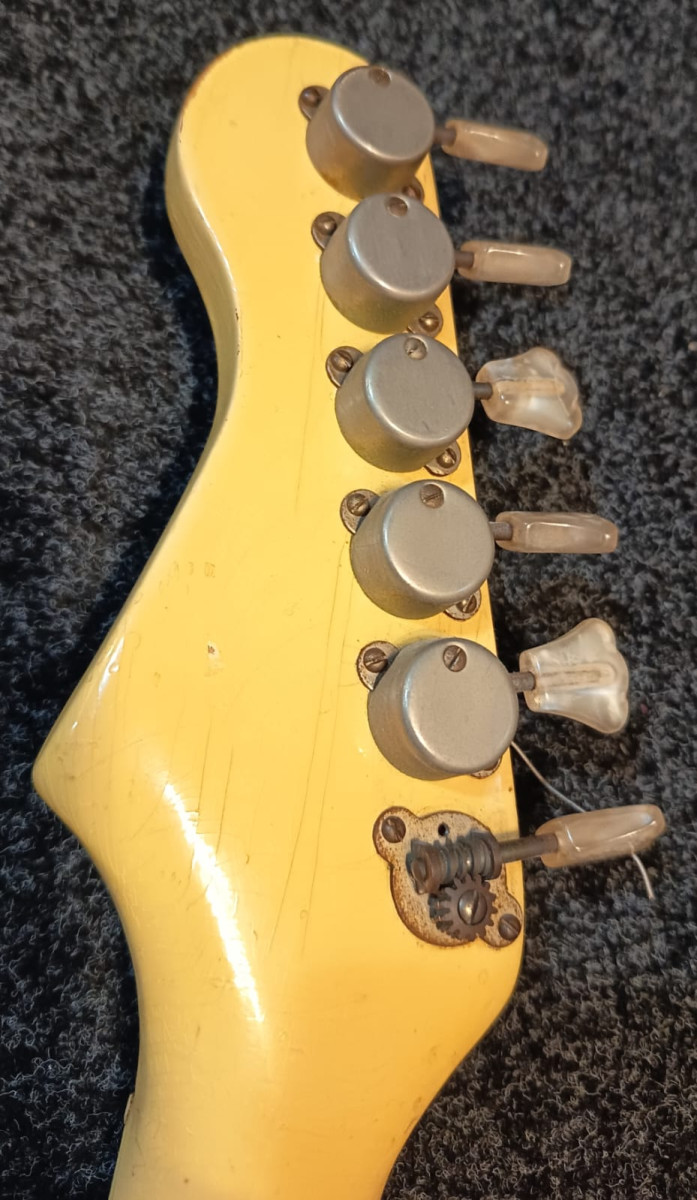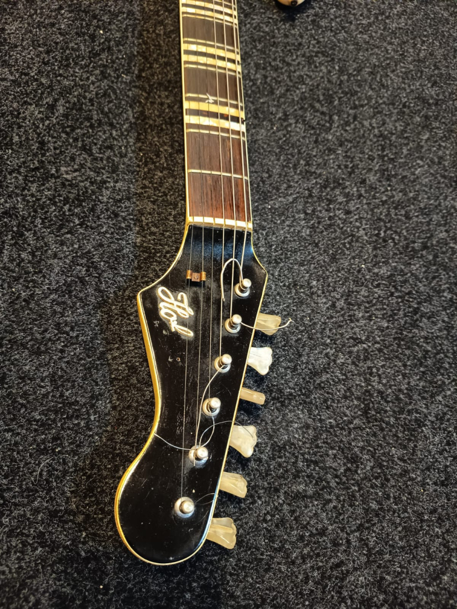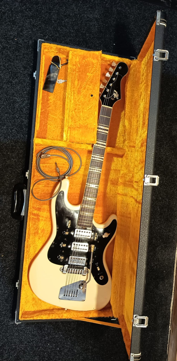 Hermosa alemana guitarra de los años 60 tiene todo original hasta sus tornillos a recepción del jack aunque entrego el original tiene solo dos faltantes muy facil de conseguir , un cubreclavija y el logo de la pala (tiene medio) revisada y puesta a punto todo funciona .La entrego con estuche duro no original