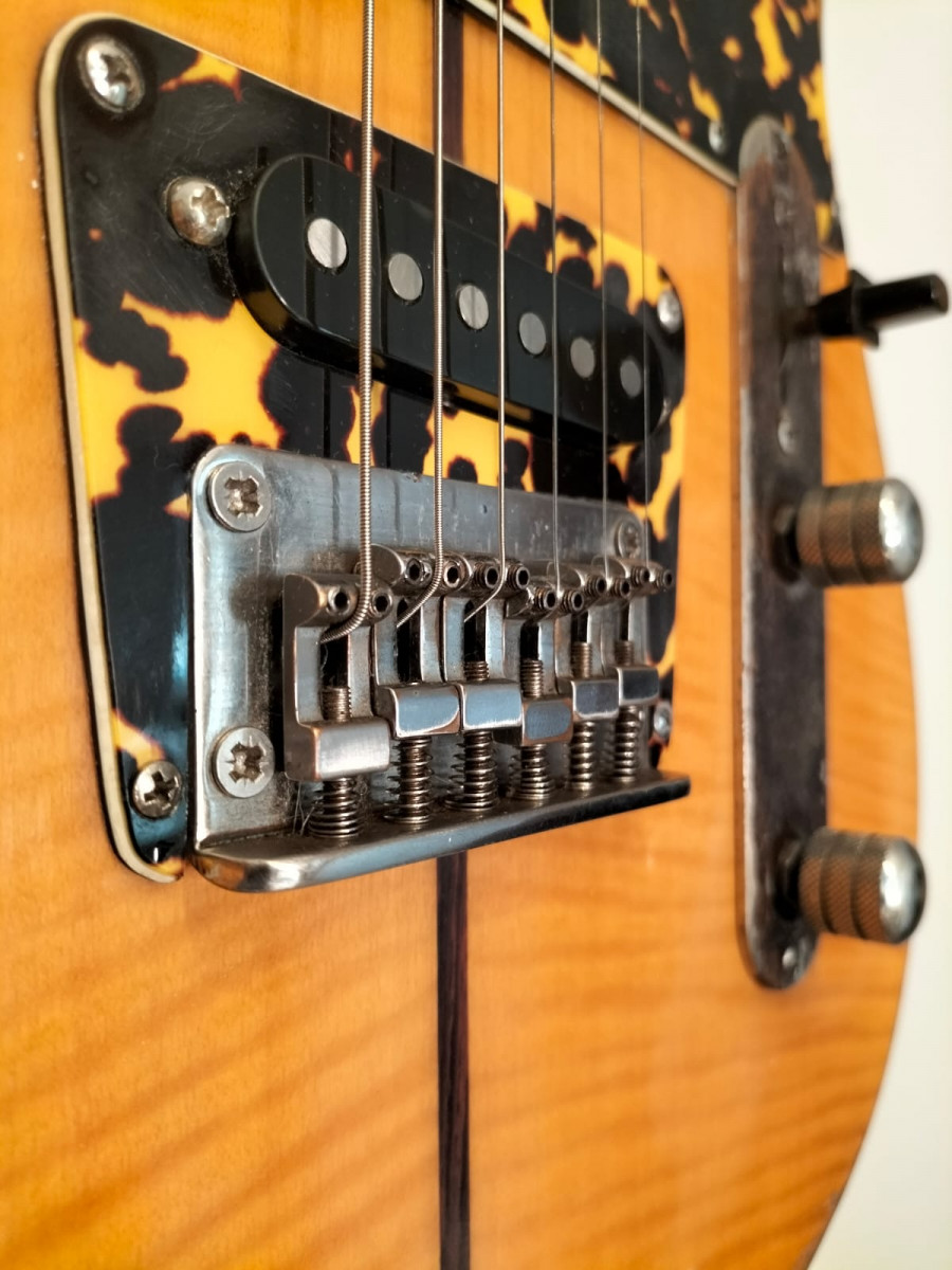 Retrasteada, sin cerdeos y con acción baja. Se toca de maravilla, el mástil es una delicia así como la estética general de la guitarra. Además suena de escándalo. Clavijero kluson de calidad.
