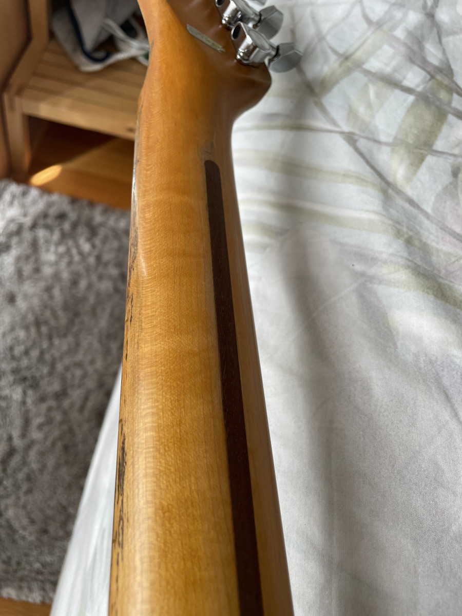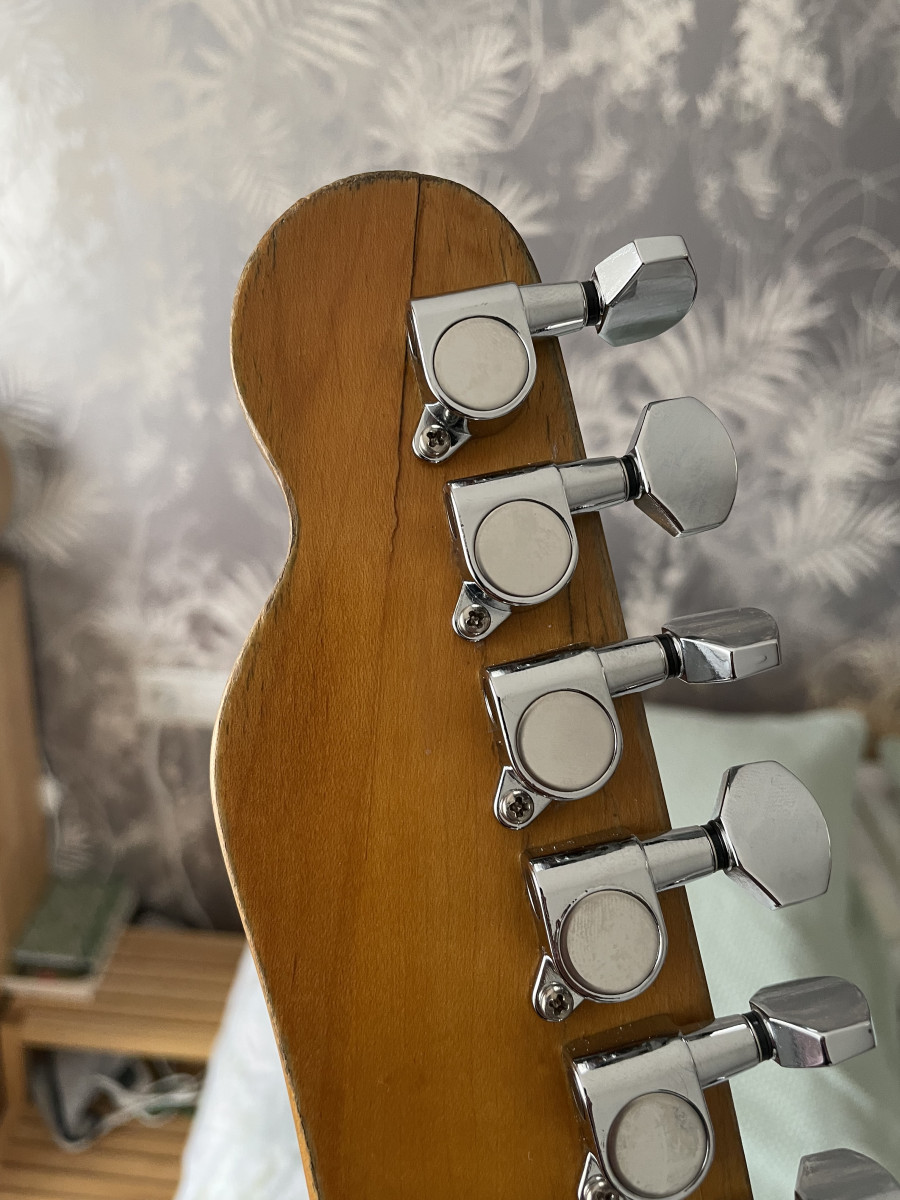 La guitarra tiene mucha tralla (mojo, que dirían algunos), pero está totalmente funcional, perfecta para tocar al 100%, revisada y ajustada recientemente por luthier. Relicada por el tiempo y por el uso. Como se ve en las fotos, presenta desgaste y marcas siendo lo más destacable el inicio de una grieta parcial en la pala, (reparada) que ya traía de lejos (hace años ya, de hecho a mi me llegó así, y al que me la vendió también), de modo que está totalmente consolidada y estable. Envío por privado dotas las fotos y detalles que se deseen.