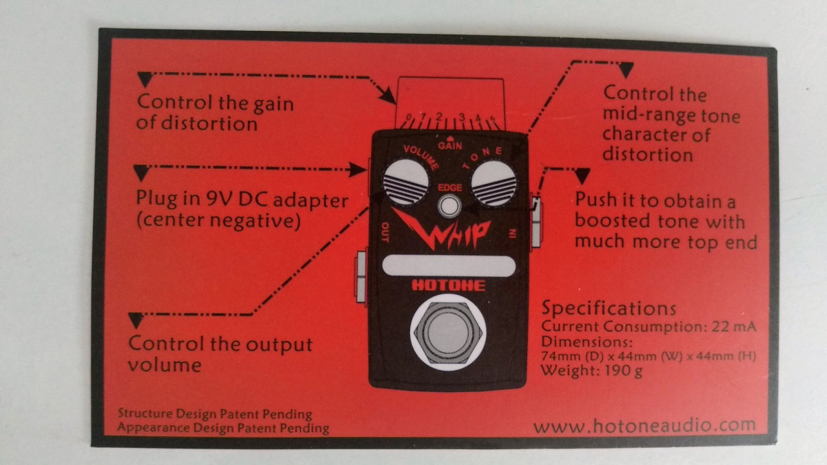 Pedal de distorsión Hotone Whip. En perfecto estado estético y funcional. Incluye caja y documentación original. Pequeño pero matón.