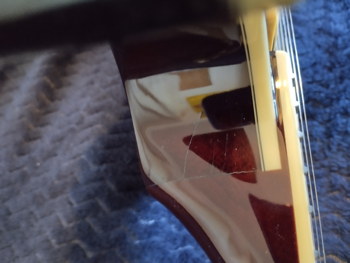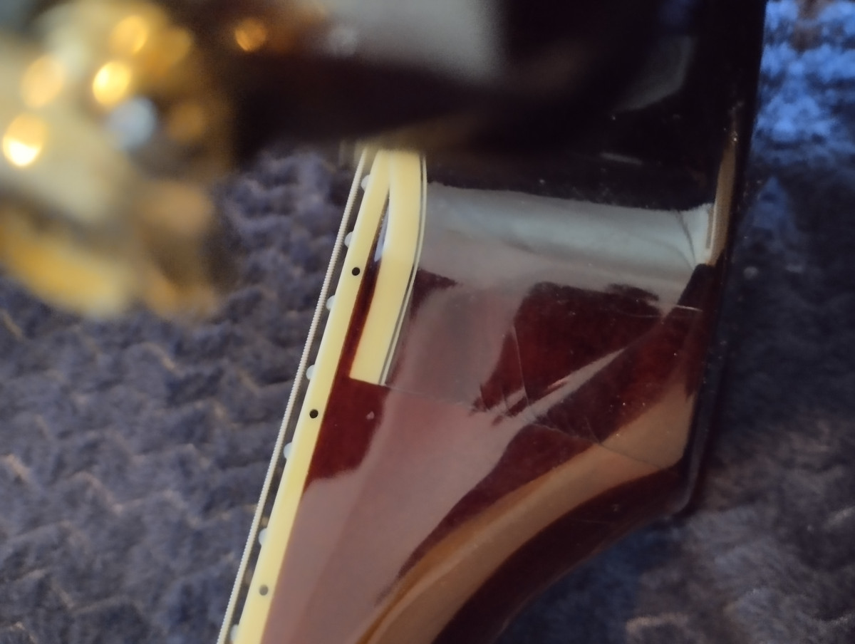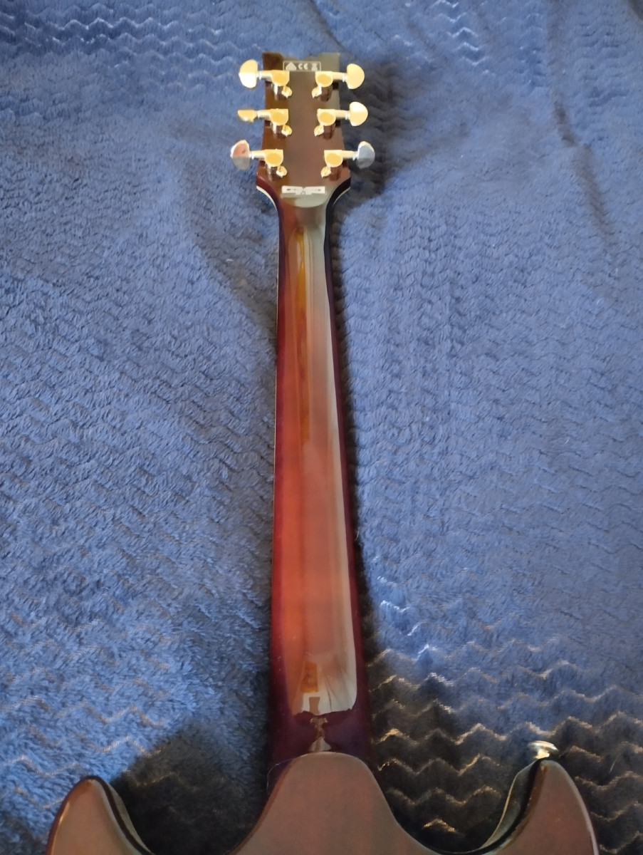 Tiene alguna grieta superficial (del grosor de un pelo) en la junta del mastil con el cuerpo, que les sale a casi todas las guitarras de este tipo de construcción (double cut/Gibson SG) por los cambios de temperatura. Por lo demás, está como nueva.
