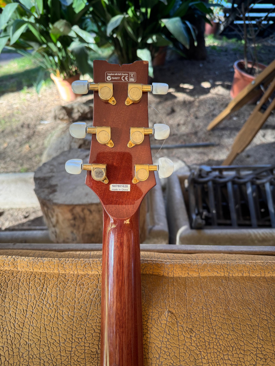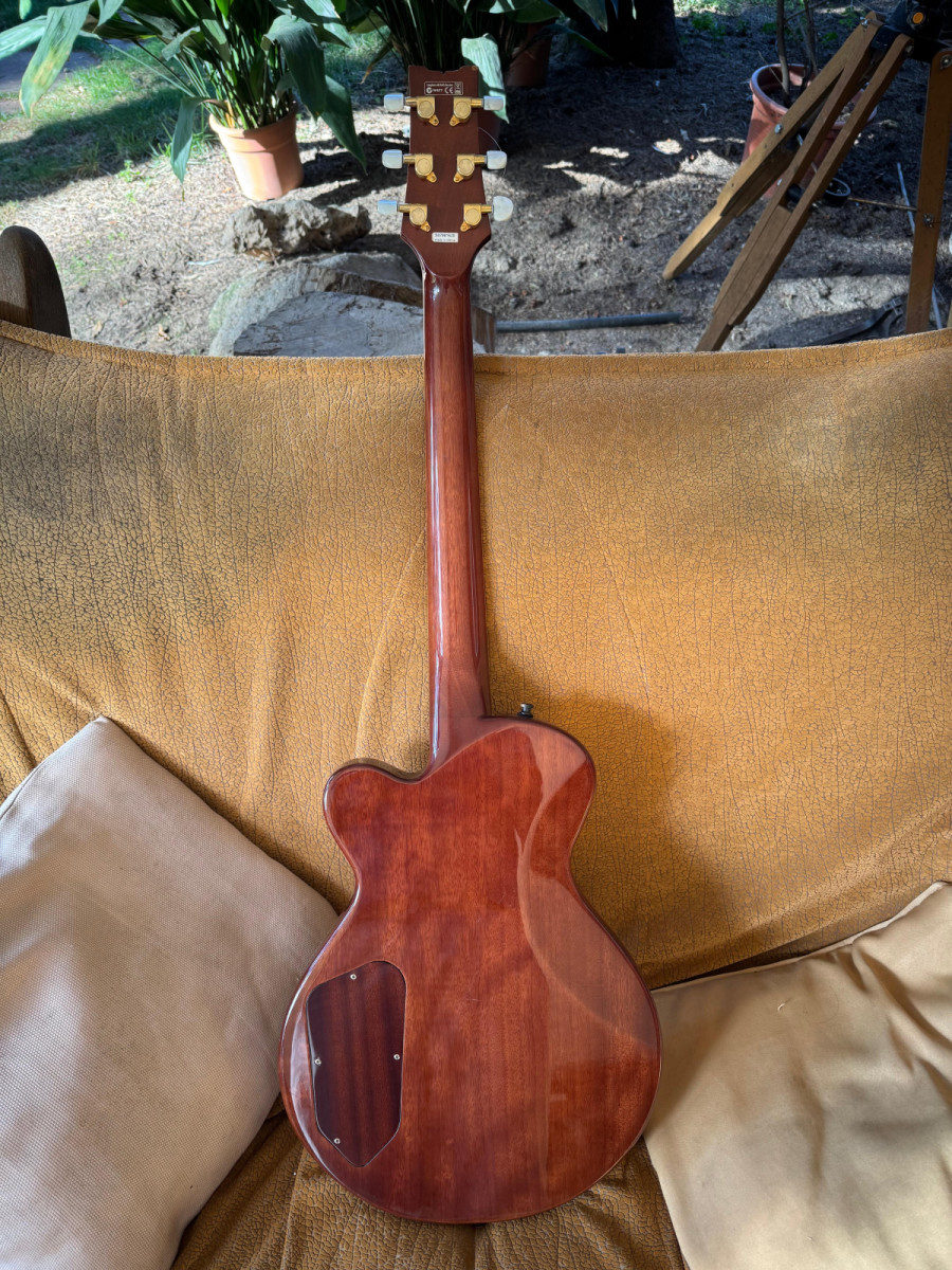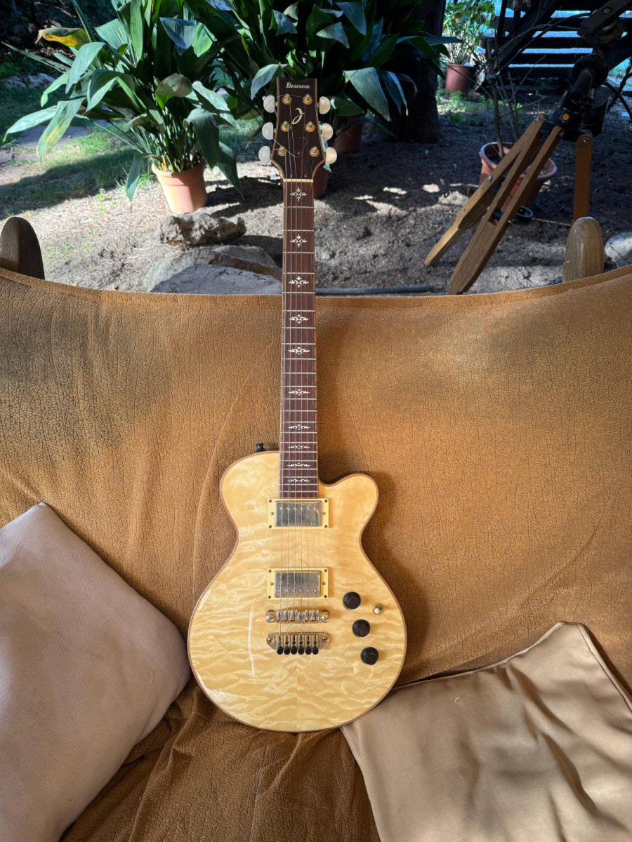 Ibanez ARC500 comprada en 2016 nueva. Tocada un par de veces y guardada en el estuche para no volver a salir hasta la semana pasada para hacerle fotos. Leves marcas en la trasera. Se la compró por ser "bonita y cara" (si él supiera...) y no le cogió el gusto. Es la versión de Ibanez de una Les Paul: Cuerpo de Caoba, tapa de arce acolchado (quilted maple) sólida, mástil de caoba, diapa de palosanto y humbuckers super 58 custom (la versión de Ibanez de la época de una PAF, responden similar a las 57 classic de mi Traditional) . Más delgada, contorno para la tripa en la trasera y muchísimo más ligera que una Les Paul clasicota. Binding de arce flameado en cuerpo y mástil... vamos, una Ibanez de gama alta de las fabricadas en china.