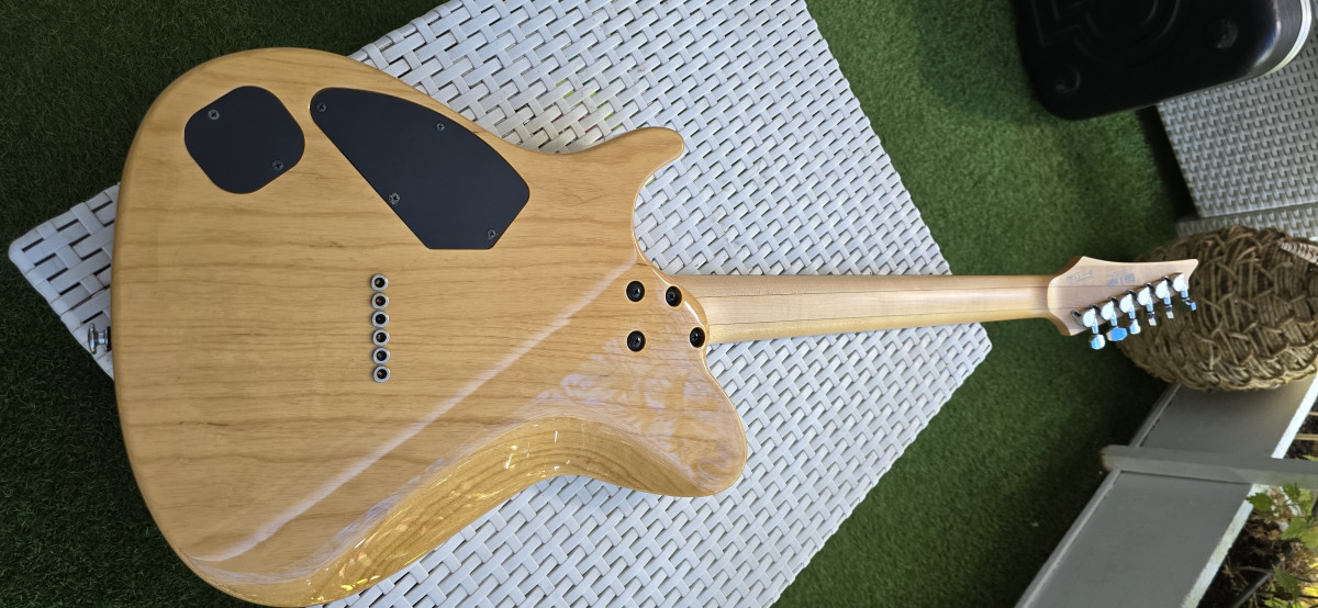 Cuenta con un cuerpo de fresno, mástil de arce y nogal, diapasón de palisandro de 24 trastes, y pastillas humbucking Ibanez Calm Crusher.