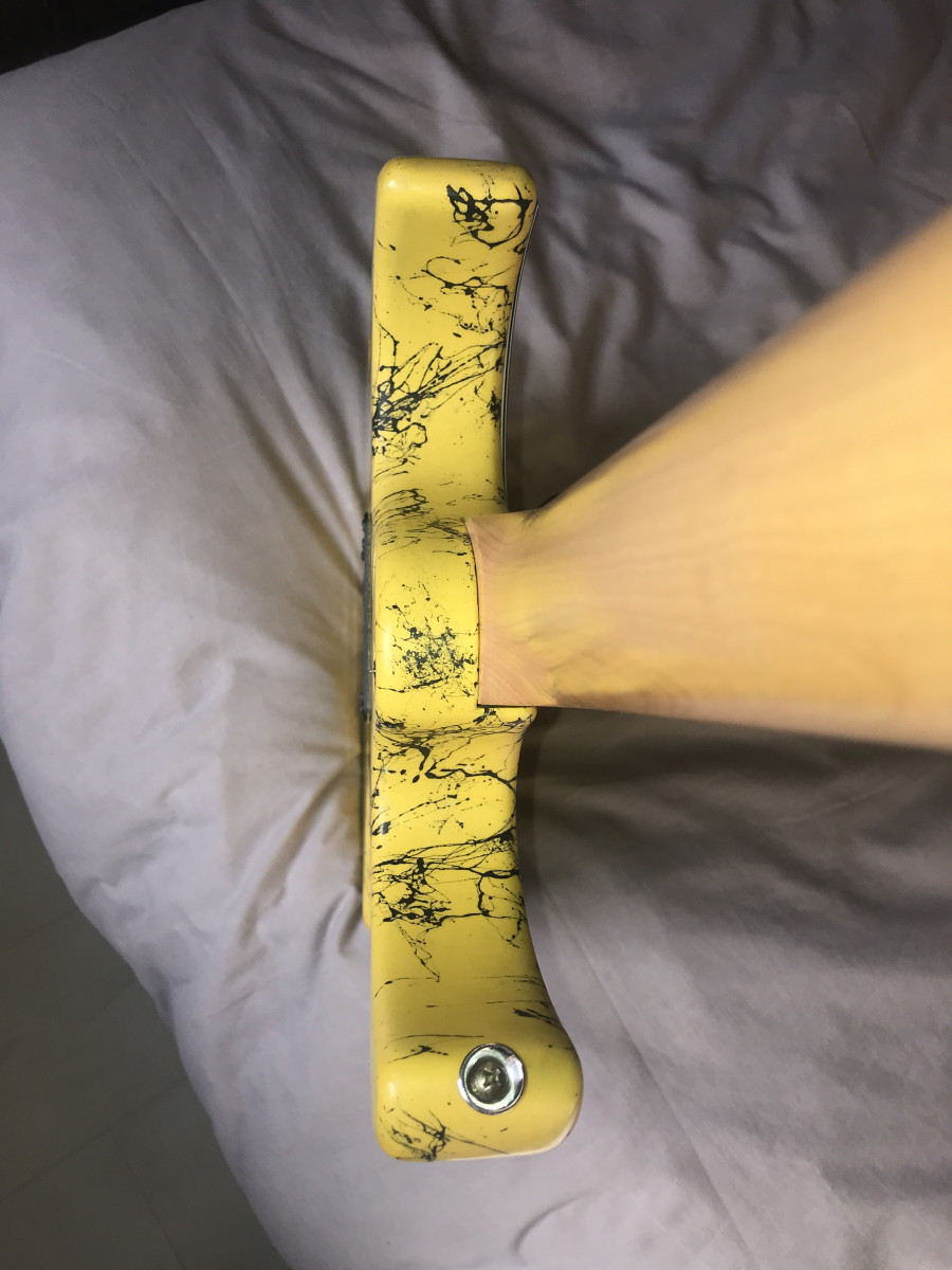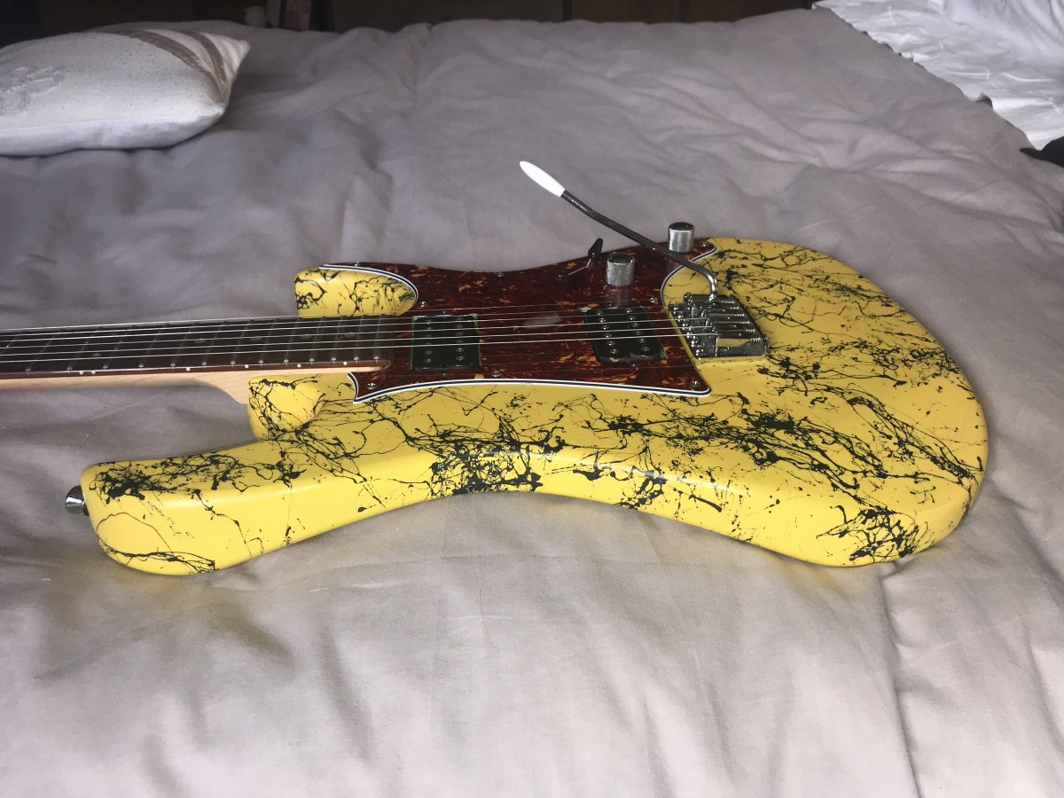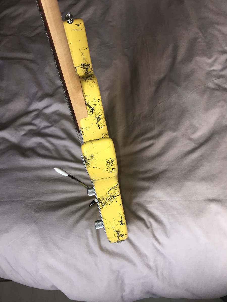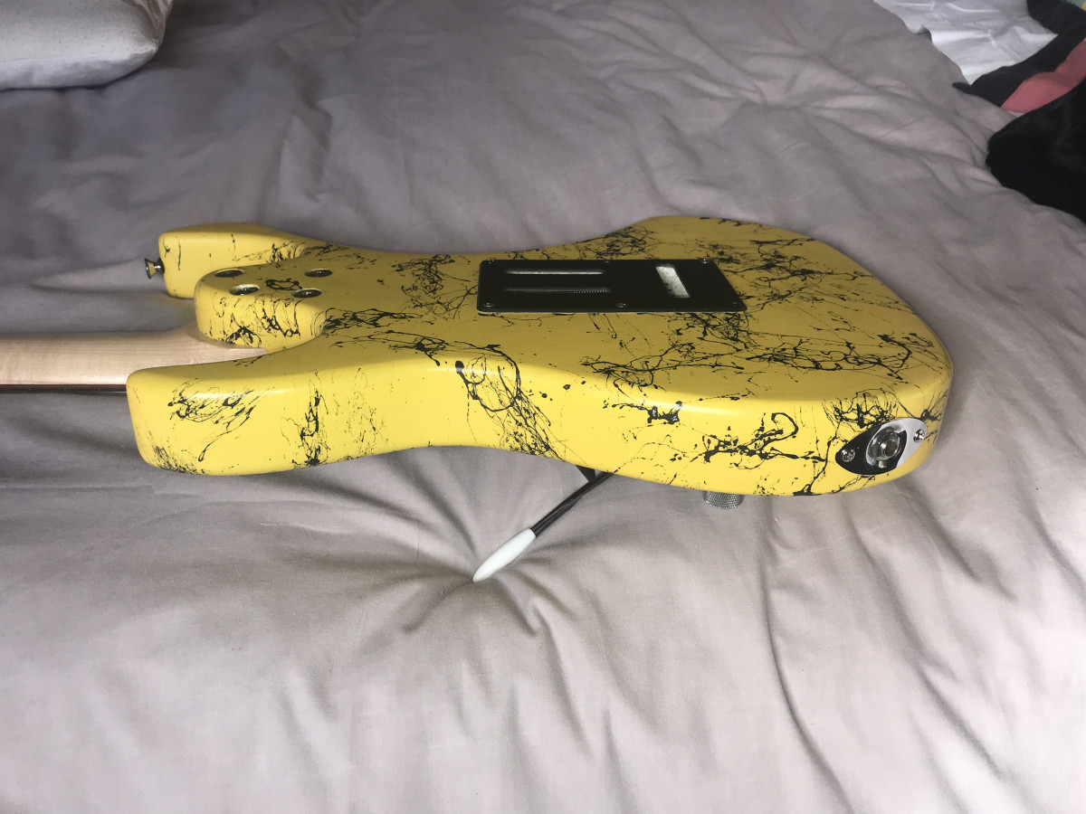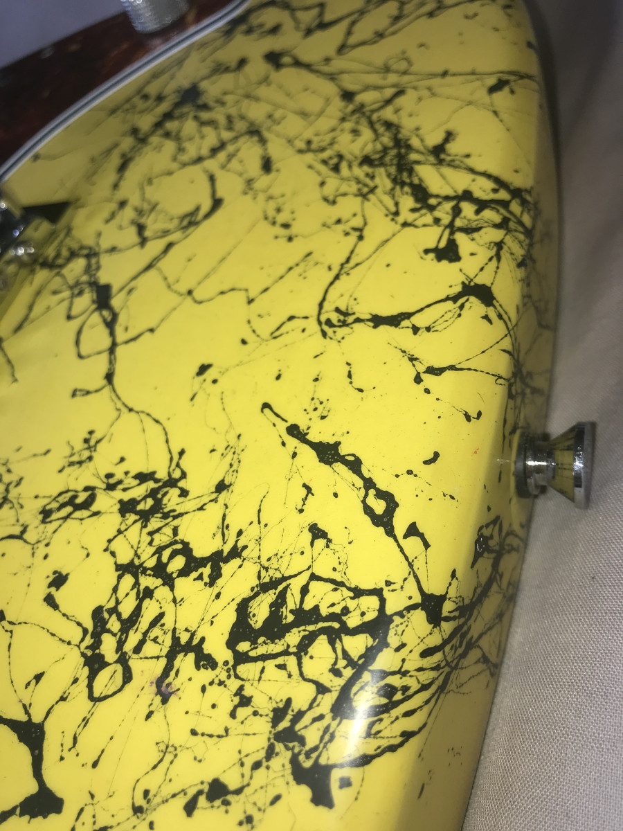 Ibanez GIO pintada a mano en amarillo con salpicaduras negras y barnizada al agua Nitorlack. Totalmente nivelada y pulida hasta lograr un acabado satinado suave.