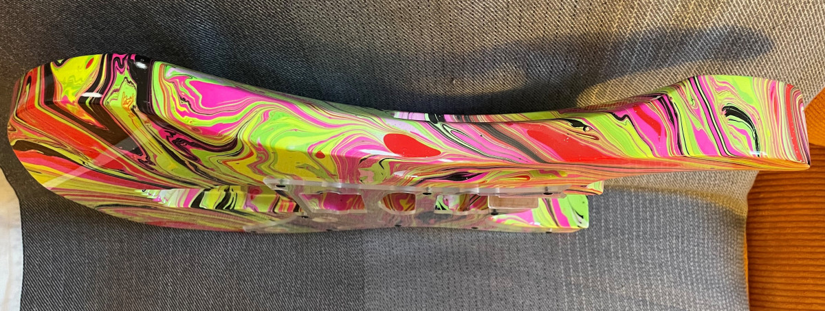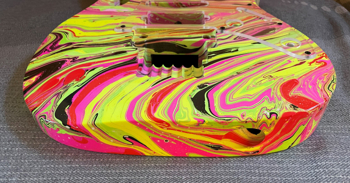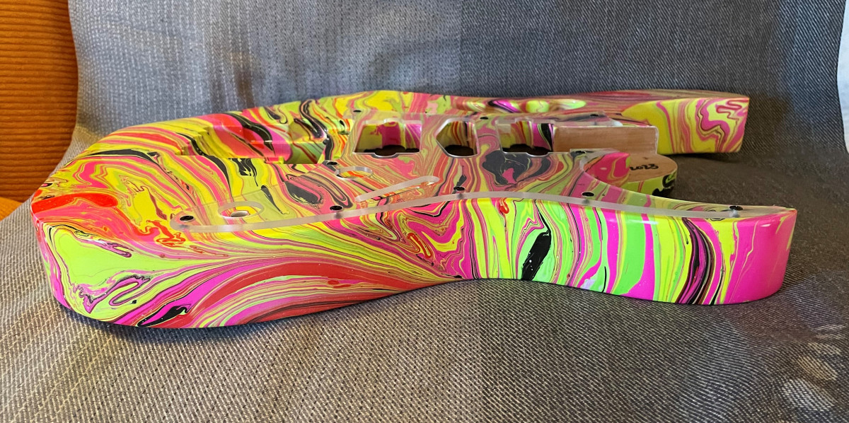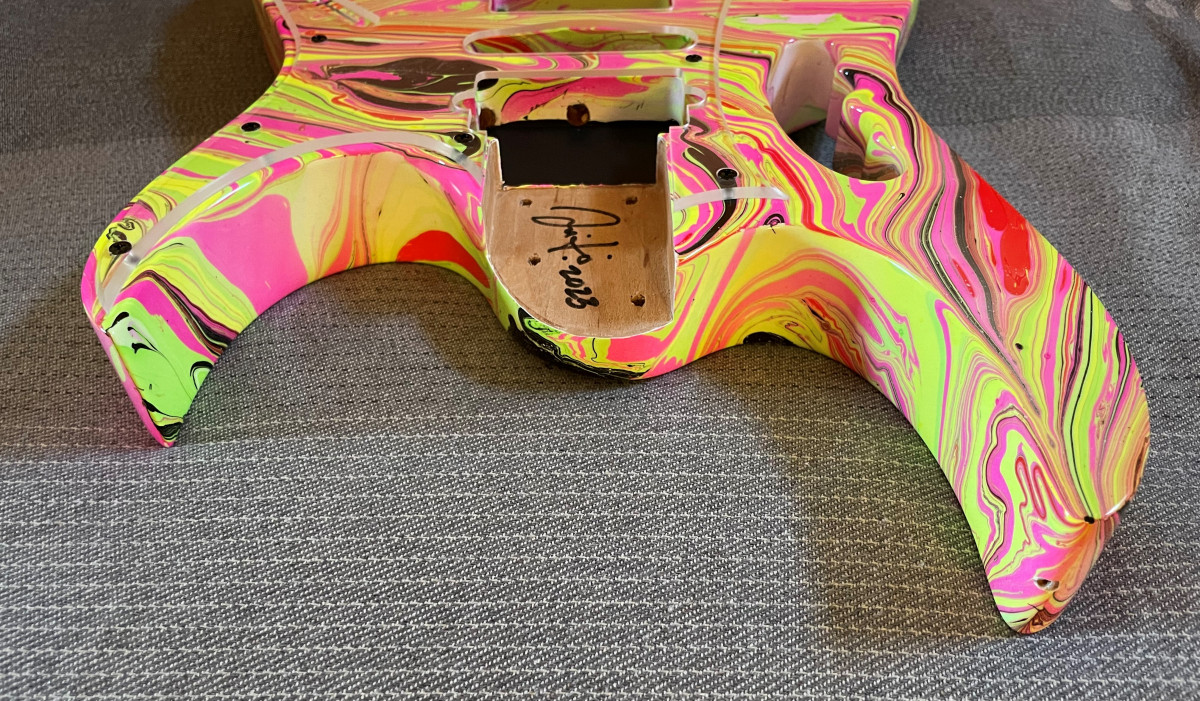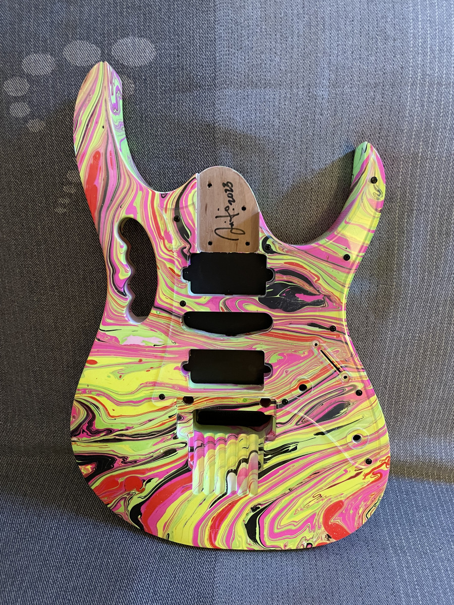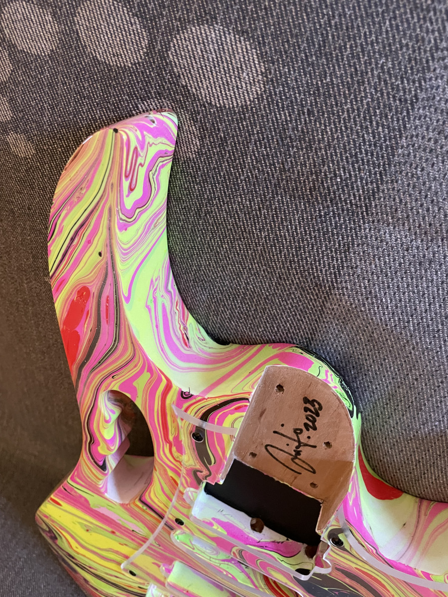 Multi Color Swirl DNA, clear coat done. Steve kindly signed the body before the clear coat. So the signature is there forever! Black back covers included with the body.
