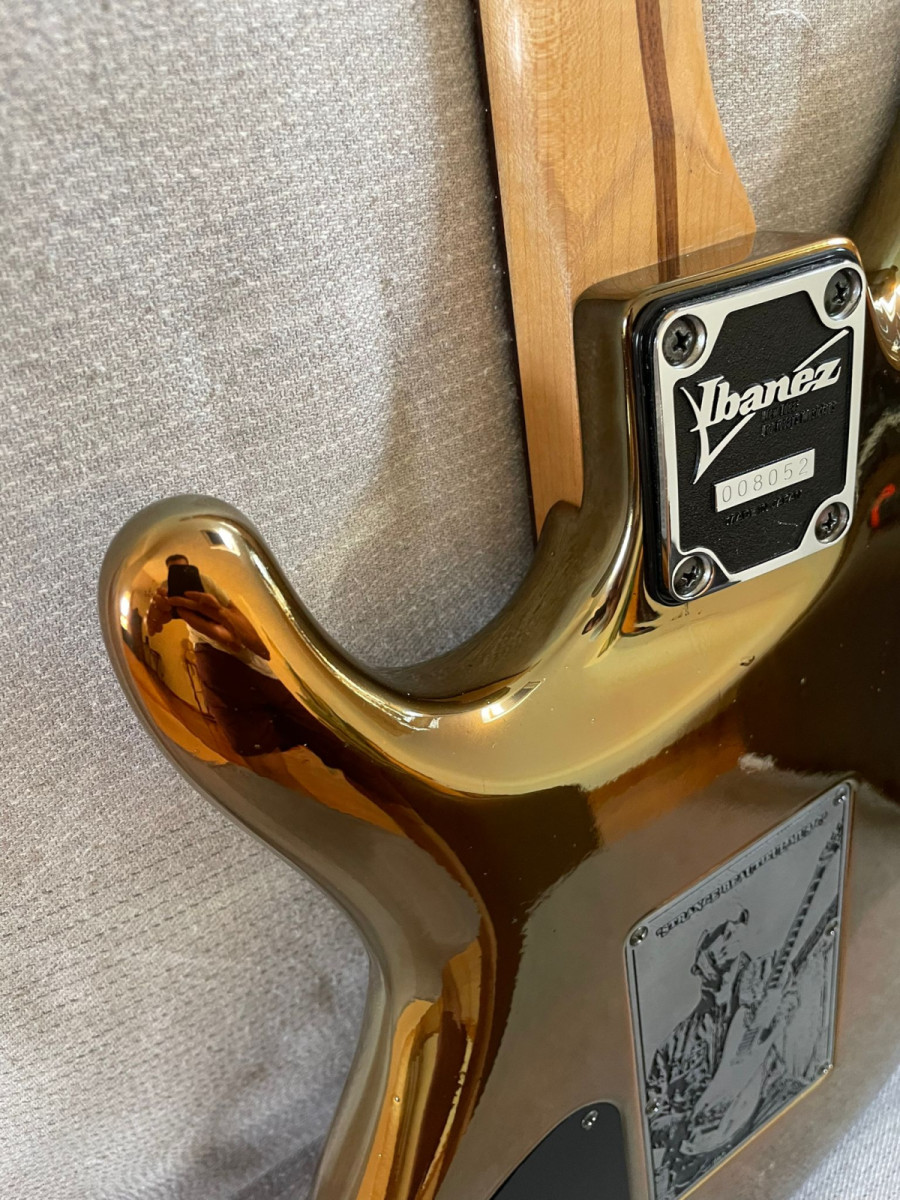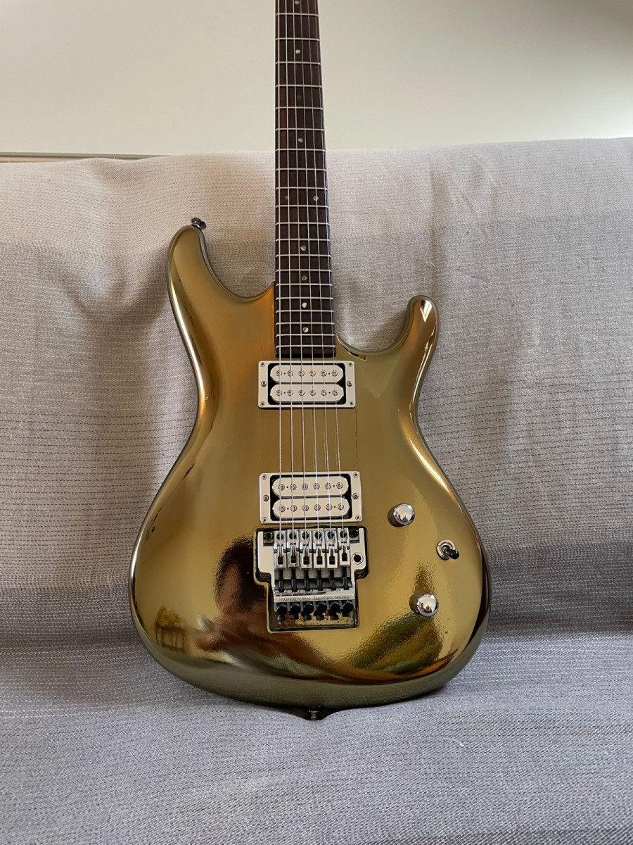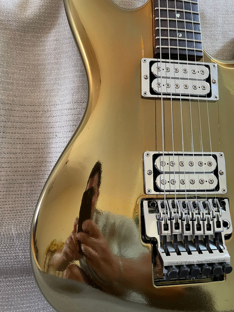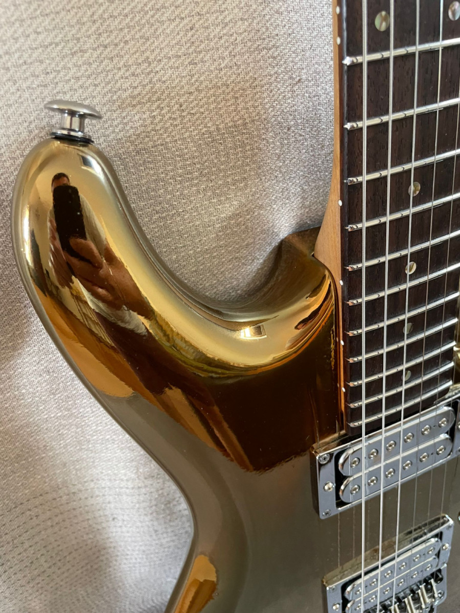 Ibanez JS1000 modificada. Esta pintada dorado con acabado cromado (efecto espejo), la pintura tiene algunas imperfecciones que se ven en ls fotos. Inspirada en la JS2CH. Es única no existe otra igual.