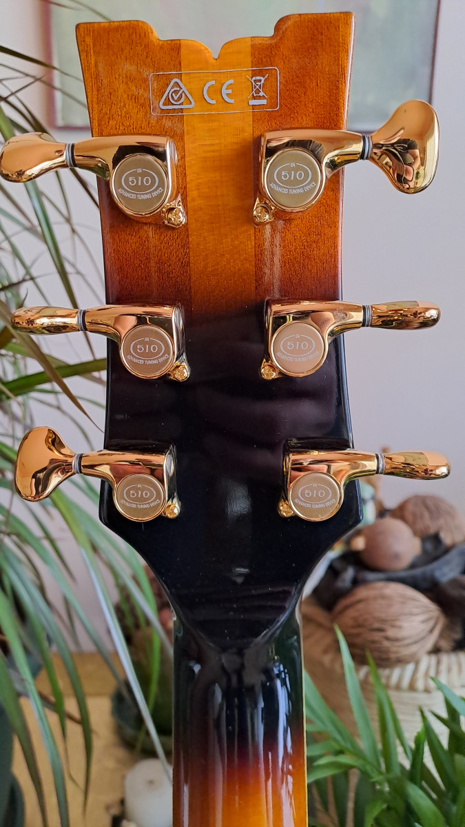 De trastes está prácticamente impoluta y estéticamente está prácticamente perfecta. Sólo un ligero desgaste aunque muy uniforme en el dorado de la cubierta de las pastillas. En cualquier caso, sólo son pequeñas imperfecciones que apenas se perciben a simple vista. Nada que no sea normal en una guitarra tratada con mucho cuidado y que, según el Guitar Date Project ha salido de la fábrica de Samick en Korea en diciembre de 2017 (aunque en la etiqueta pone Made in China).