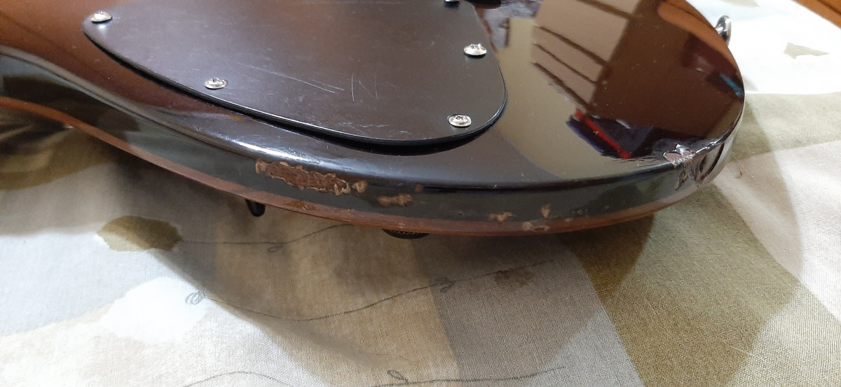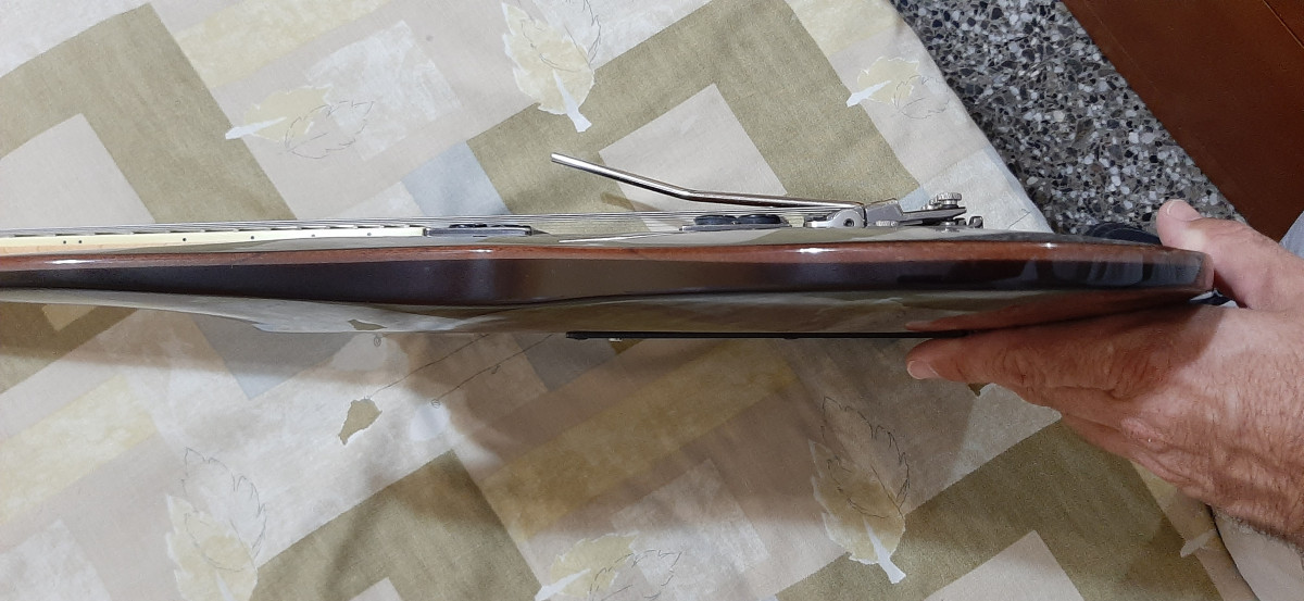 Puente super estable, la guitarra solo tiene unas marcas de barniz saltado en un lateral que su antiguo dueño le hizo con un soporte poco adecuado, exceptuando éso la guitarra se encuentra en un estado excepcional.